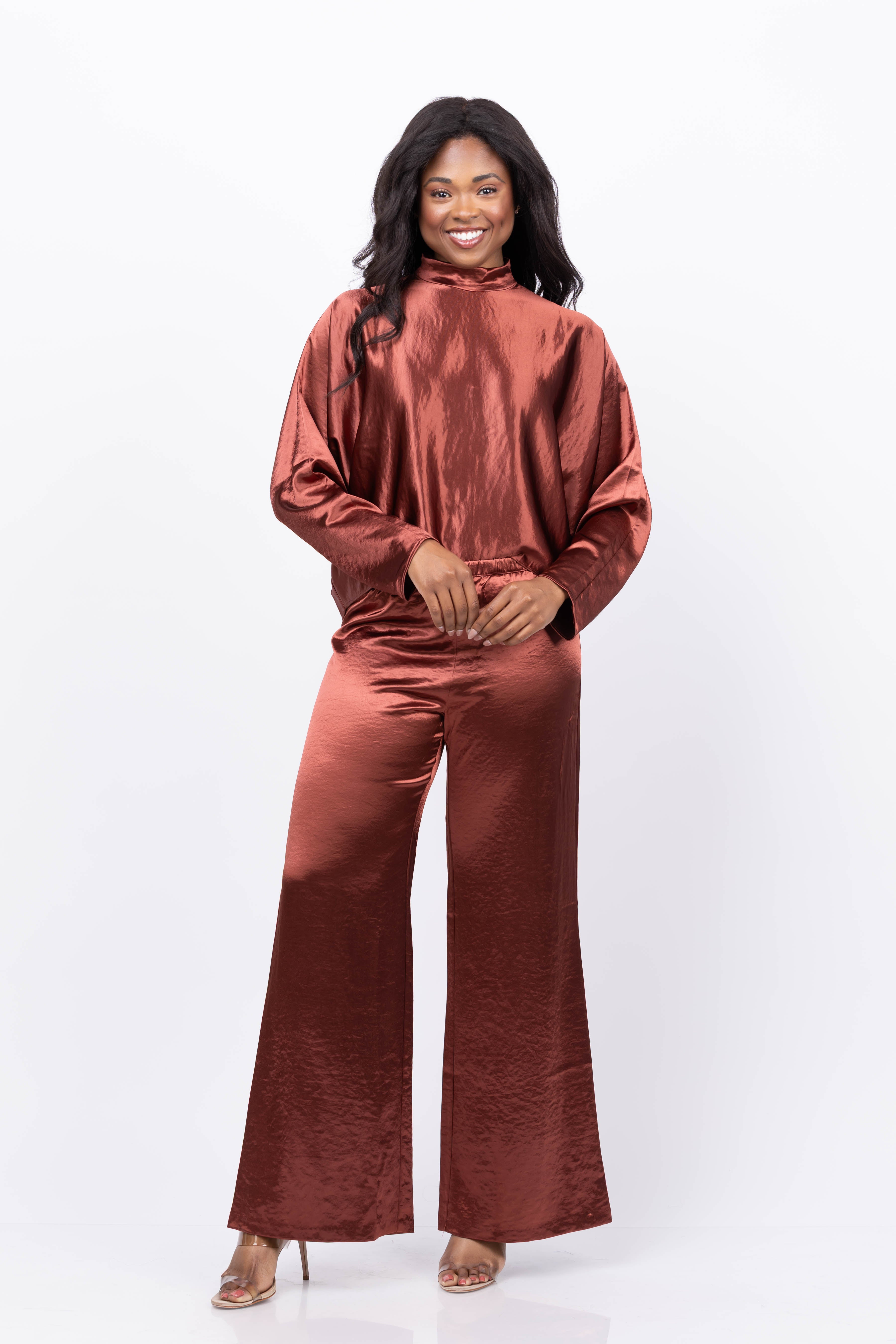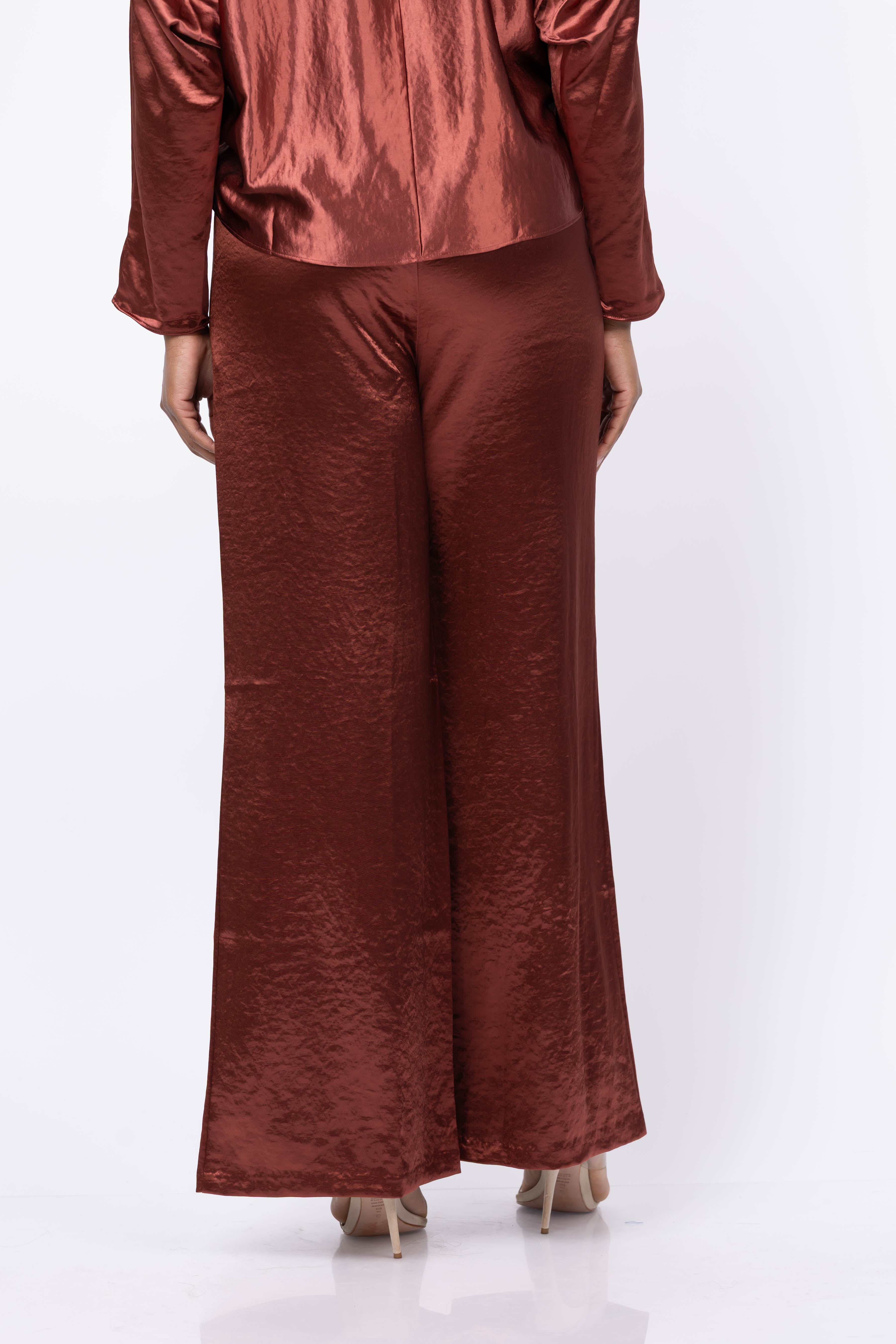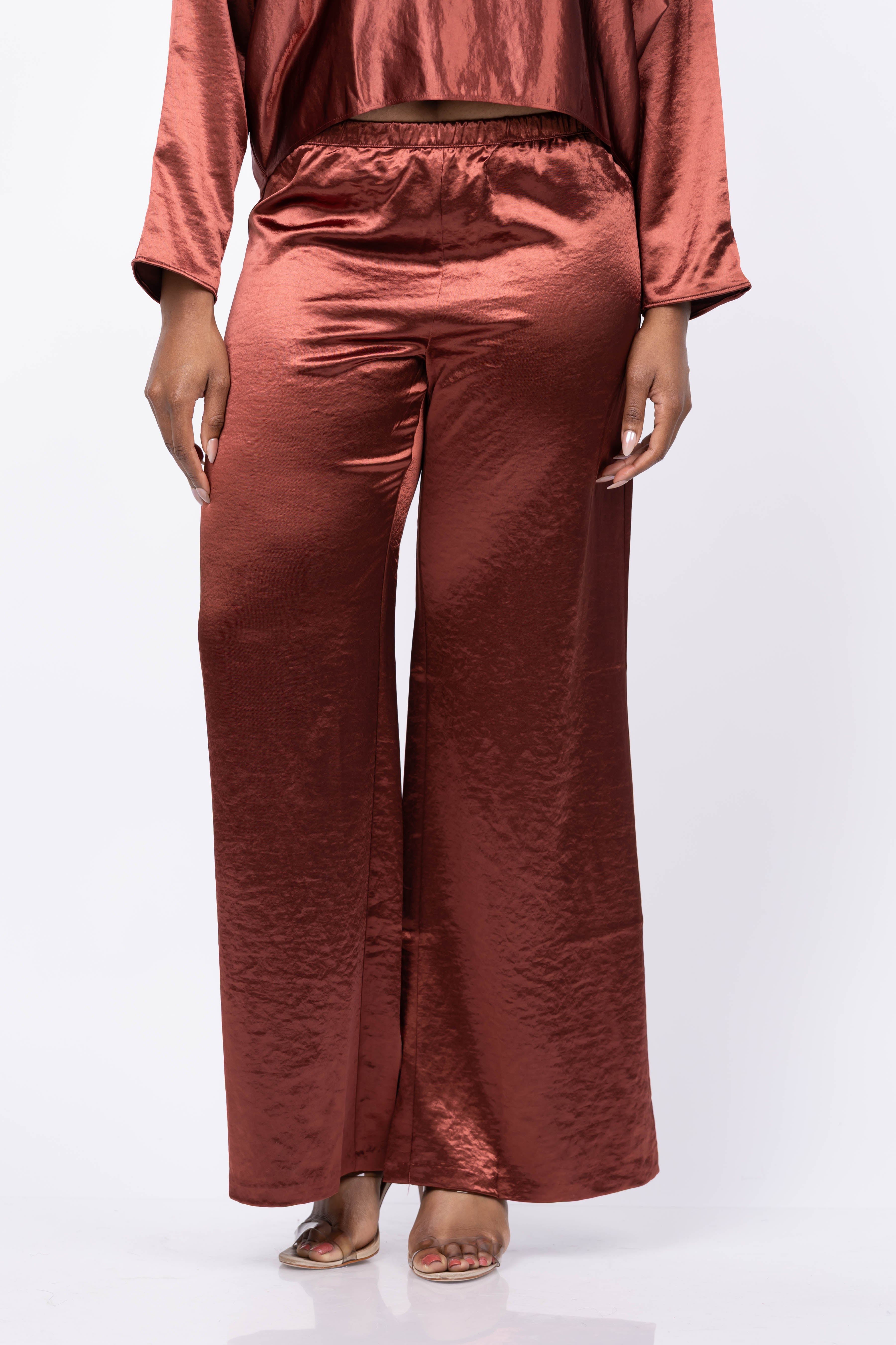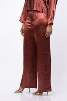 Experience effortless elegance with the Amanda Uprichard Mariko Pants in Russet. Made from luxurious hammered silk, these wide-leg pants combine comfort and style for a refined look. Ideal for city outings, dinner parties, or rooftop bars, they pair perfectly with the Mariko Top to create a polished, chic ensemble that stands out. Elevate your wardrobe with these versatile pants designed to bring sophistication to any occasion.