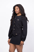 The Amanda Uprichard Nina Jacket in Black offers a timeless vintage silhouette enhanced by striking gold buttons, creating a bold yet refined statement. This jacket combines classic style with modern confidence, making it a versatile piece that elevates any outfit. Perfect on its own or paired with the Nina Skirt, it delivers a cohesive, polished look that’s sure to turn heads.