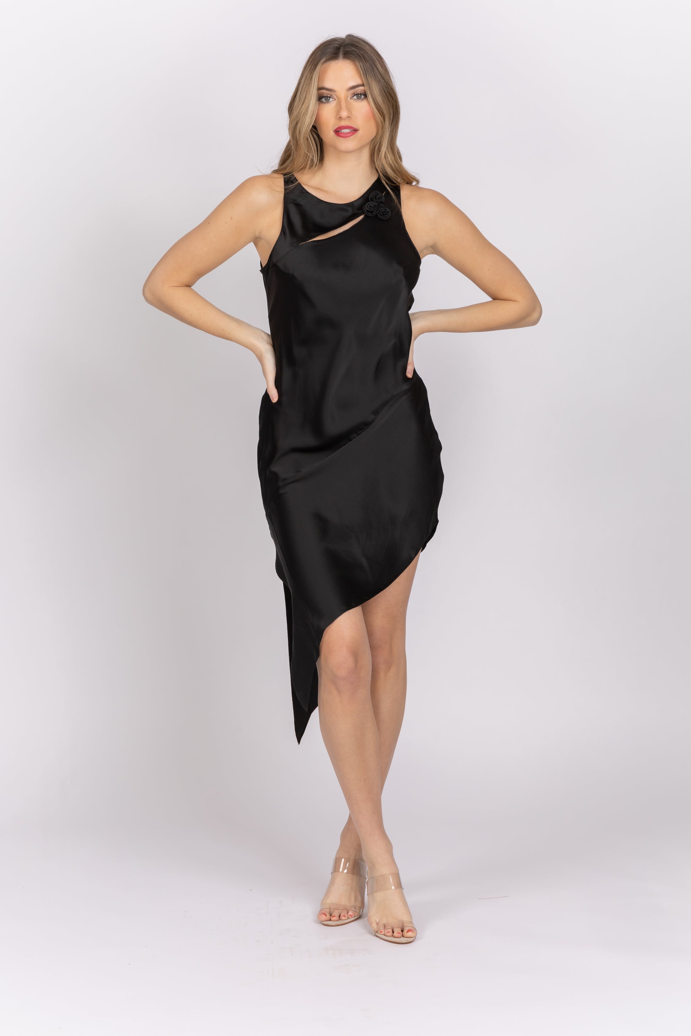 A soft dress sporting a sharp design, this silk midi features a small cutout at the bust and a dramatic asymmetric hem.