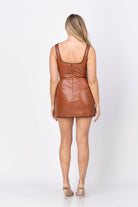 Elevate your style with the Amanda Uprichard Ginger Skort Romper in Chestnut. This black leather piece, detailed with striking white stitching, perfectly blends boldness and playfulness in a chic mini silhouette. Ideal for a confident, standout look, it pairs effortlessly with black strappy heels and a white leather purse, making it your go-to for an unforgettable girls’ night out.