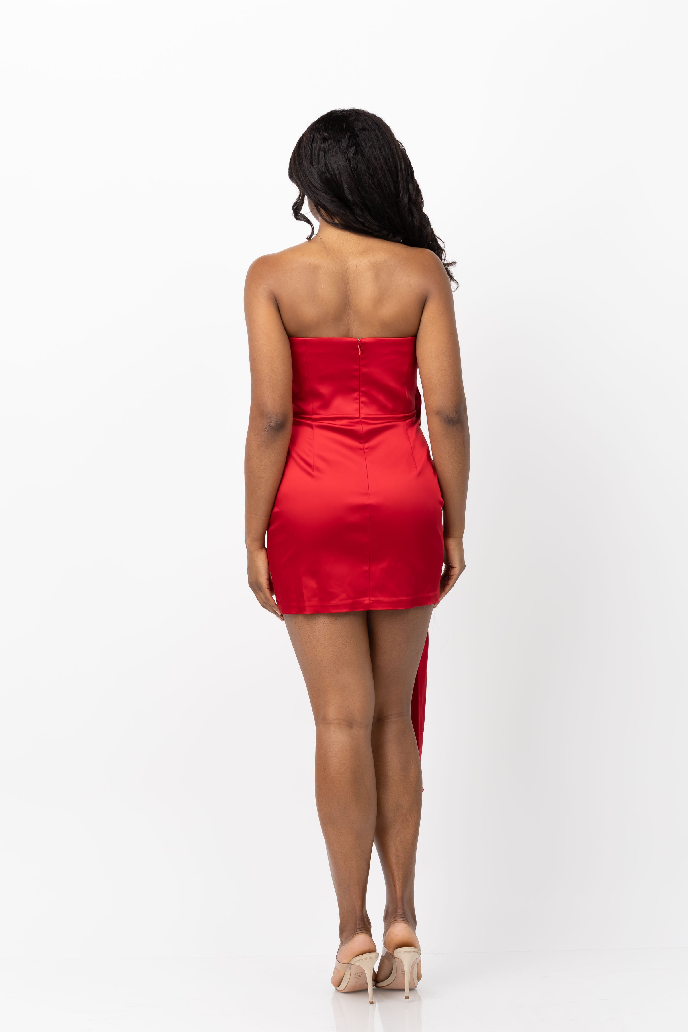 Introducing the Amanda Uprichard Venice Dress in Ruby. This festive cocktail dress boasts a hidden back zipper closure for a sleek fit and satin fabric with a charming bow accent. Unlined for a effortlessly chic look. Make a statement and turn heads in this stunning dress!