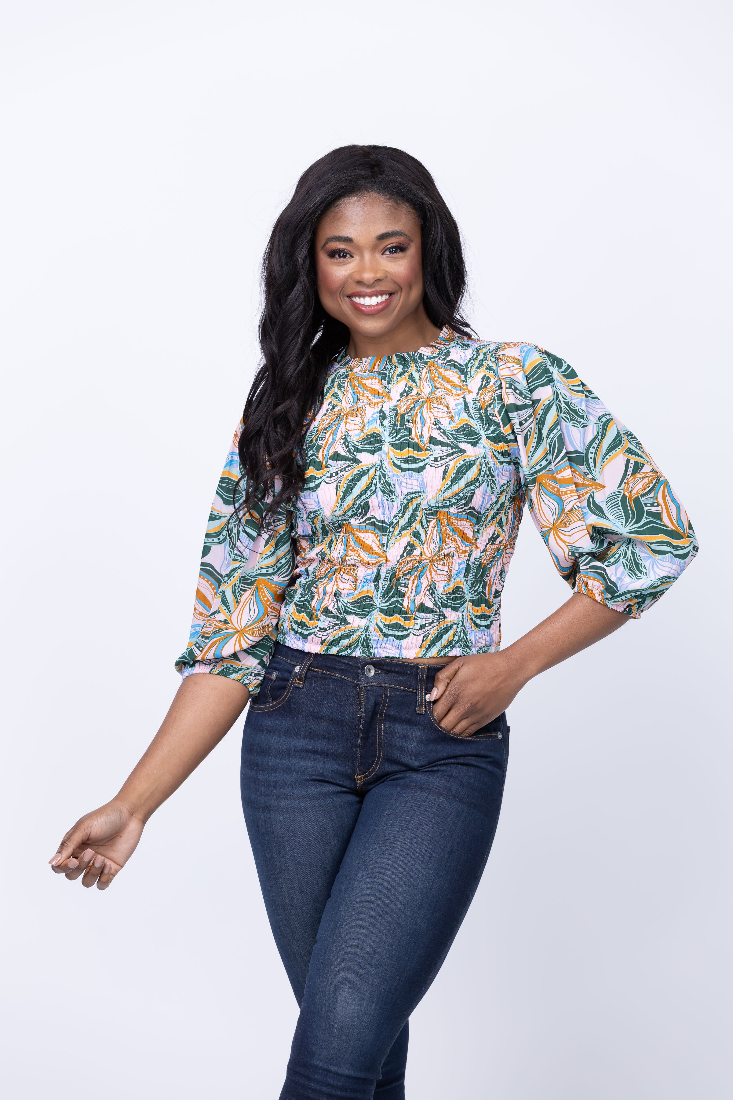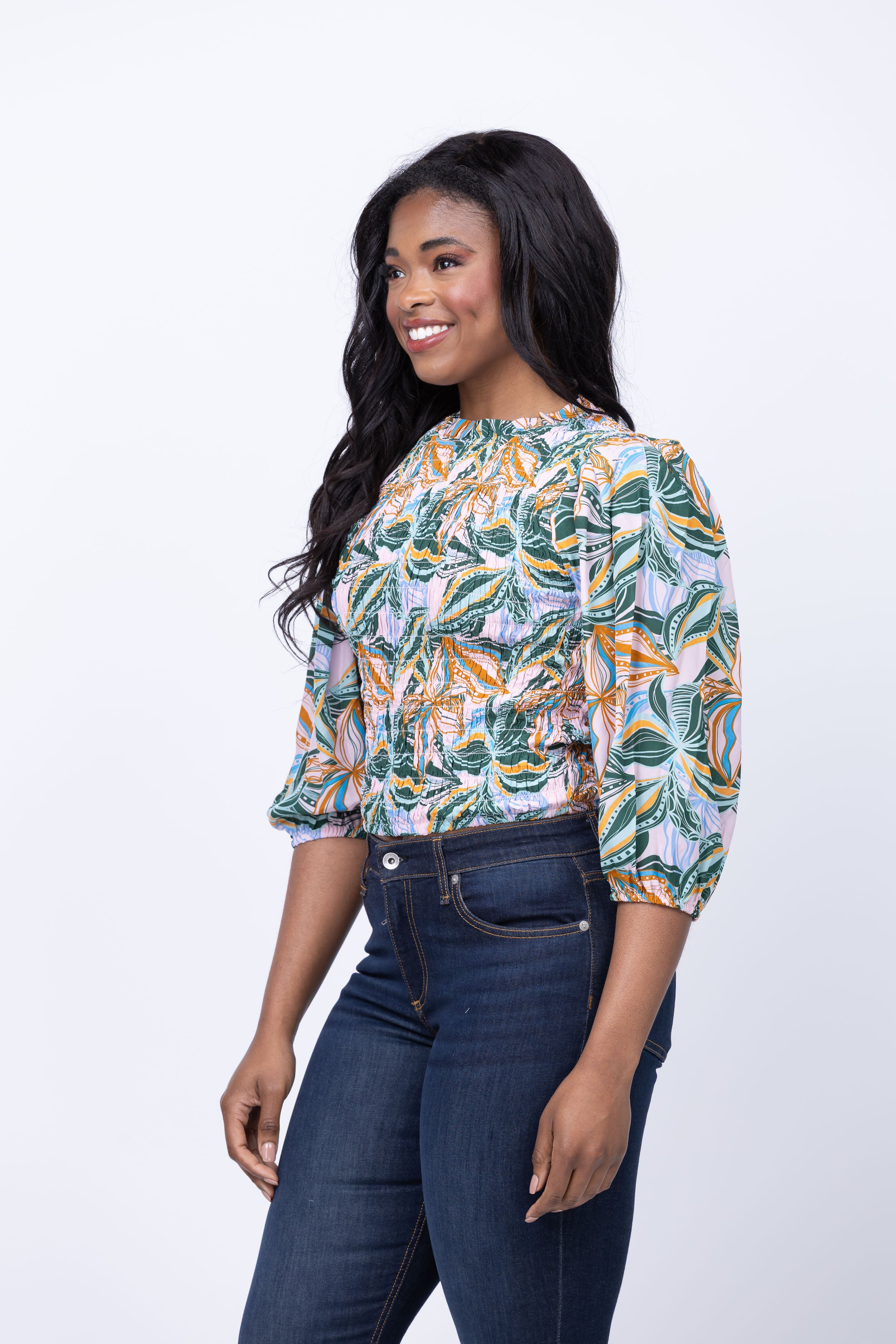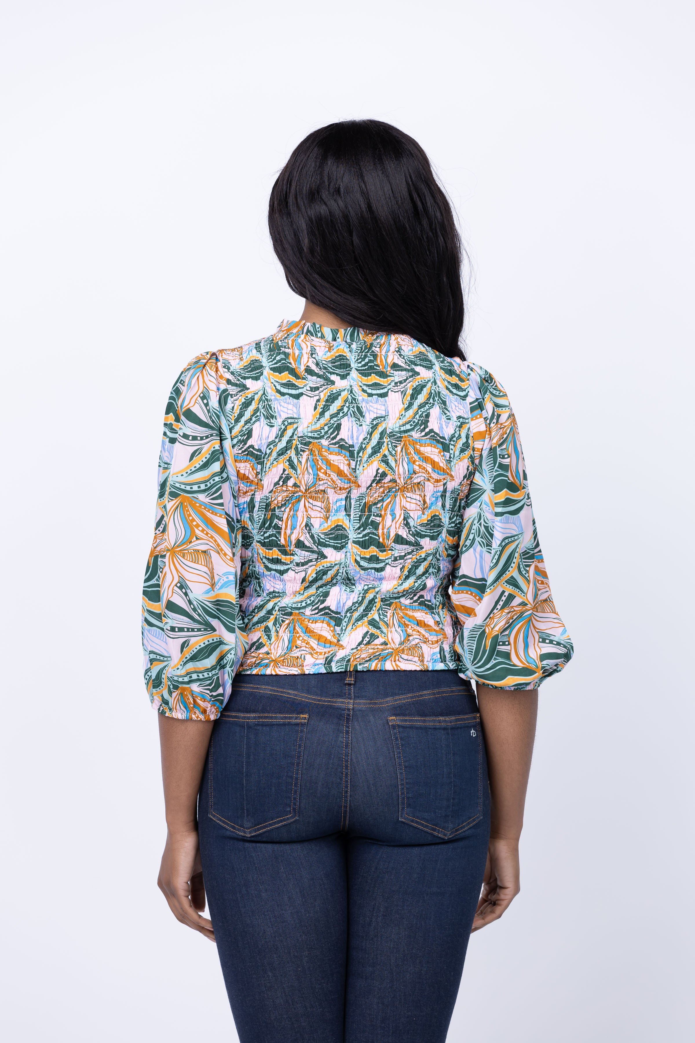 Indulge in the beauty of spring with our Caballero Collection Genie Sea Leaves Top! Made from soft, breathable viscose and adorned with our exclusive print, this top offers both elegance and comfort. The ruched body and bishop-sleeves flatter your figure. Perfect for a chic, seasonal look.