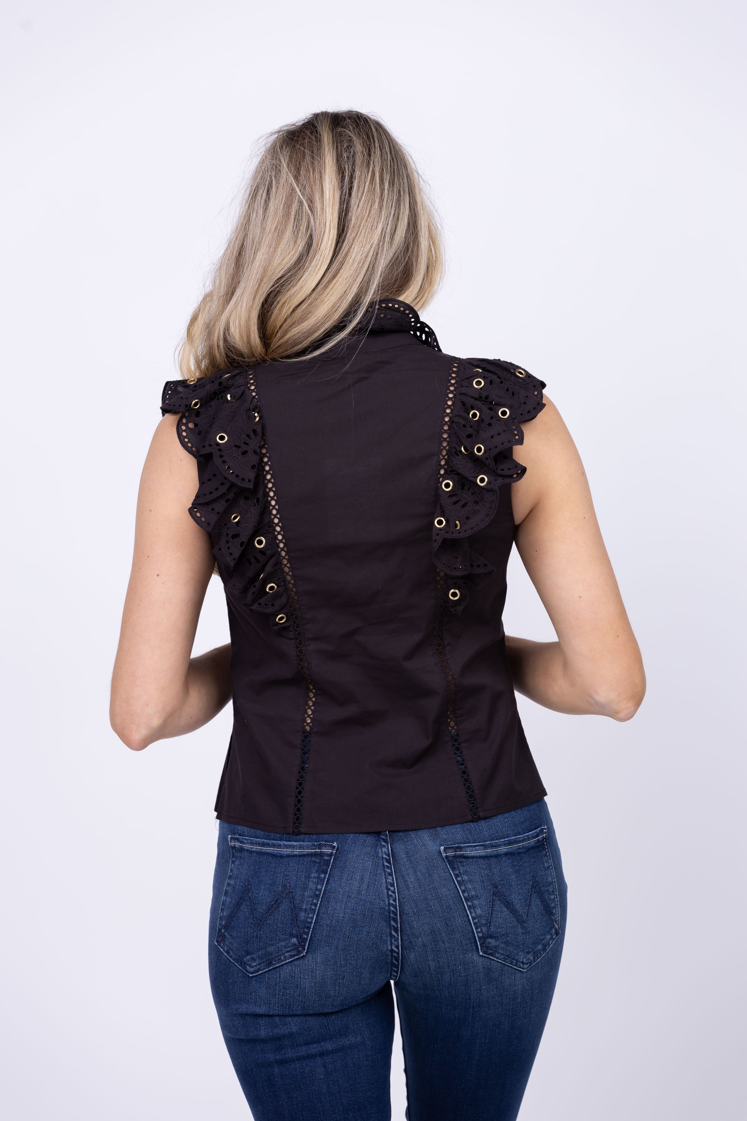Upgrade your every day wardrobe with the Christy Lynn Tania Top in Black. This lightweight cotton top features intricate embroidery and gold grommets, along with ruffles at the shoulders and 4 hole gold buttons for a touch of elegance. Effortlessly elevate any look with this versatile and stylish top.