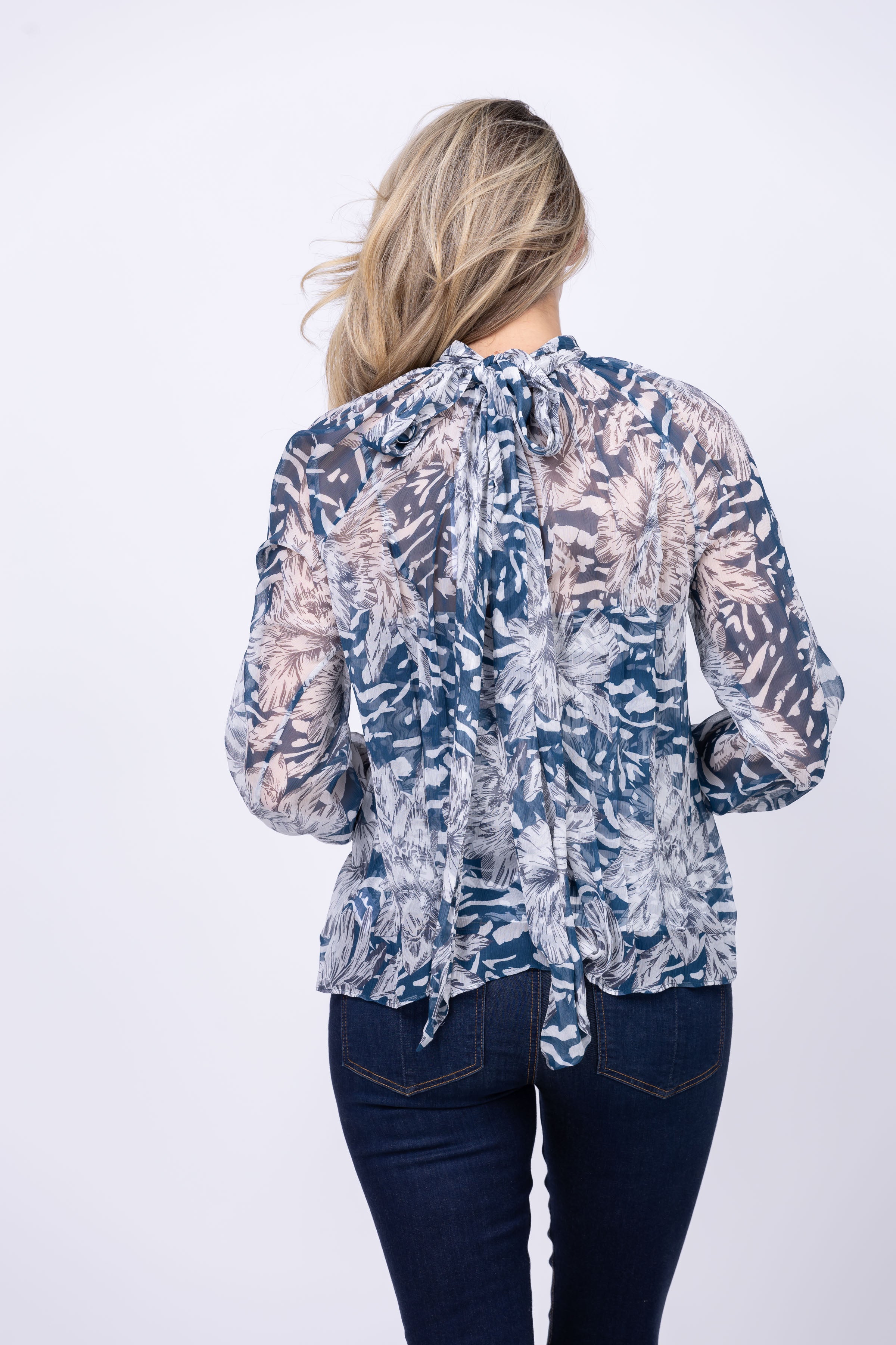 Elevate your wardrobe with the Christy Lynn Teagan Blouse in Navy Lotus. This versatile piece features a gathered neck for added volume and a neck sash for timeless grace. The self covered button and elastic sleeve cuffs add a polished touch, while the matching stretch cami offers comfort and style. Experience the perfect blend of romance and sophistication with this must-have blouse.