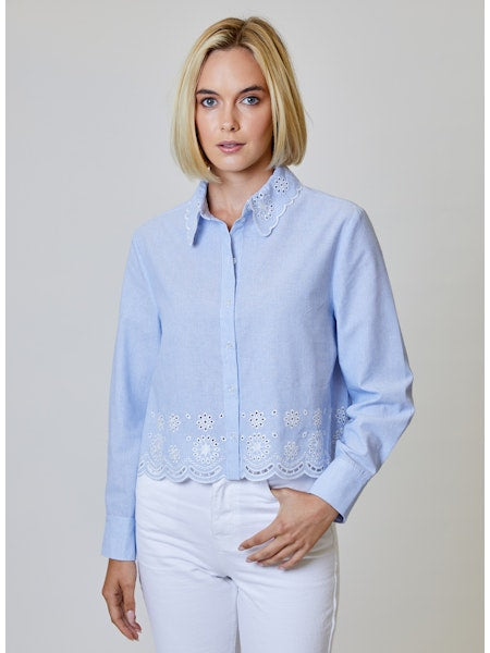 Introducing the perfect addition to your summer wardrobe - the Design History Button Up Embroidered Shirt in Blue! Made with eyelet fabric and featuring a stylish collar, this light blue shirt is the perfect length to pair with white jeans or shorts. Elevate your style and stay cool in this must-have piece!