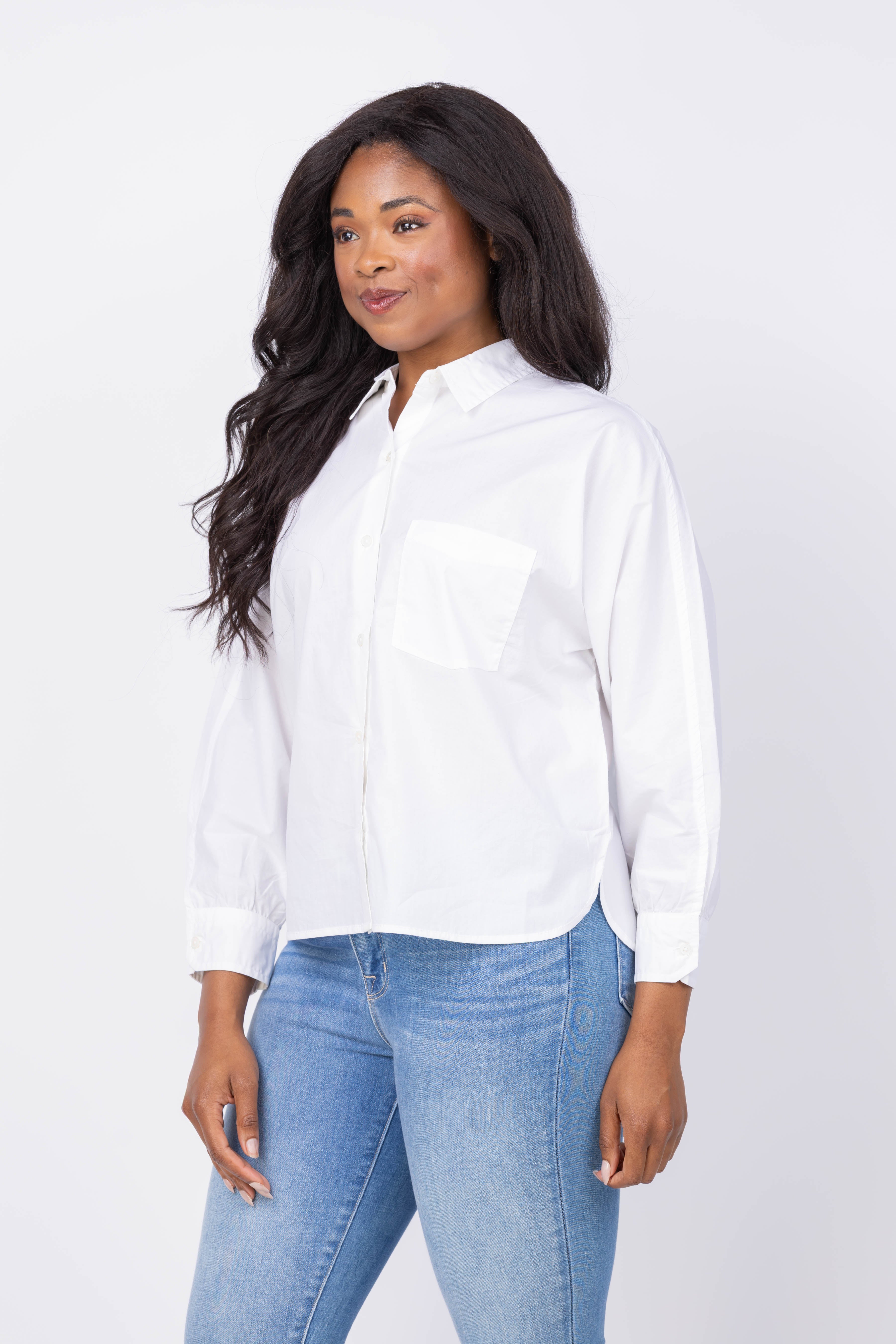 The Lilla P Dolman Sleeve Button Down Shirt in White offers a fresh take on classic style with its oversized fit and crisp poplin fabric. Featuring low armholes and a shorter sleeve length, this collared shirt provides a modern silhouette that pairs effortlessly with denim when half-tucked. Its polished yet relaxed design makes it a versatile wardrobe staple, perfect for elevating your look with minimal effort season after season.