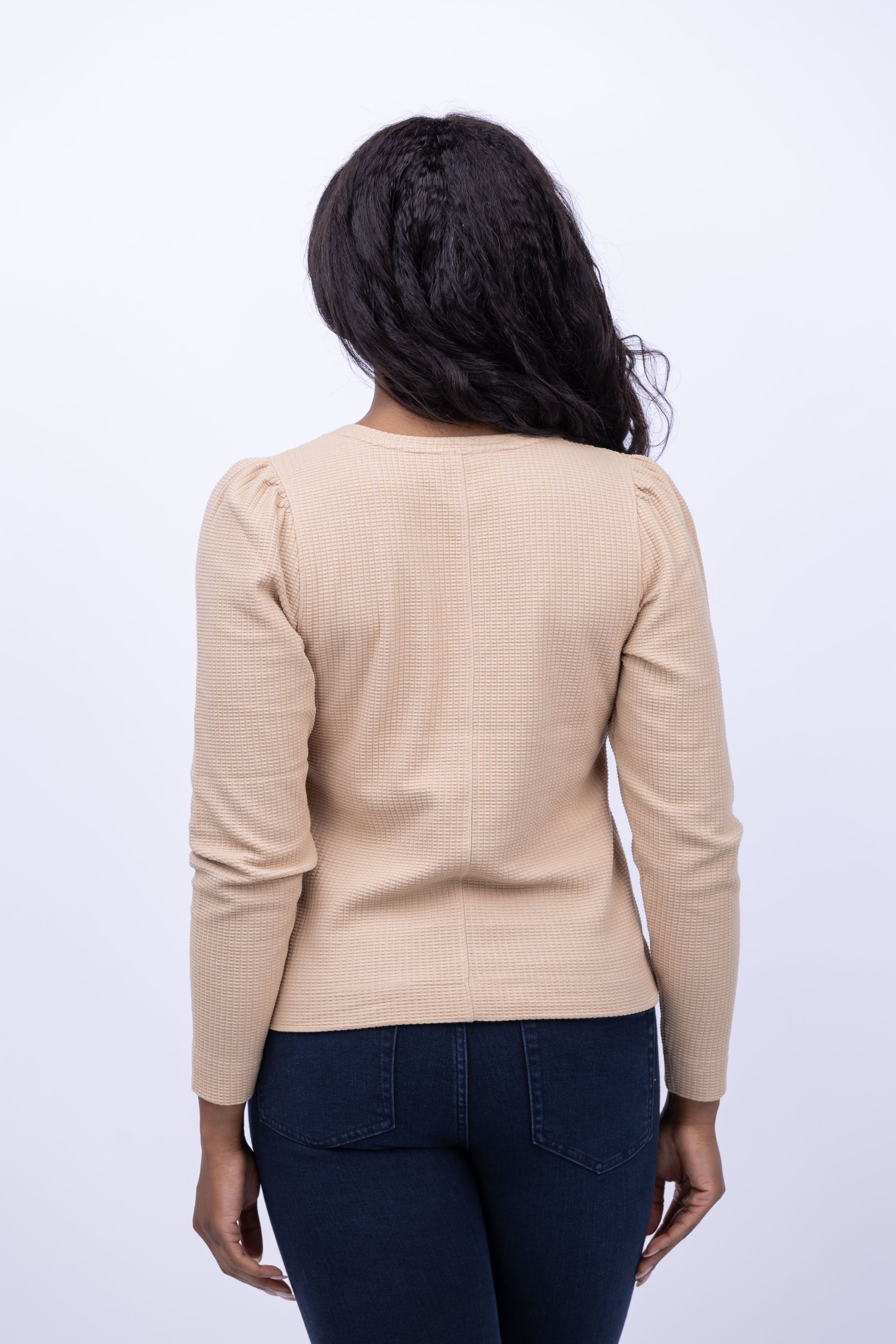 Lilla P Puff Sleeve Waffle V-Neck Top in Stucco