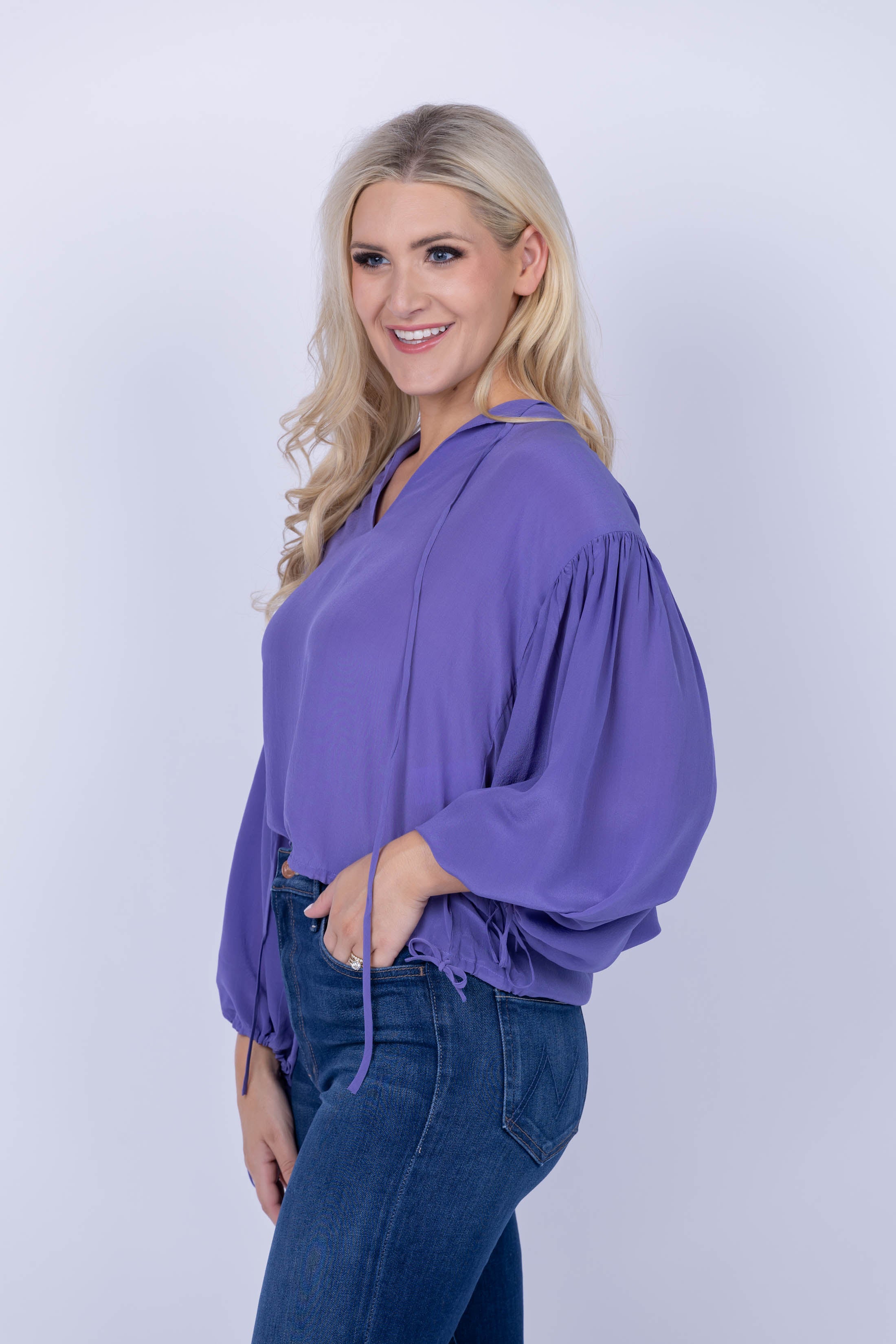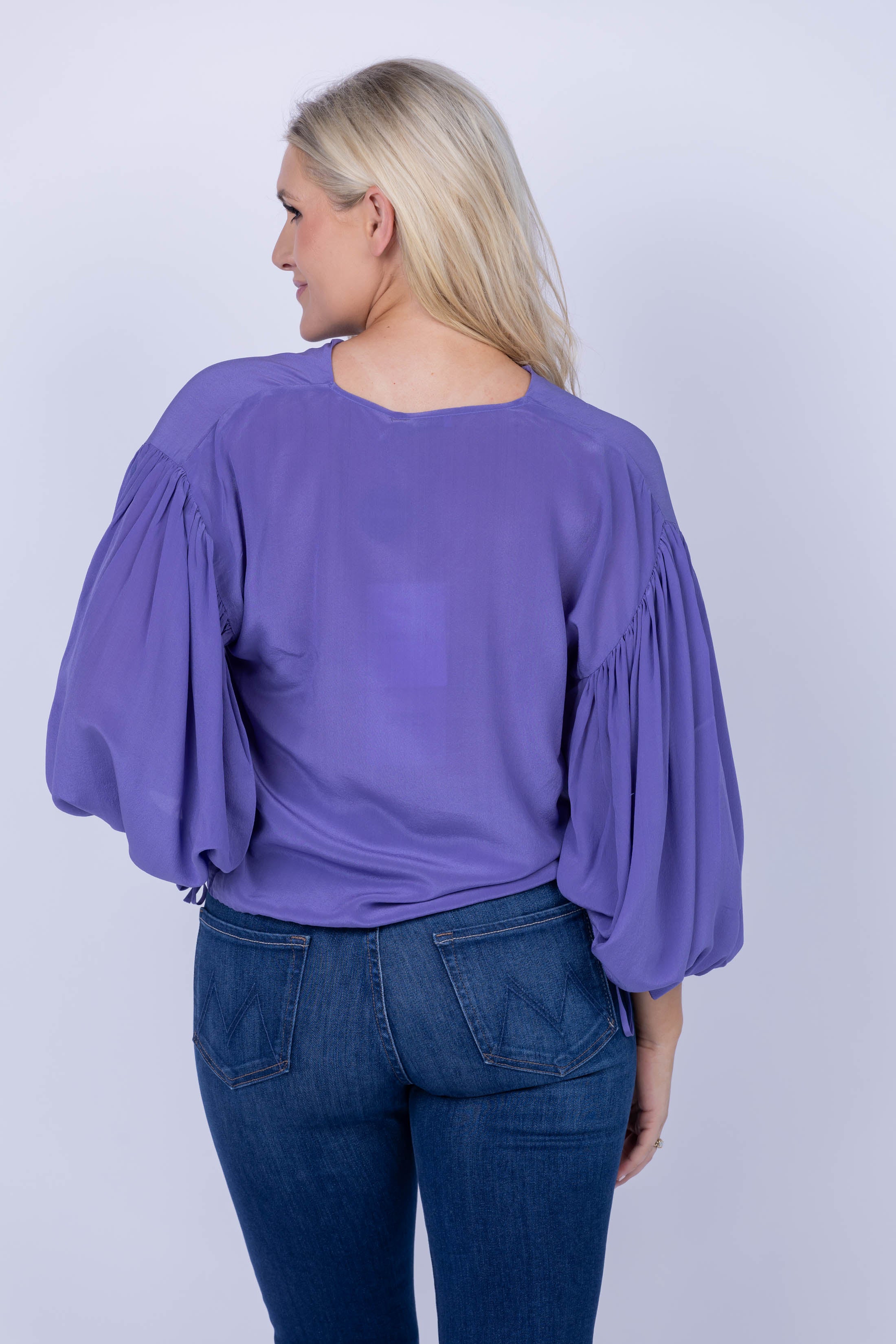 Feel confident and stylish in the Maria Cher Cabrera Cocs Blouse. Vibrant violet creates a striking look that is perfect for fall - and the cinched tie sleeves and V-neck add a classic yet unique touch. Crafted from luxurious silk crepe, this top will become your go-to for an effortlessly chic look!