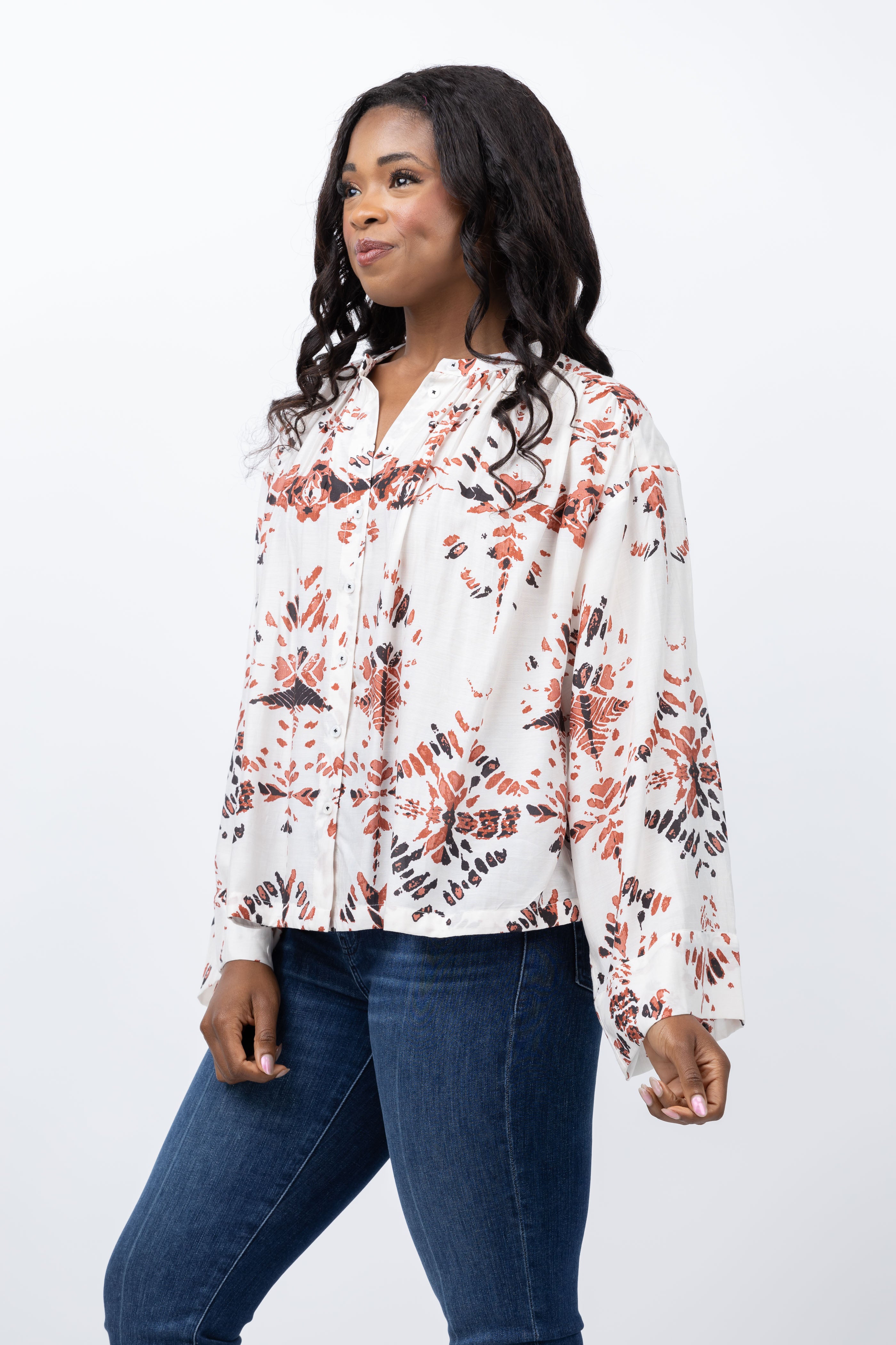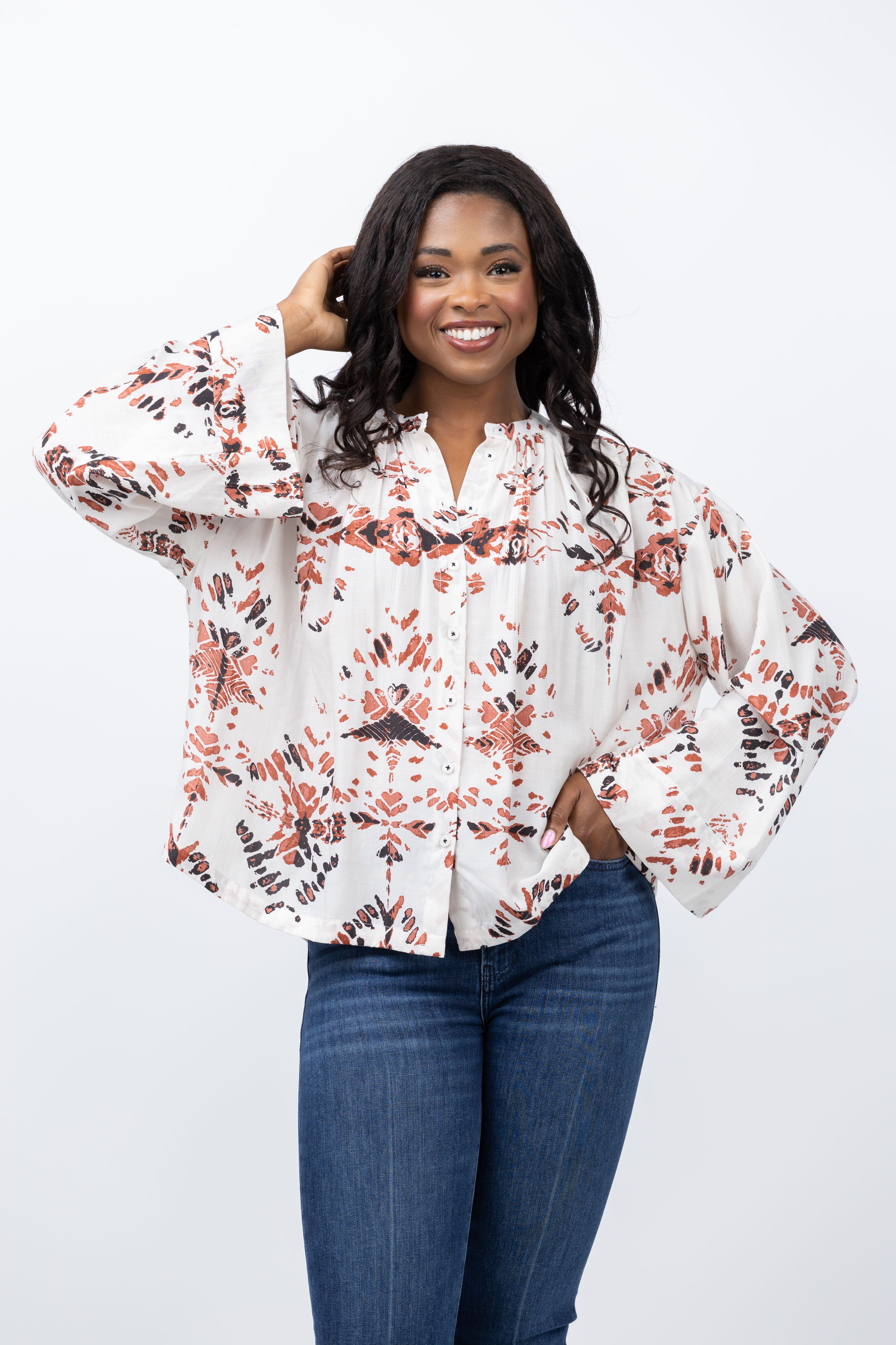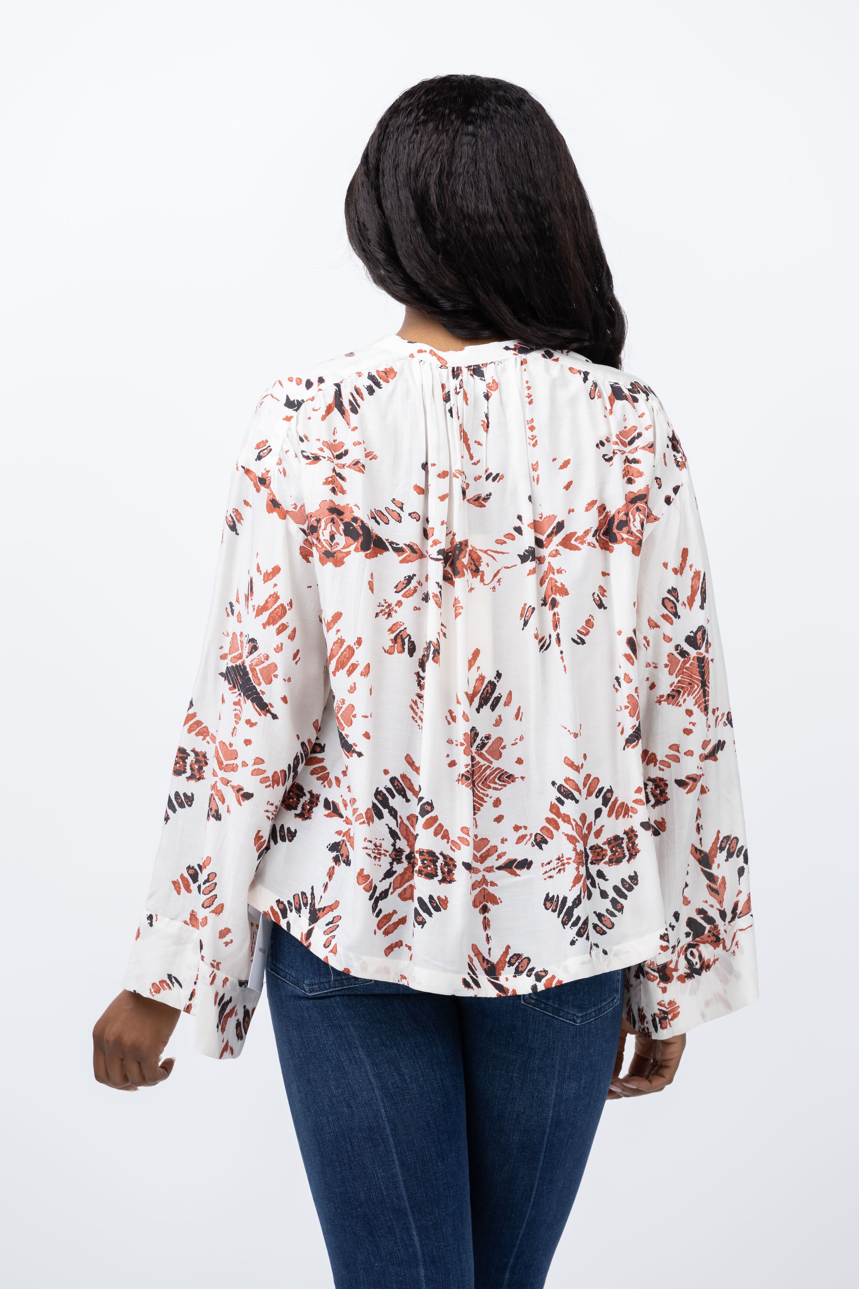 Introducing the Maria Cher Ceibo Nage blouse, the perfect addition to your fall wardrobe. This printed blouse features delicate buttons and a stunning Bordeaux Shibor design. Elevate your style and easily transition into the new season with this must-have piece.