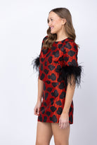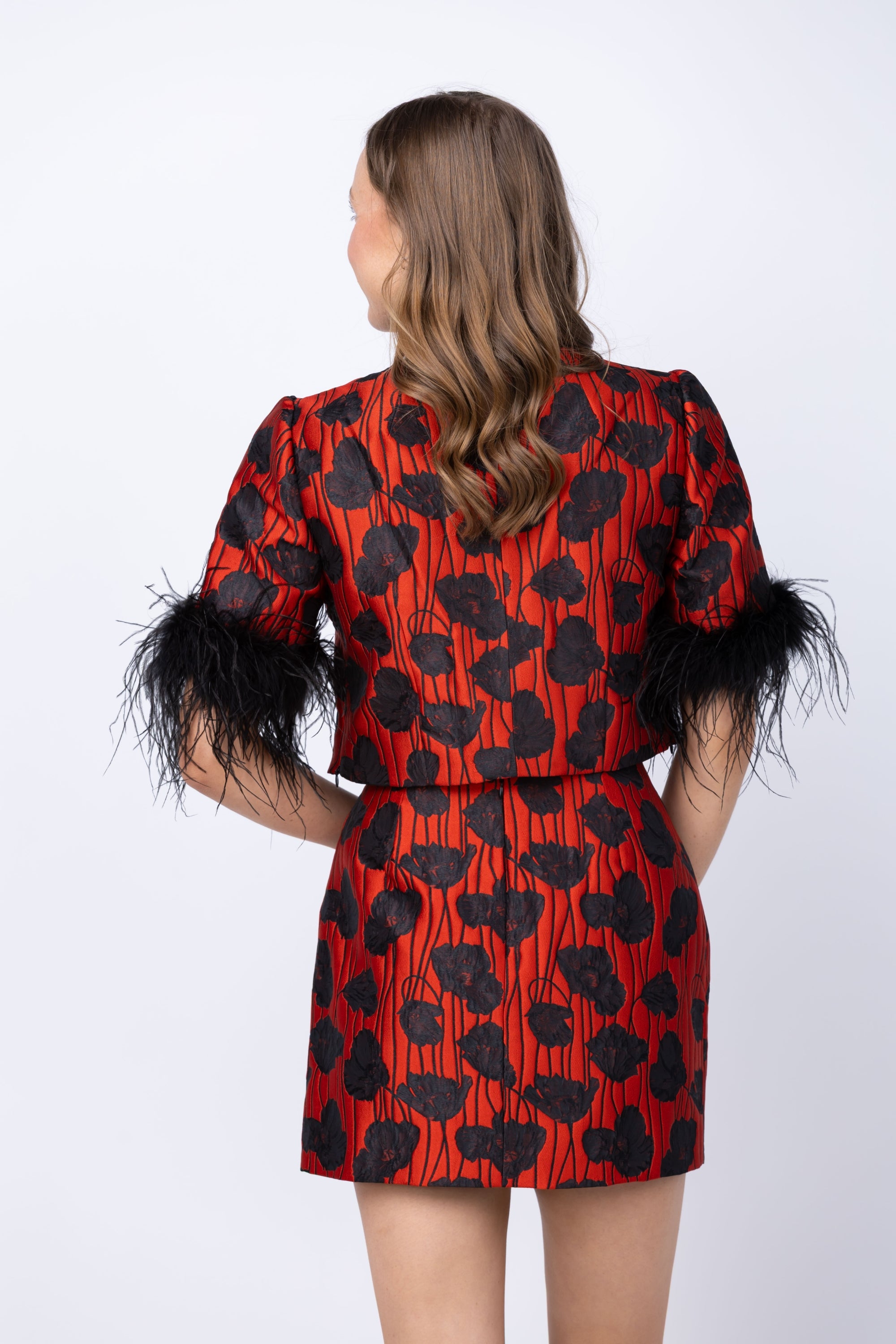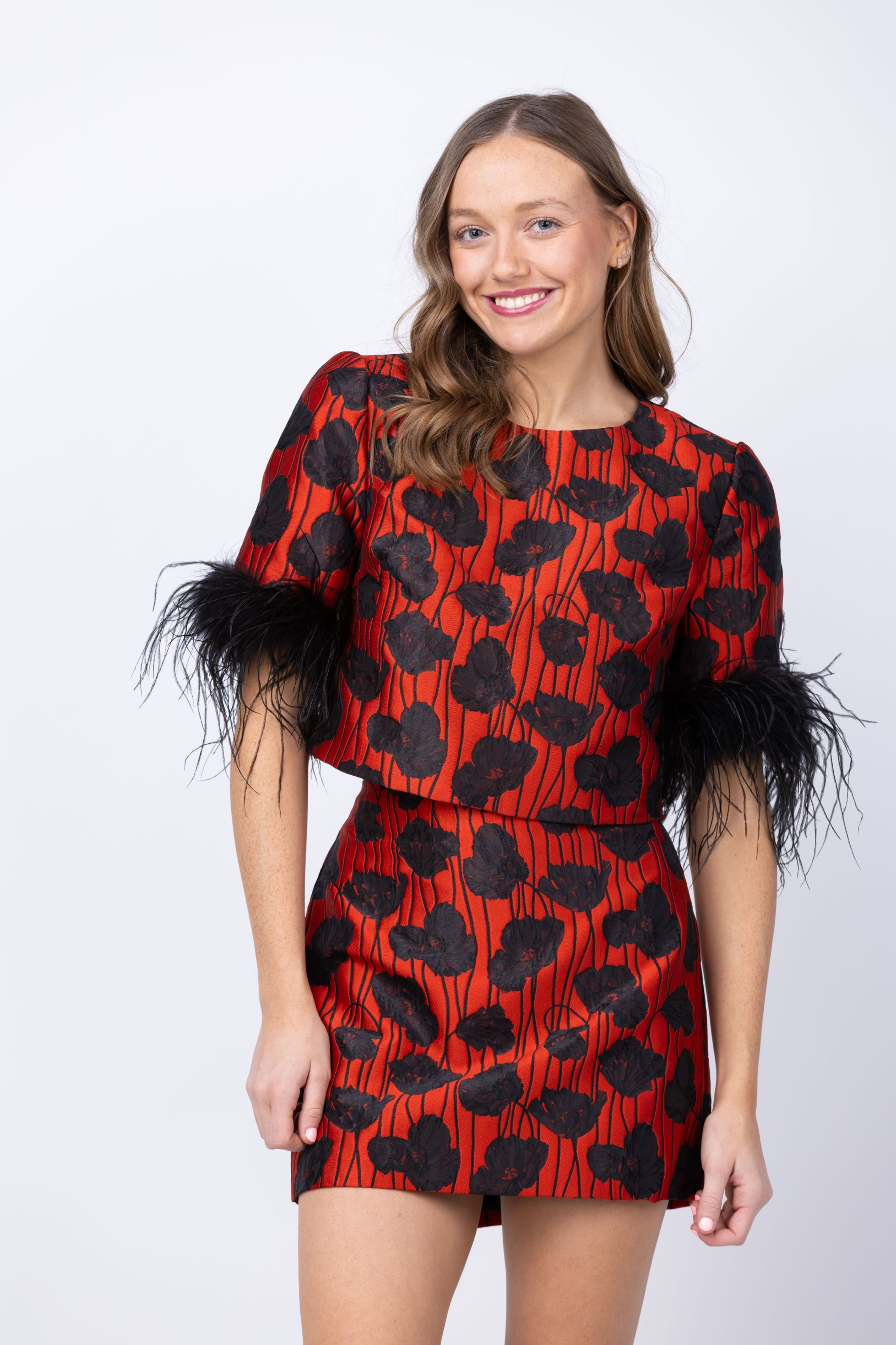Strut your stuff in this show-stopping poppy jacquard top that's equal parts bold and cheeky. The boxy silhouette keeps things relaxed while the cropped length shows just the right amount of skin, and those dramatic black faux feather cuffs? Pure drama. Pair it with the coordinating Modern Mini Poppy Skirt to complete your statement-making ensemble. It's the kind of piece that says you don't do boring.