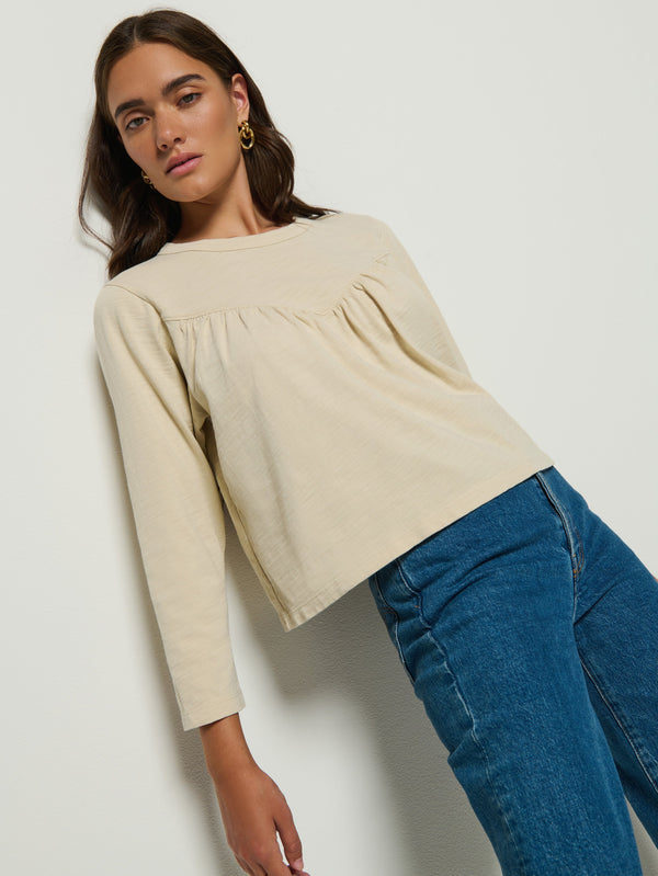 Elevate your casual wardrobe with the Nation Ltd Mona Top in Parchment. This chic crew neck babydoll top features a shirred front yoke and three-quarter sleeves, offering a relaxed yet stylish fit. Its soft, neutral parchment shade makes it a versatile piece perfect for effortless everyday elegance.