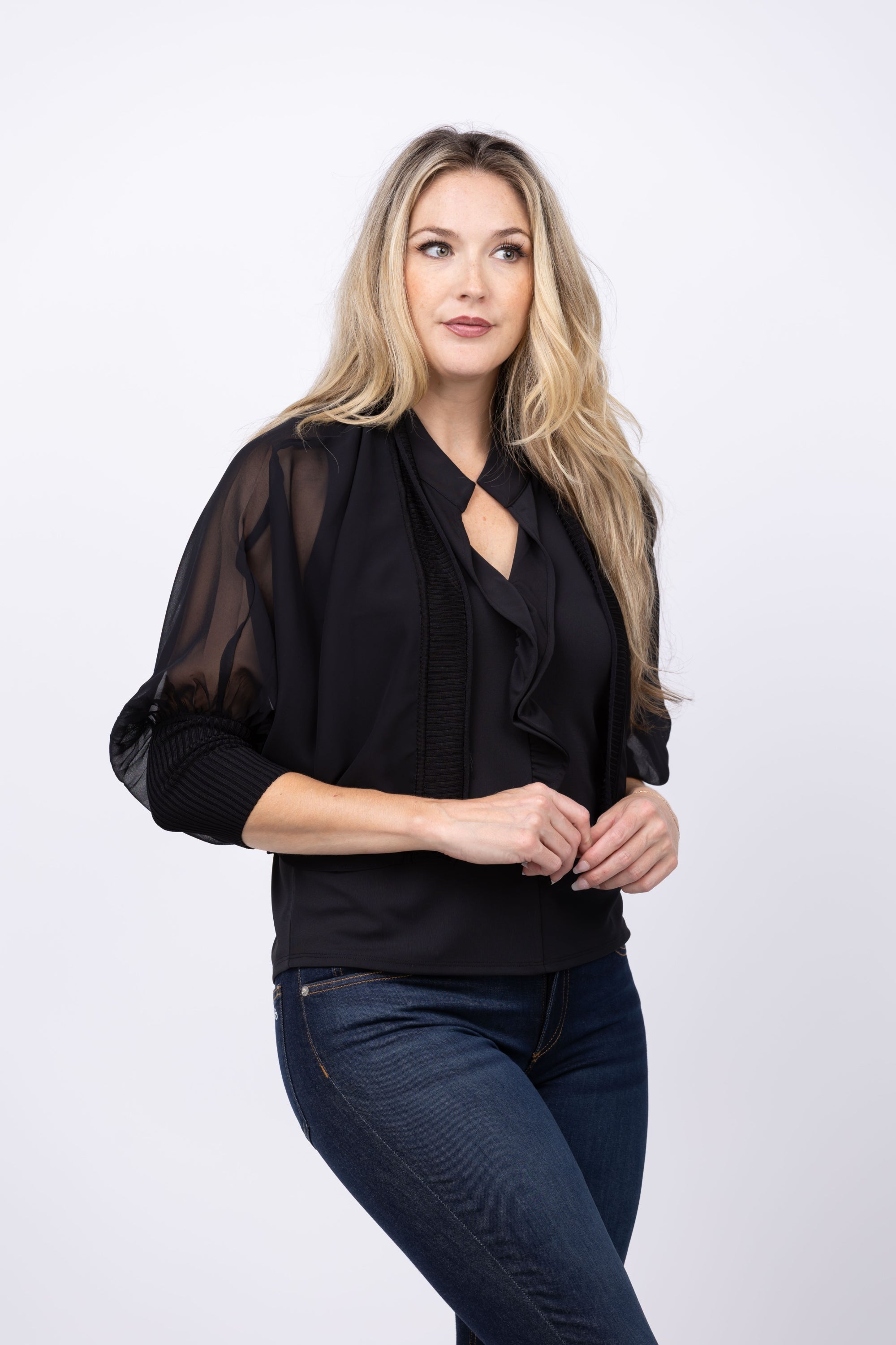 The Nic + Zoe Chiffon Crush Cardigan in Black Onyx is your go-to warm-weather layer for a polished look. Featuring a sheer woven body paired with knit jersey trim and rib cuffs, this mixed media cardigan effortlessly elevates any RSVP dress. Its loose, easy-fitting silhouette makes it simple to shrug on and off, combining comfort with sophisticated style for any occasion.