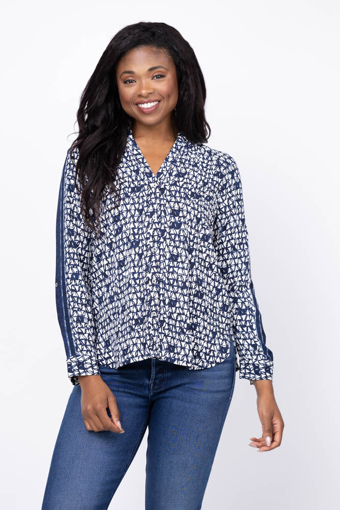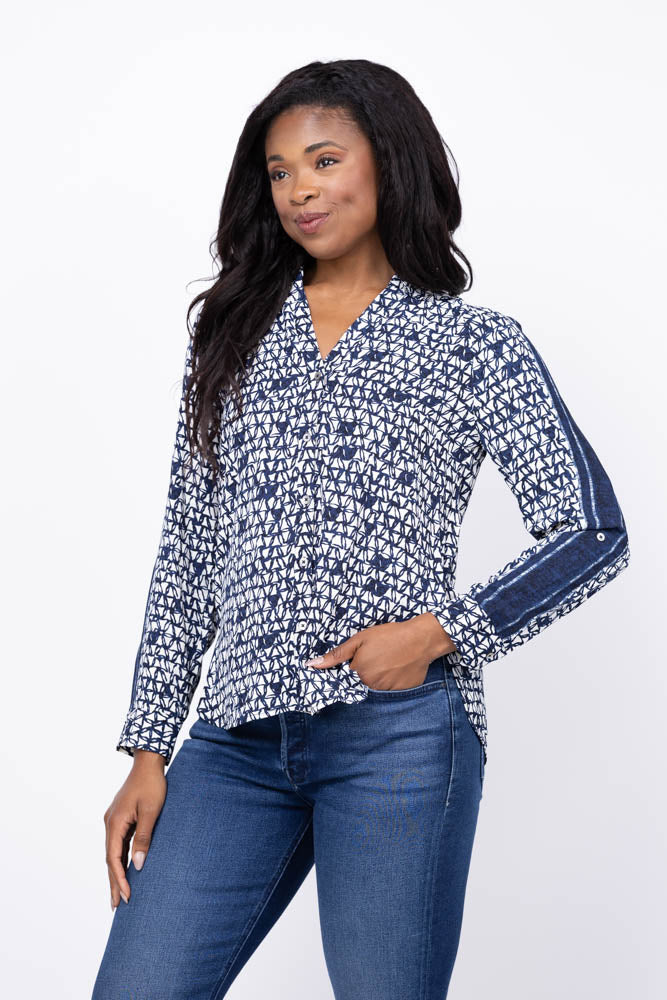 The Nic + Zoe Etched Angles Shirt in Indigo Multi is a versatile piece perfect for everything from daily errands to the office. Featuring a distinctive side stripe in dark indigo, it adds a stylish touch of character. Roll tab sleeves let you customize your look, while the easy button front ensures effortless wear. The subtle black accents in the print bring an added layer of sophistication, making this shirt a smart and fun addition to your wardrobe.