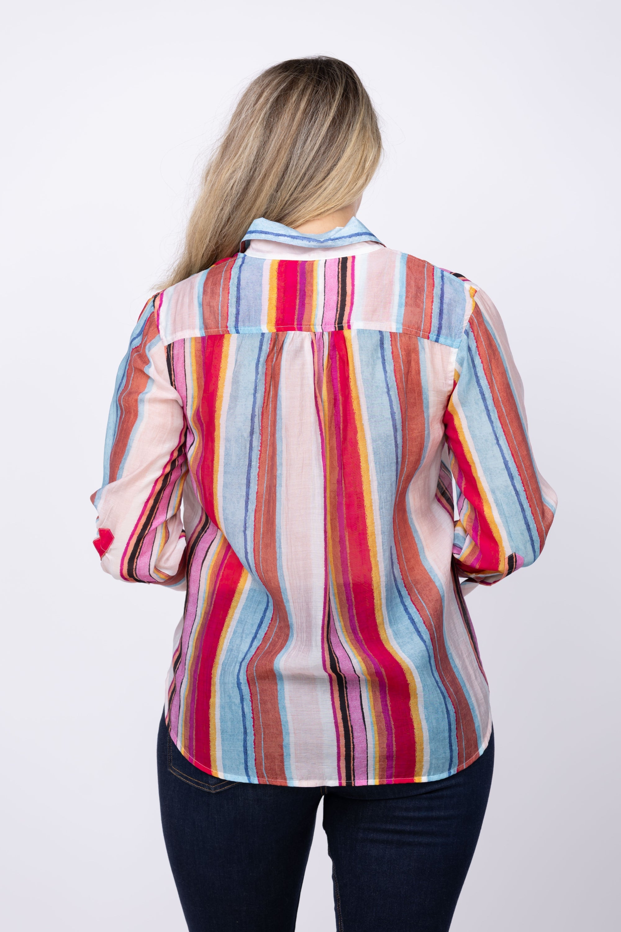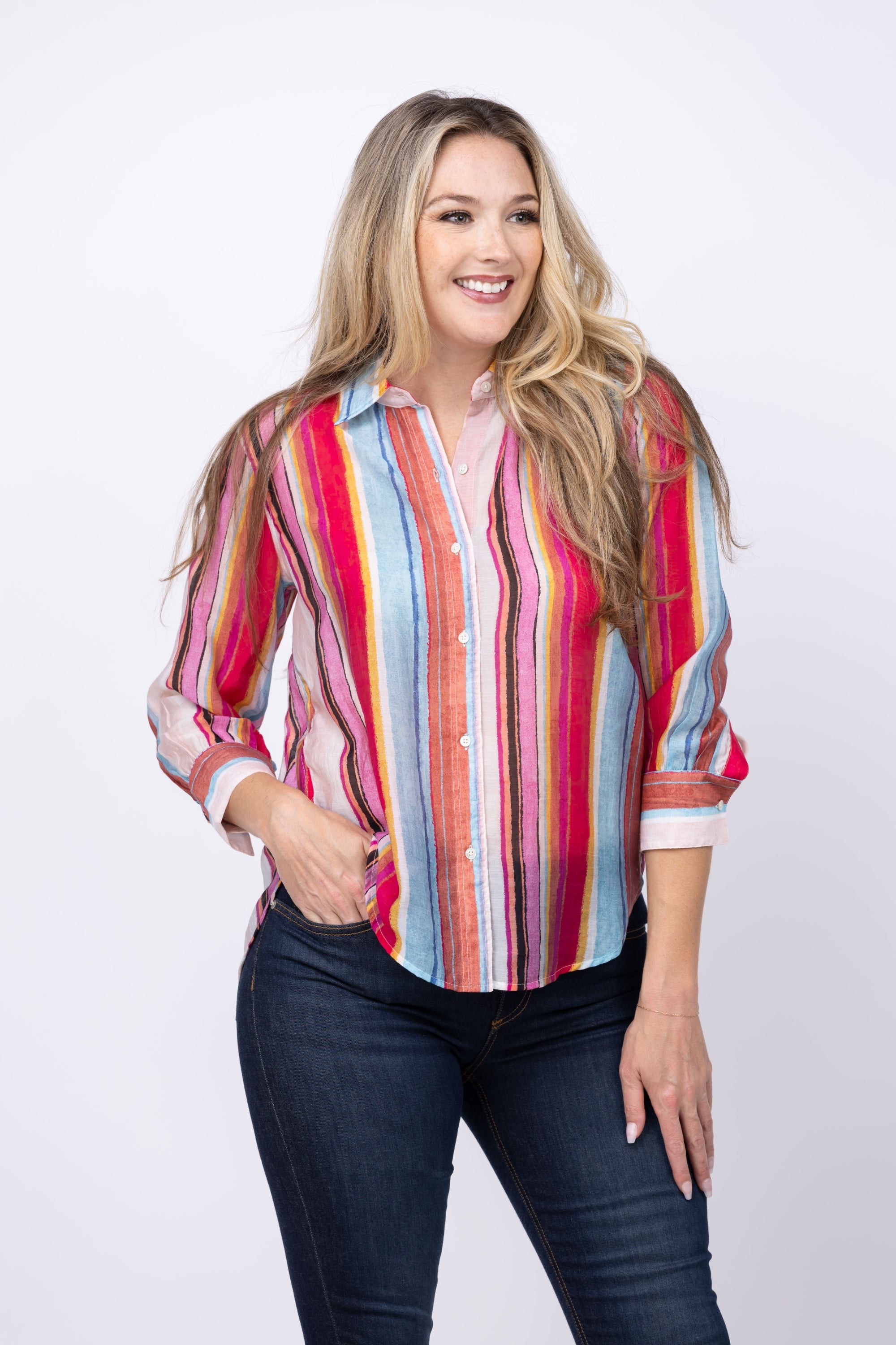 The Nic + Zoe Horizon Breeze Shirt in Pink Multi redefines the classic button-down with a hand-painted stripe pattern that adds a bohemian, artistic flair. Perfect for casual nights, busy days, or creative office looks, its easy-fitting silhouette features abbreviated 3/4 sleeves and a hem that falls just below the hip. Crafted from drapey LENZING™ Tencel, made from sustainably sourced wood pulp, this shirt combines style, comfort, and mindful craftsmanship for your versatile wardrobe.
