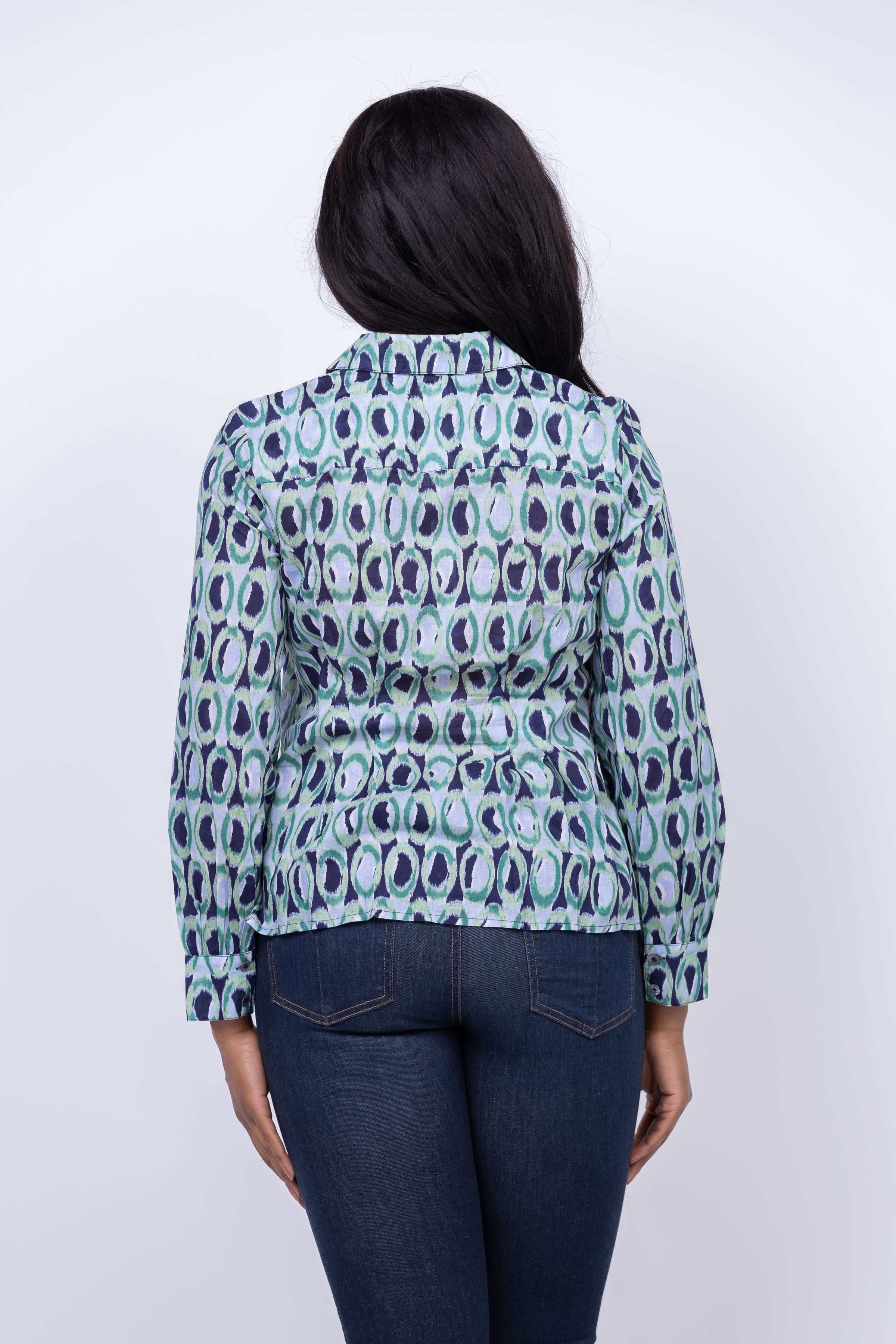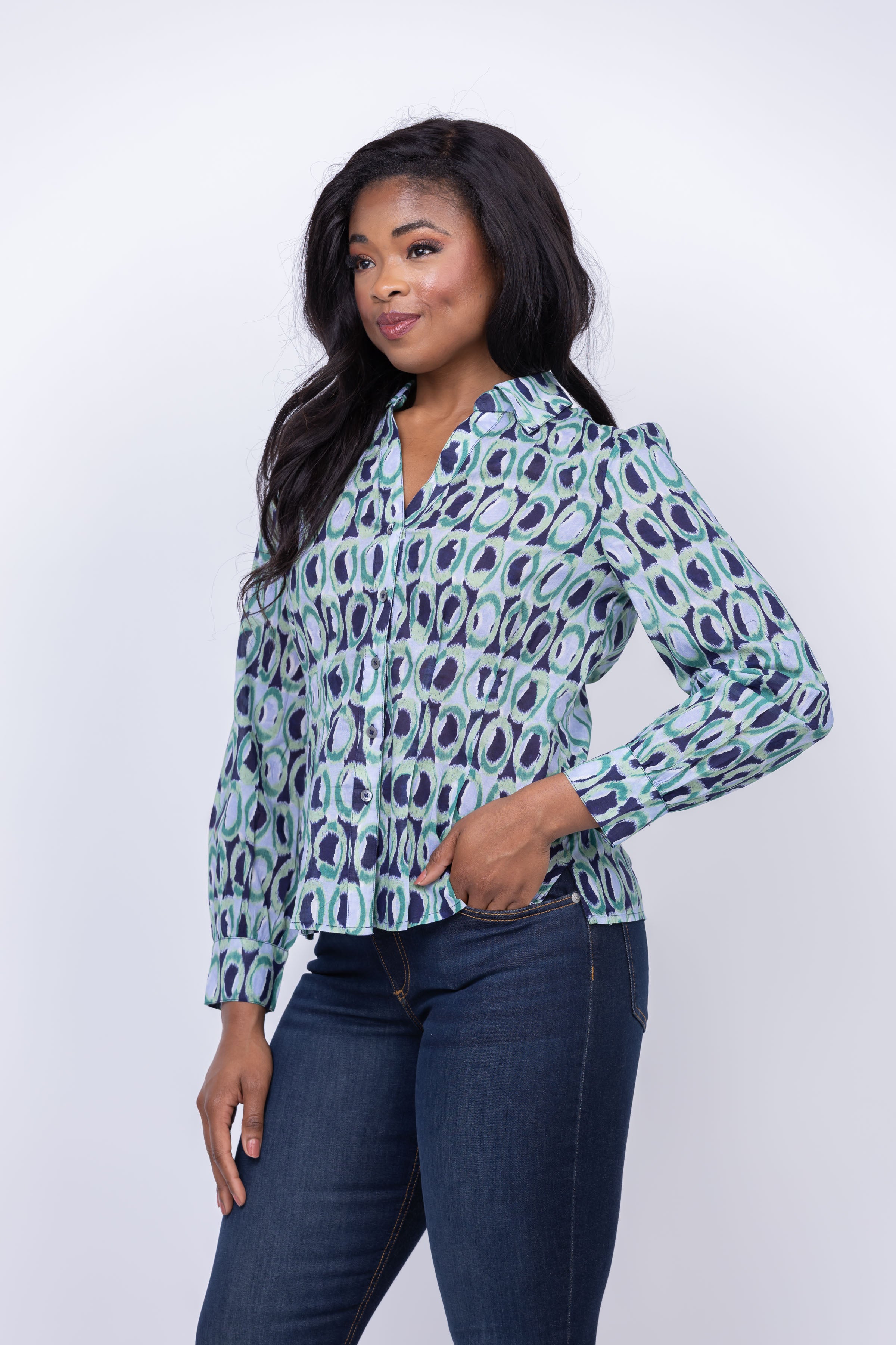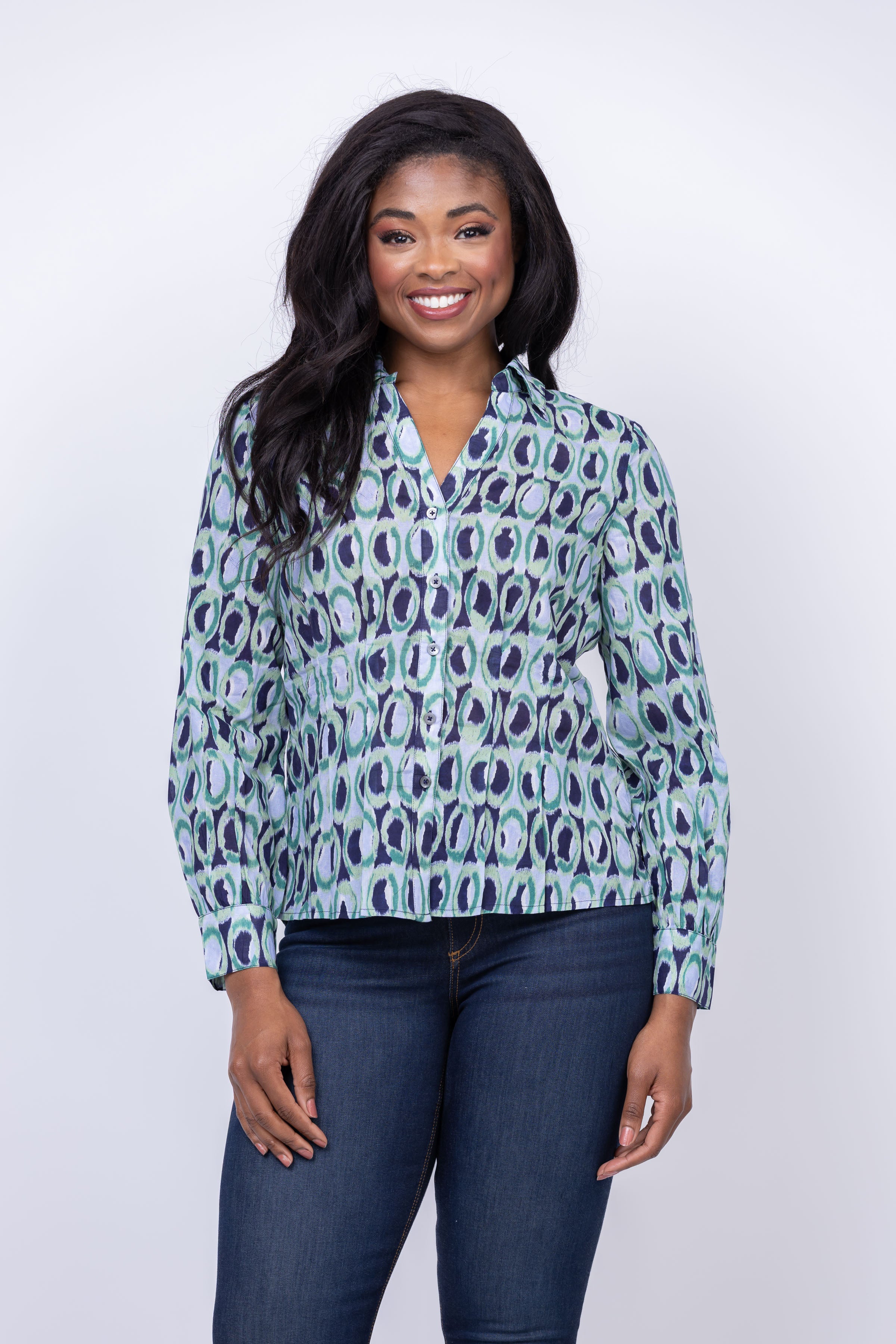 Unleash your fashionista side with the Nic + Zoe Ikat Rings Tucked Shirt in Green Multi. The vibrant print and versatile silhouette make it perfect for any occasion. With easy outfitting and a polished look, this shirt is a must-have. Long sleeves, button openings, and a hip-length hem add effortless style.