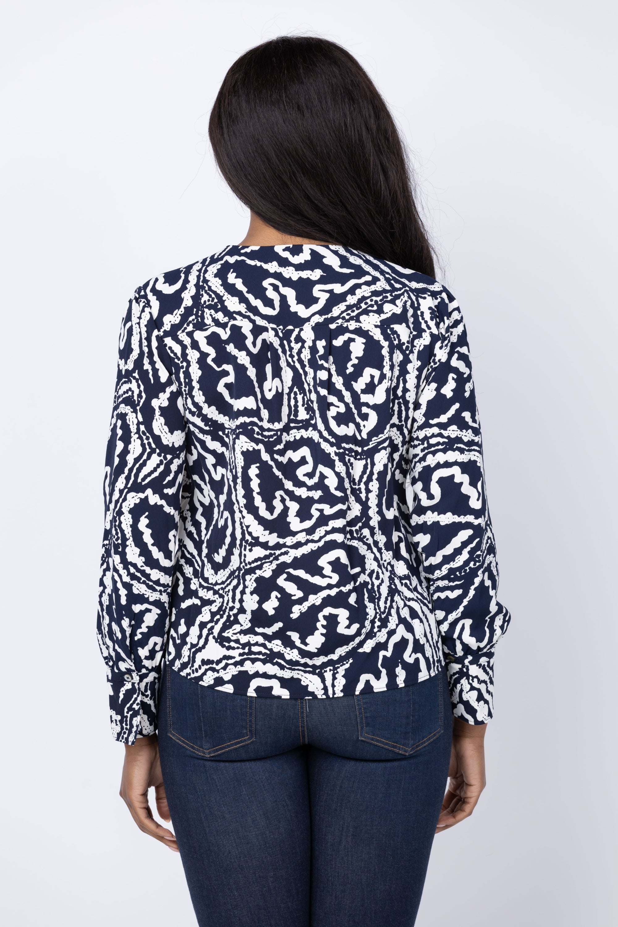 Introducing the stunning Double Crepe debut—a fabric that marries the delicate drape of crepe with substantial structure for effortless versatility. The striking large-scale Indigo Leaf print commands attention with its bold bi-color design, seamlessly pairing with denim for casual elegance or elevated pieces for refined occasions. Thoughtfully crafted details elevate every wear: a hidden button placket creates a polished front, while a charming flounce at the cuff adds unexpected sophistication. Whether you're dressing for the office, special events, or simply elevating your everyday style, this top delivers the perfect balance of comfort and polish.
