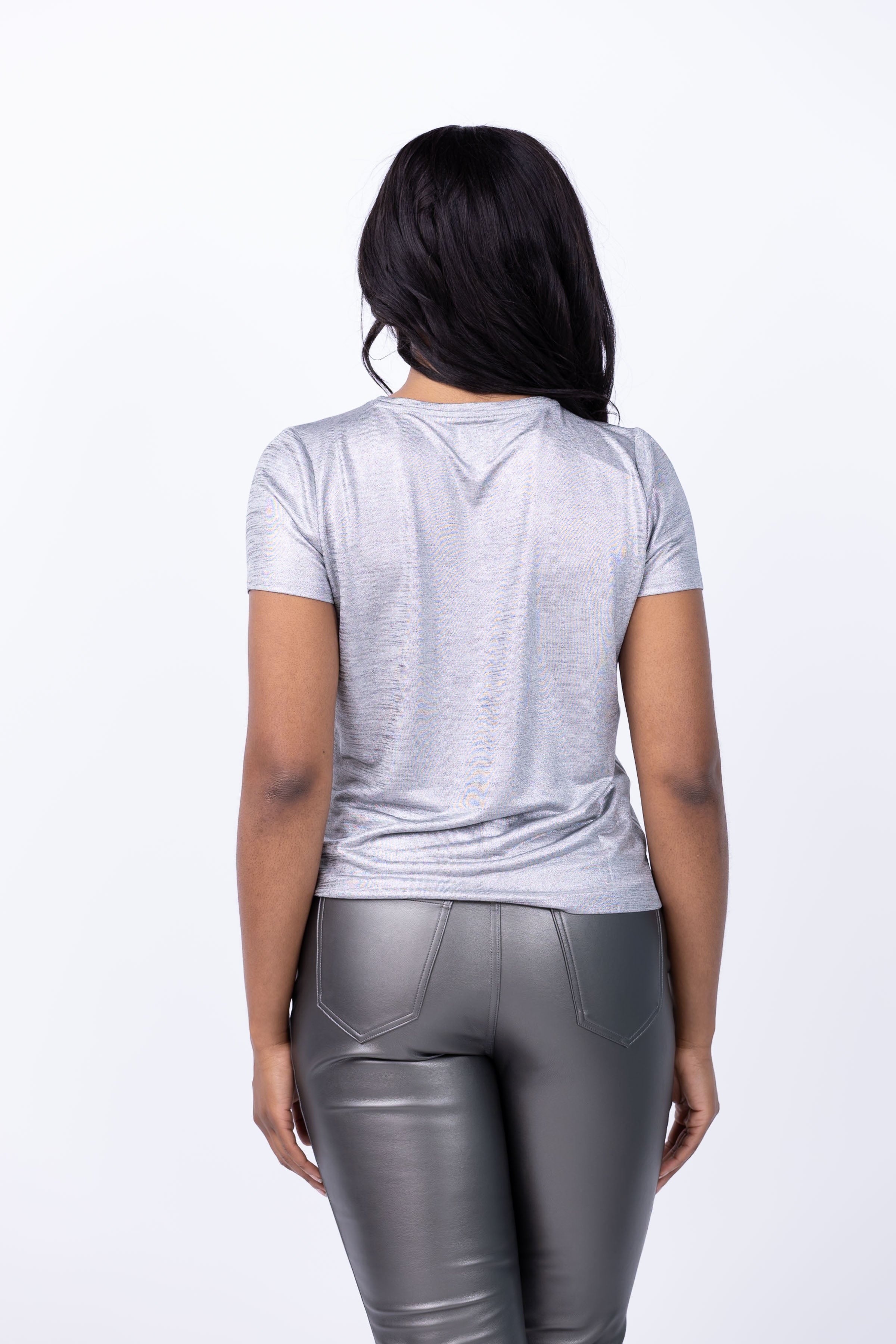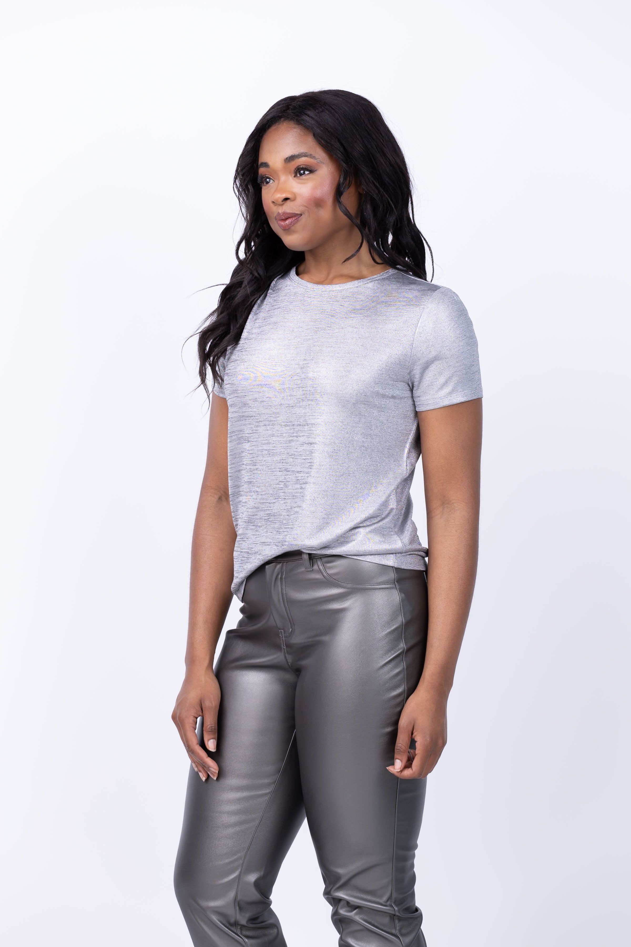 Indulge in the shimmering elegance of the Nic + Zoe Shine Drape Tee in Silver. Made from a unique foil knit, this lightweight top adds a touch of sparkle to any outfit. With pleating at the shoulder enhancing the drape, it's perfect for both festive occasions and work. This regular fitting tee features a round neck and hem that sits at the hip.