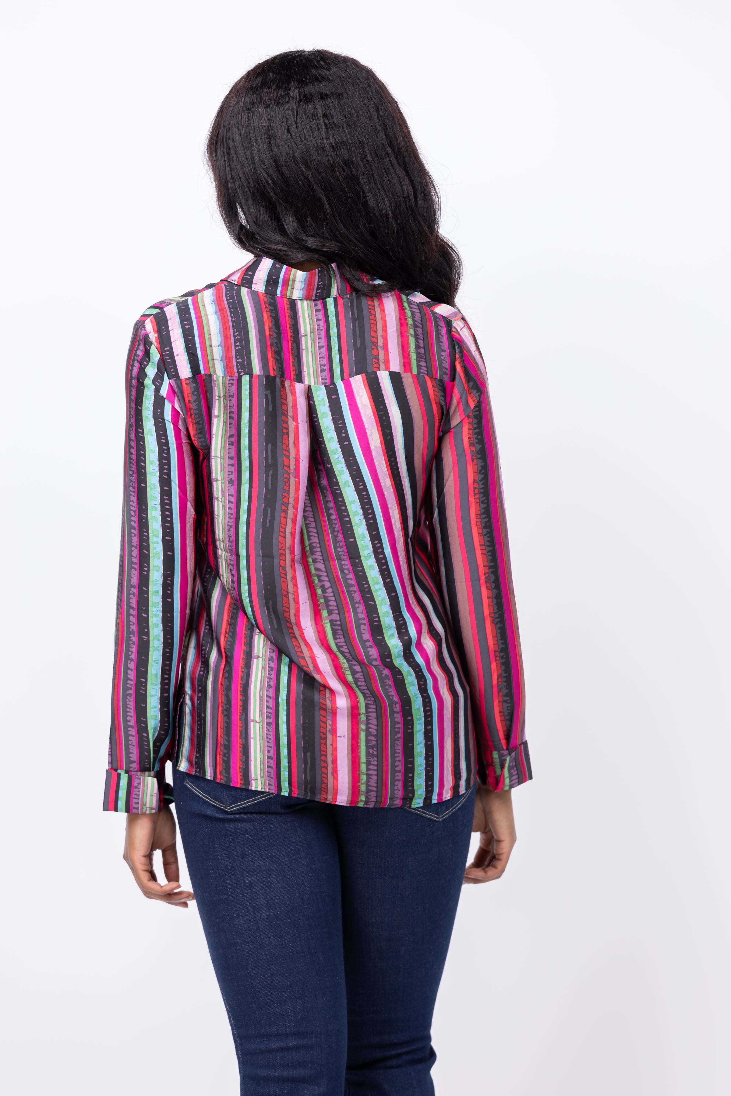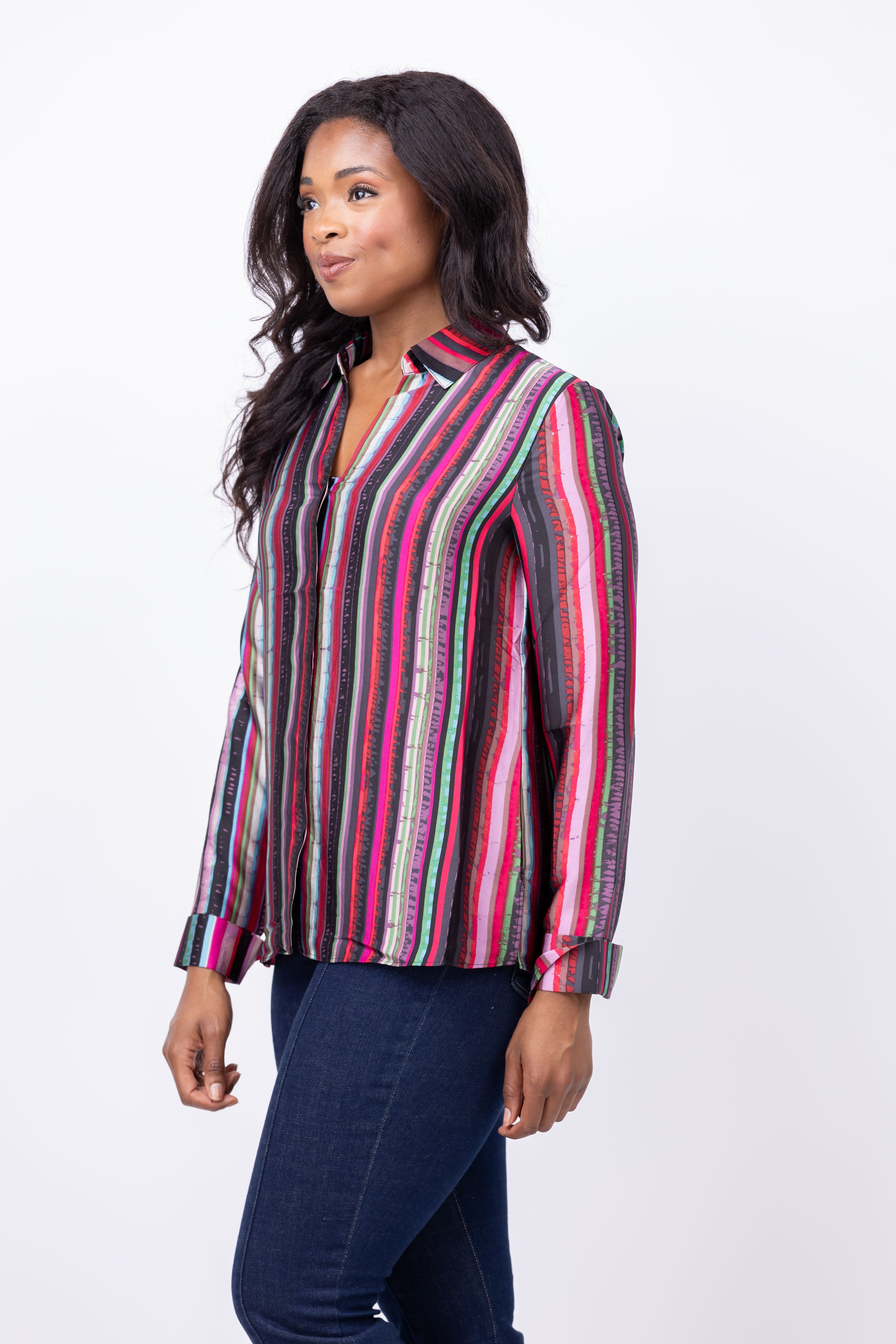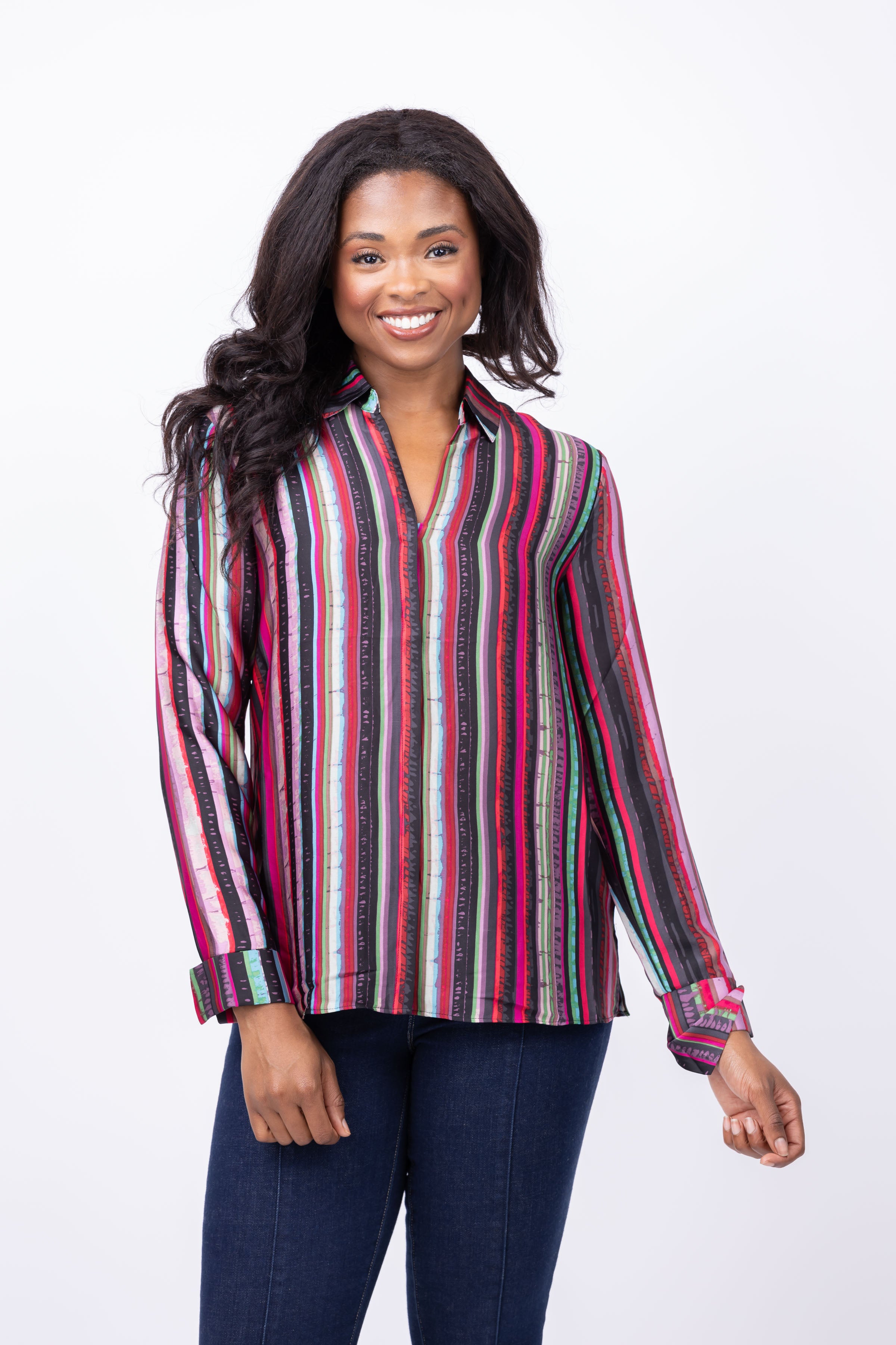 Unleash your vibrant style with Nic + Zoe's Vivid Vision Shirt! Our sleek Pottery Crepe fabric drapes elegantly and boasts an eye-catching multicolored stripe print. This partially recycled, button-down shirt features long sleeves and a versatile hem that can be tucked, untucked, or French tucked. Command attention with every outfit and feel good about your fashion impact.