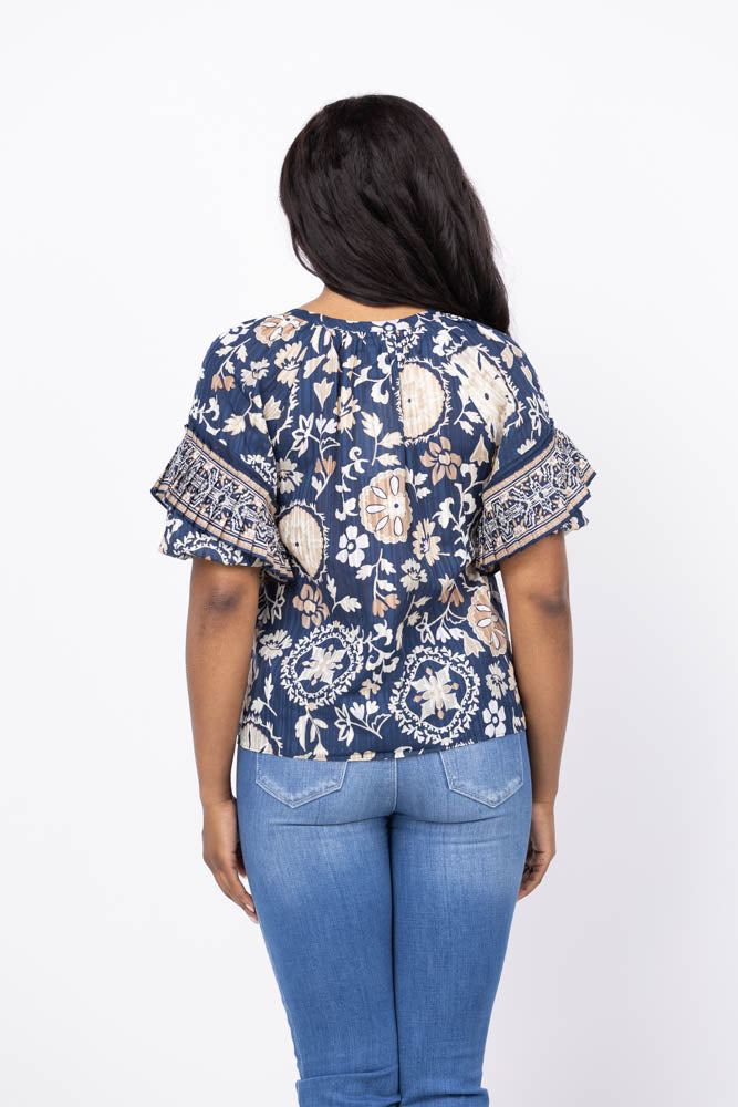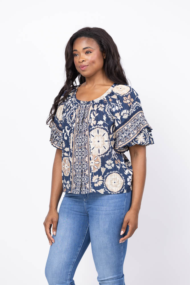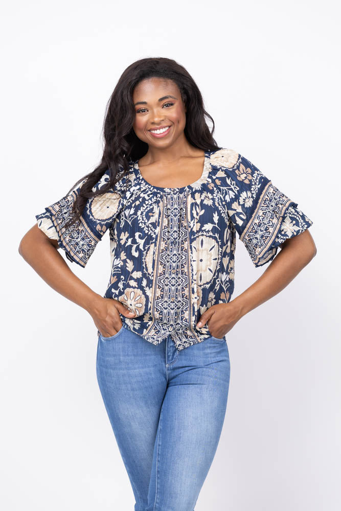 Make summer yours with the Ramy Brook Rebeca in Neutral Maya Combo. Featuring a flattering scoop neck and 3/4 sleeves with delicate ruffle details, this relaxed-fit top offers effortless romantic movement and all-day comfort. Its unique printed design with contrast placement adds a stylish touch that pairs perfectly with white denim or sleek skirts, making it a versatile choice for day-to-night wear. Elevate your wardrobe with this chic, easy-to-wear piece that brings both elegance and ease to your summer style.