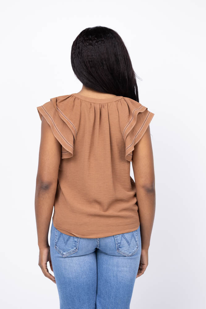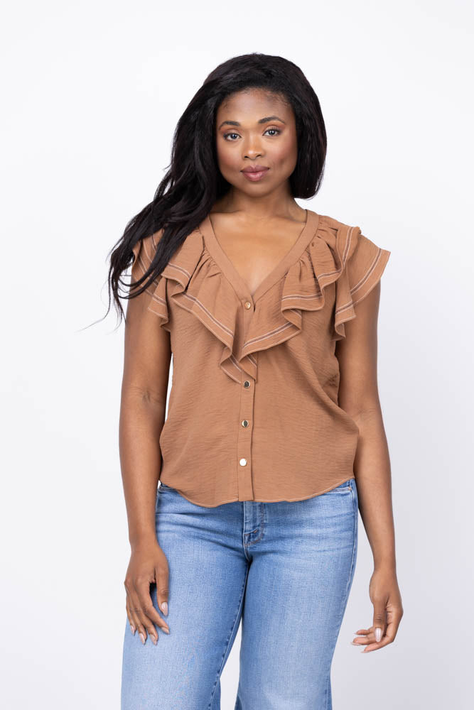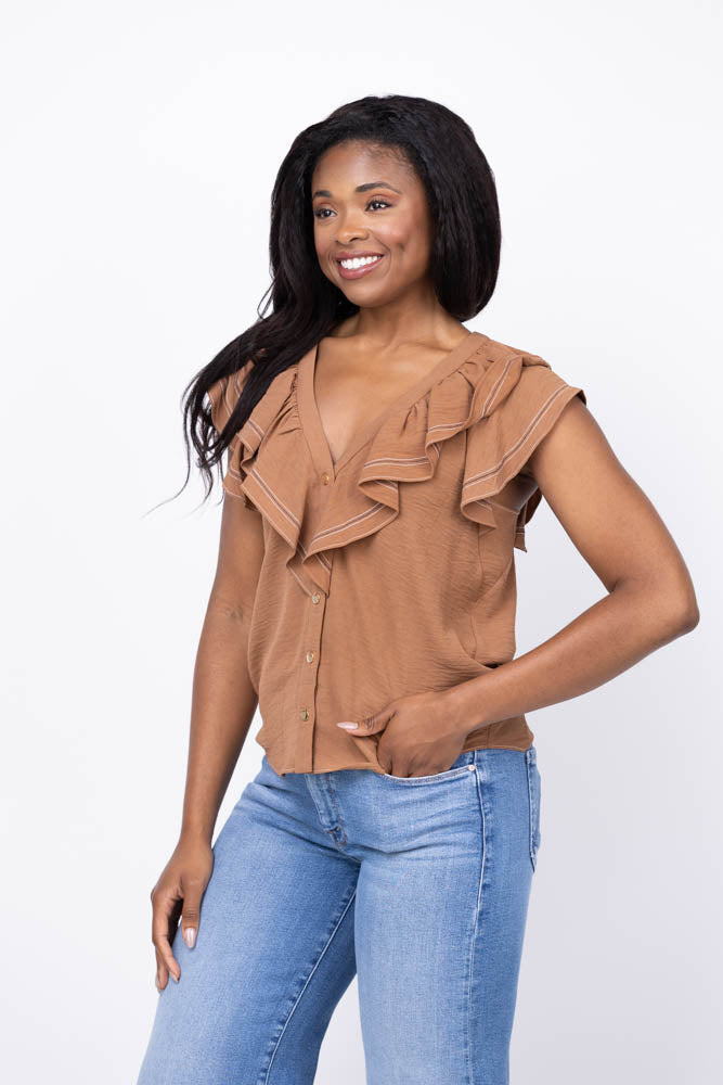 Elevate your summer wardrobe with the Ramy Brook Stitch Lettie in Baja Brown. This feminine top boasts a slim silhouette ideal for tucking, complemented by a flattering v-neckline and delicate ruffled bodice. Designed for effortless styling, the Lettie brings a joyful, polished touch to any outfit, making it your go-to piece for warm-weather days and beyond.