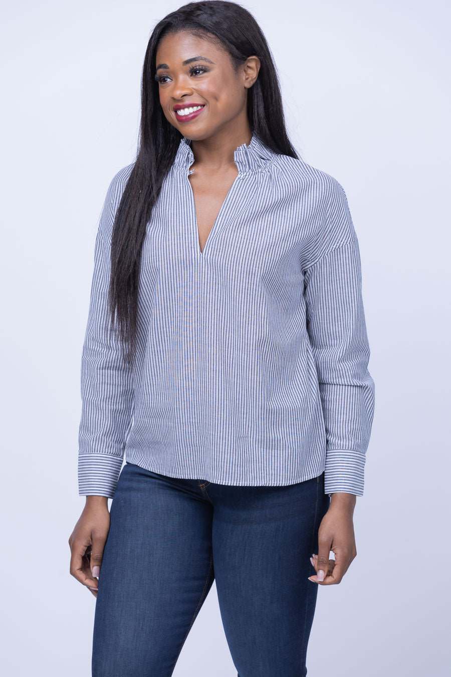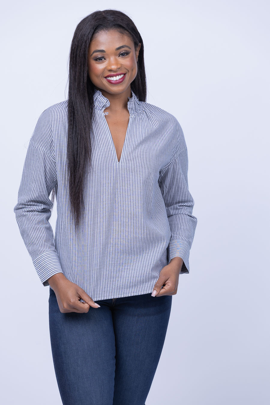 Our Sundays Sanders Shirt offers undeniable style! Stand out with the classic black drop stitch pattern, v-neck silhouette, and delightful ruffle detail. Crafted from light-weight material that's perfect for any weather and occasion!