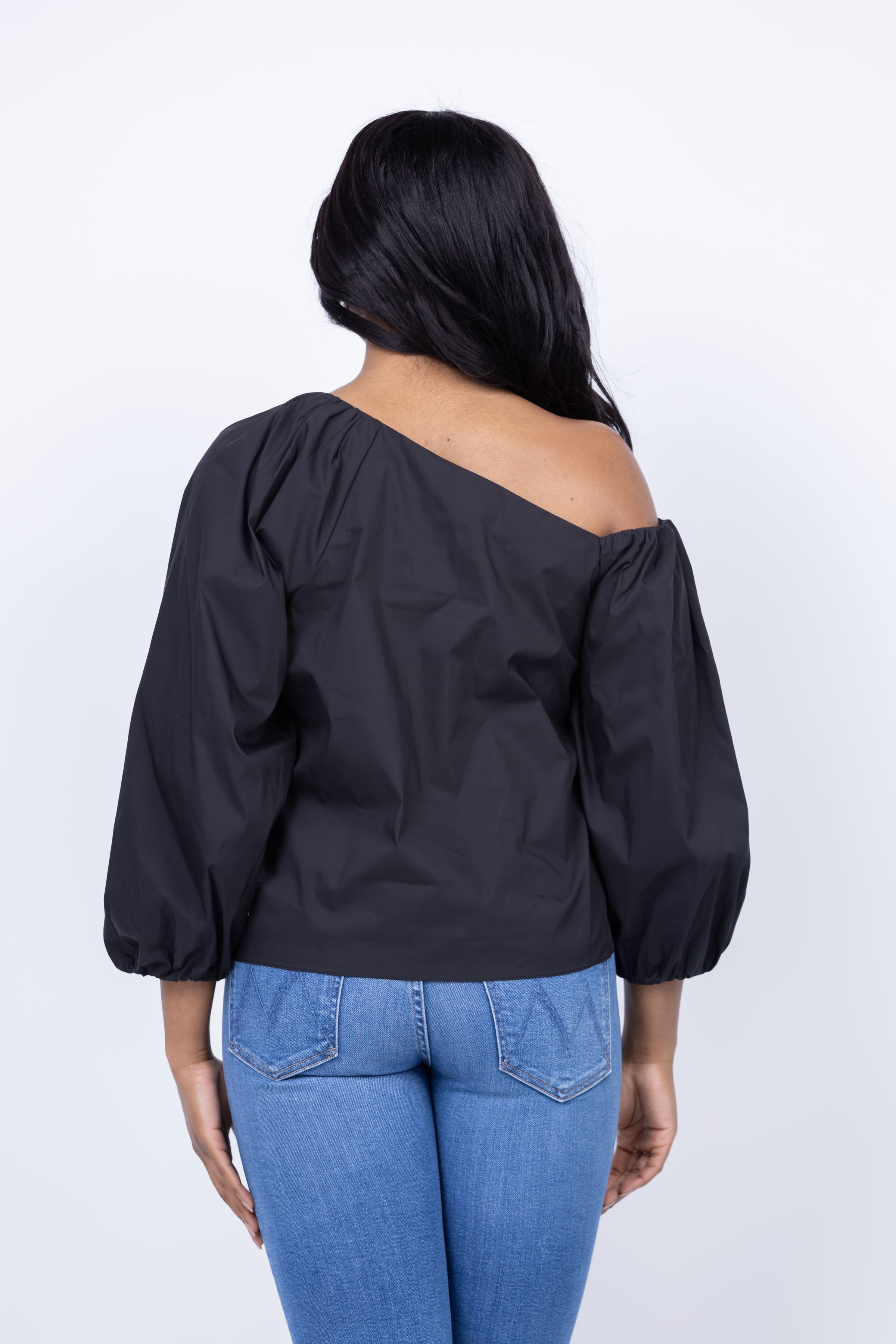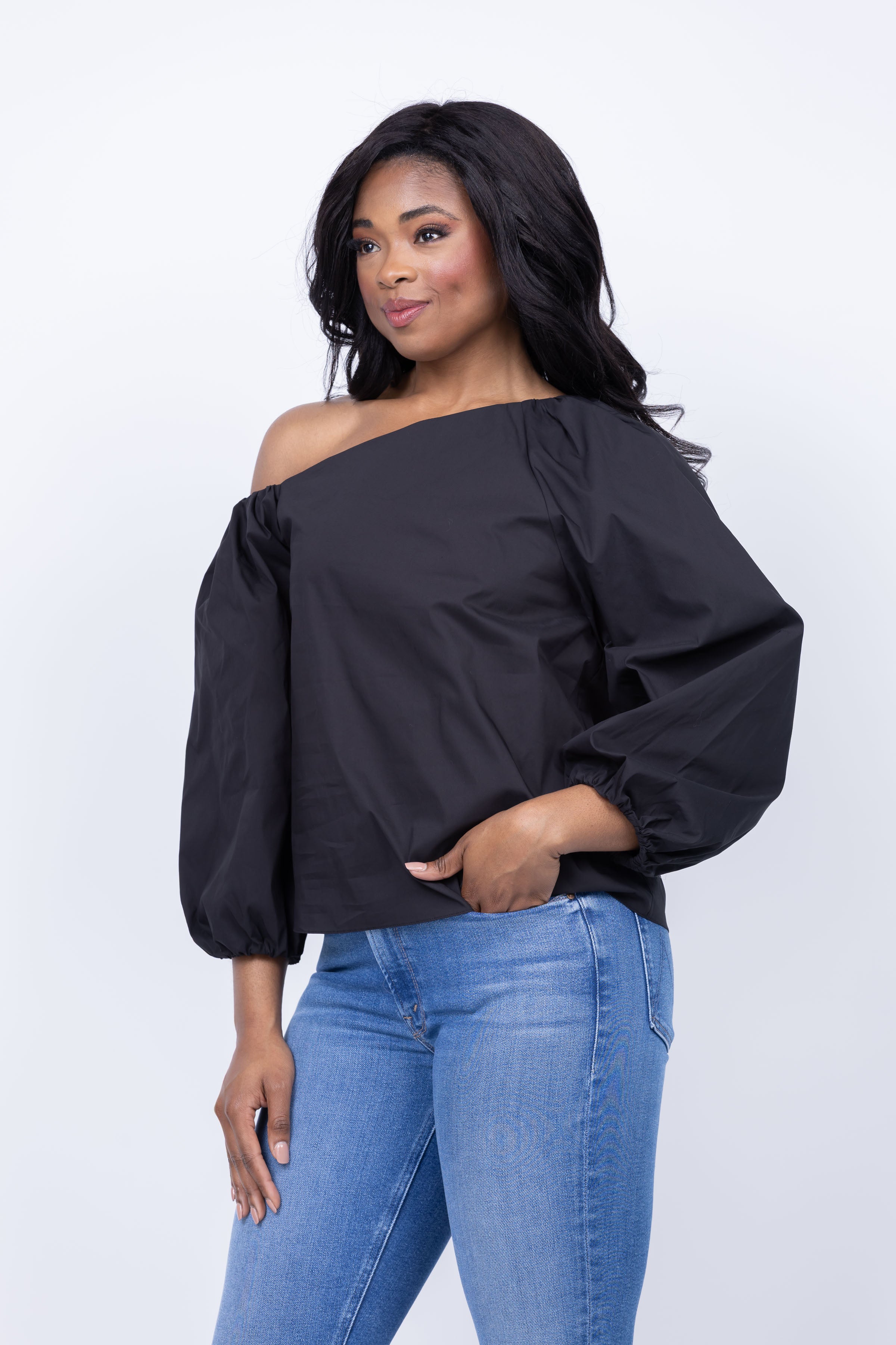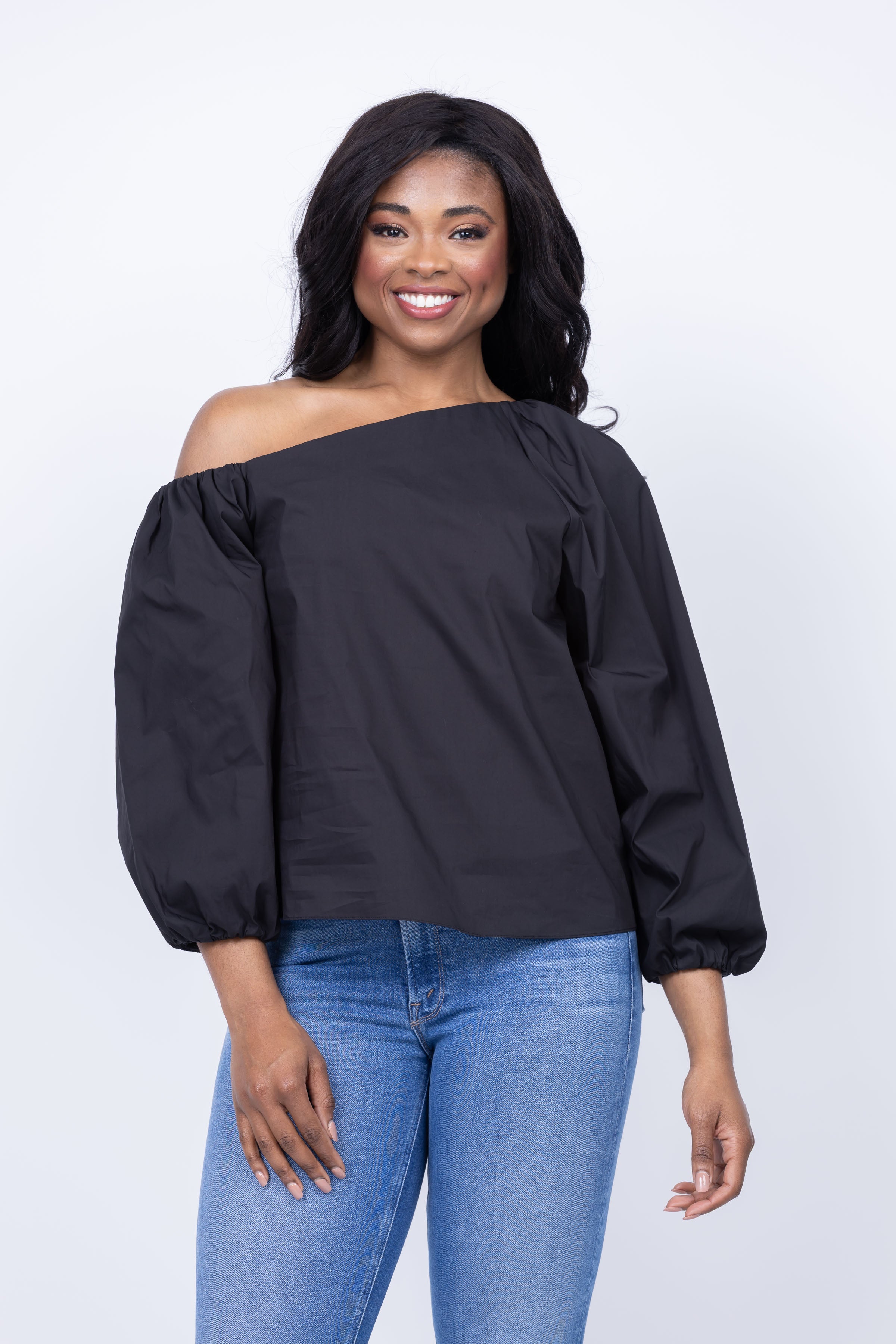 Elevate your wardrobe with the Tanya Taylor Tabitha Top in Black. Crafted from luxurious cotton poplin, this top features an asymmetrical off-the-shoulder neckline, voluminous lantern sleeves, and delicate pleating for a touch of femininity and edge. Perfect for day-to-night allure this Spring.