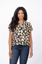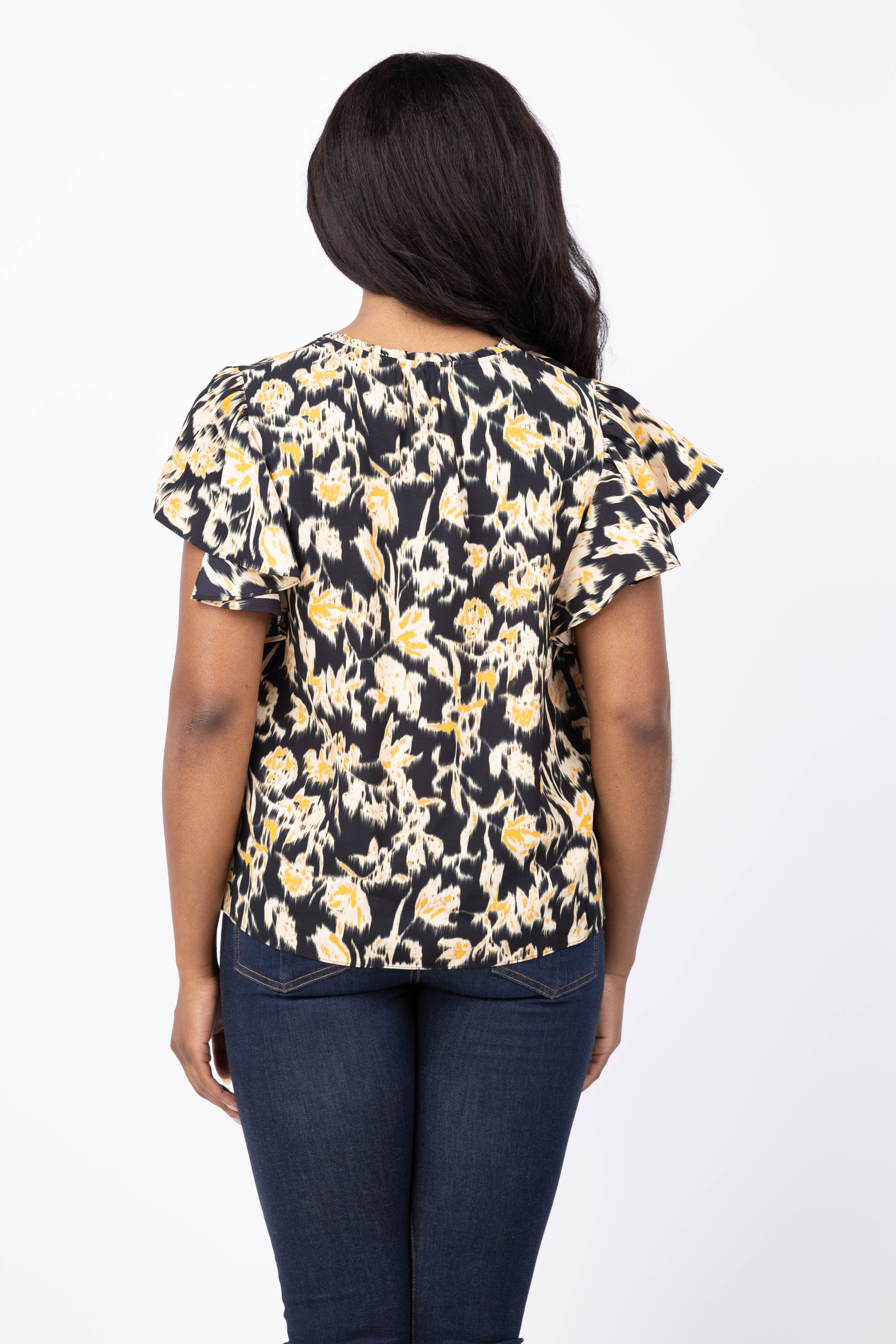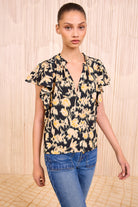 The Ulla Johnson Lilo Flutter Sleeve Blouse in Tourmaline features luxurious satin-back crepe with a smooth, silken underside for a refined feel. Its fluttering sleeves add a graceful movement, while the seasonal ikat print with surreal botanical motifs on a deep noir background brings a striking, artistic touch. This blouse combines sophistication with unique style, perfect for elevating your wardrobe with a standout piece.