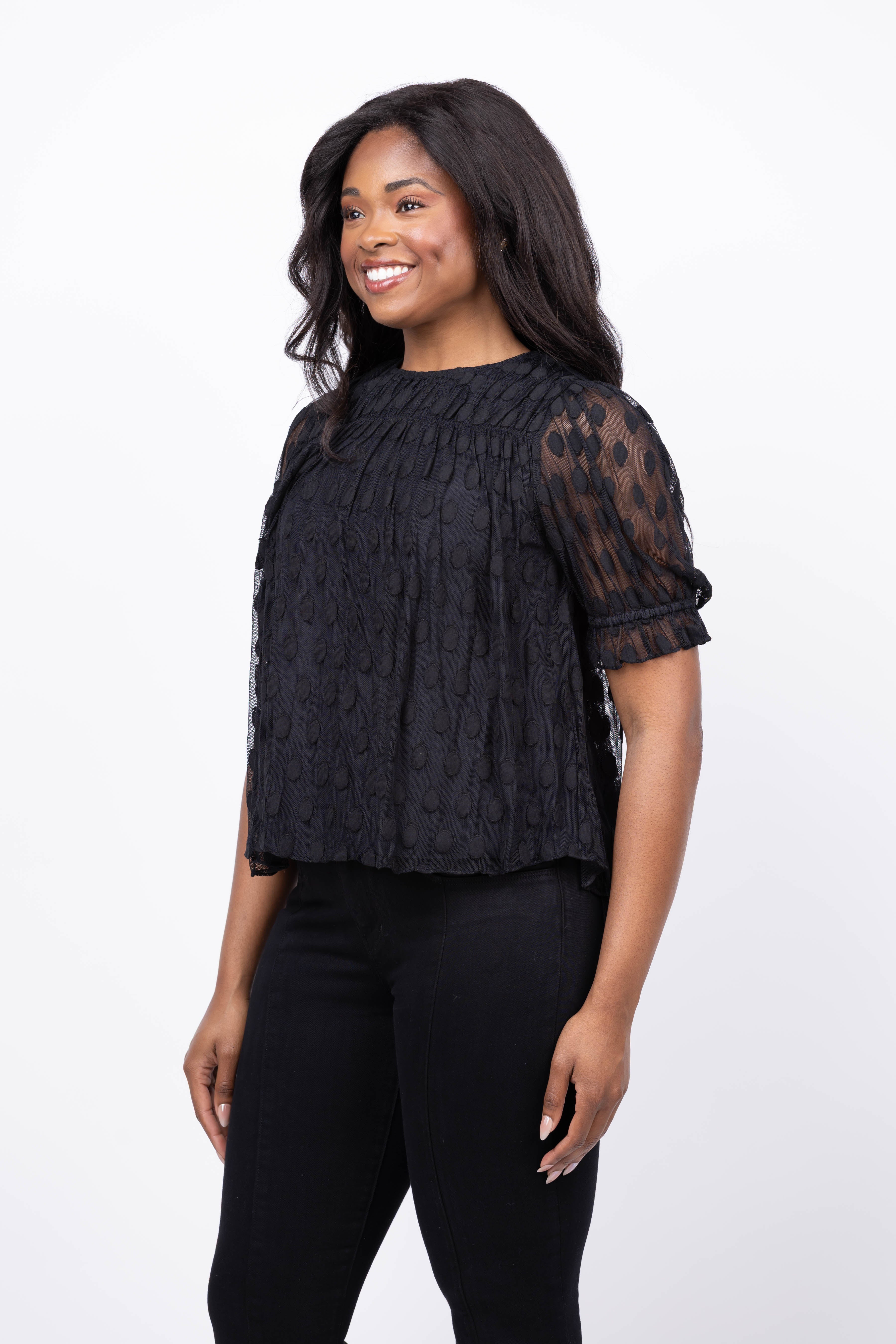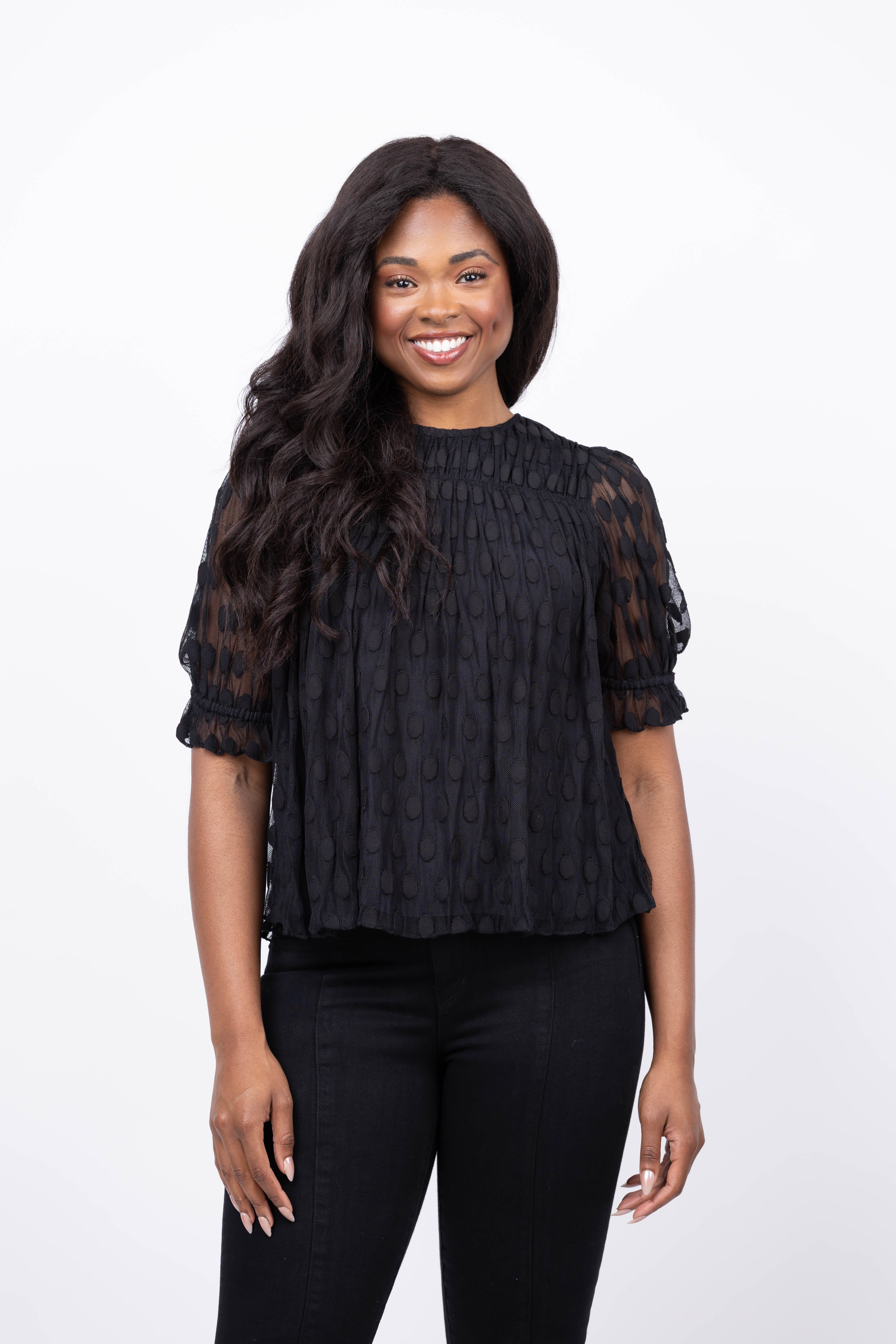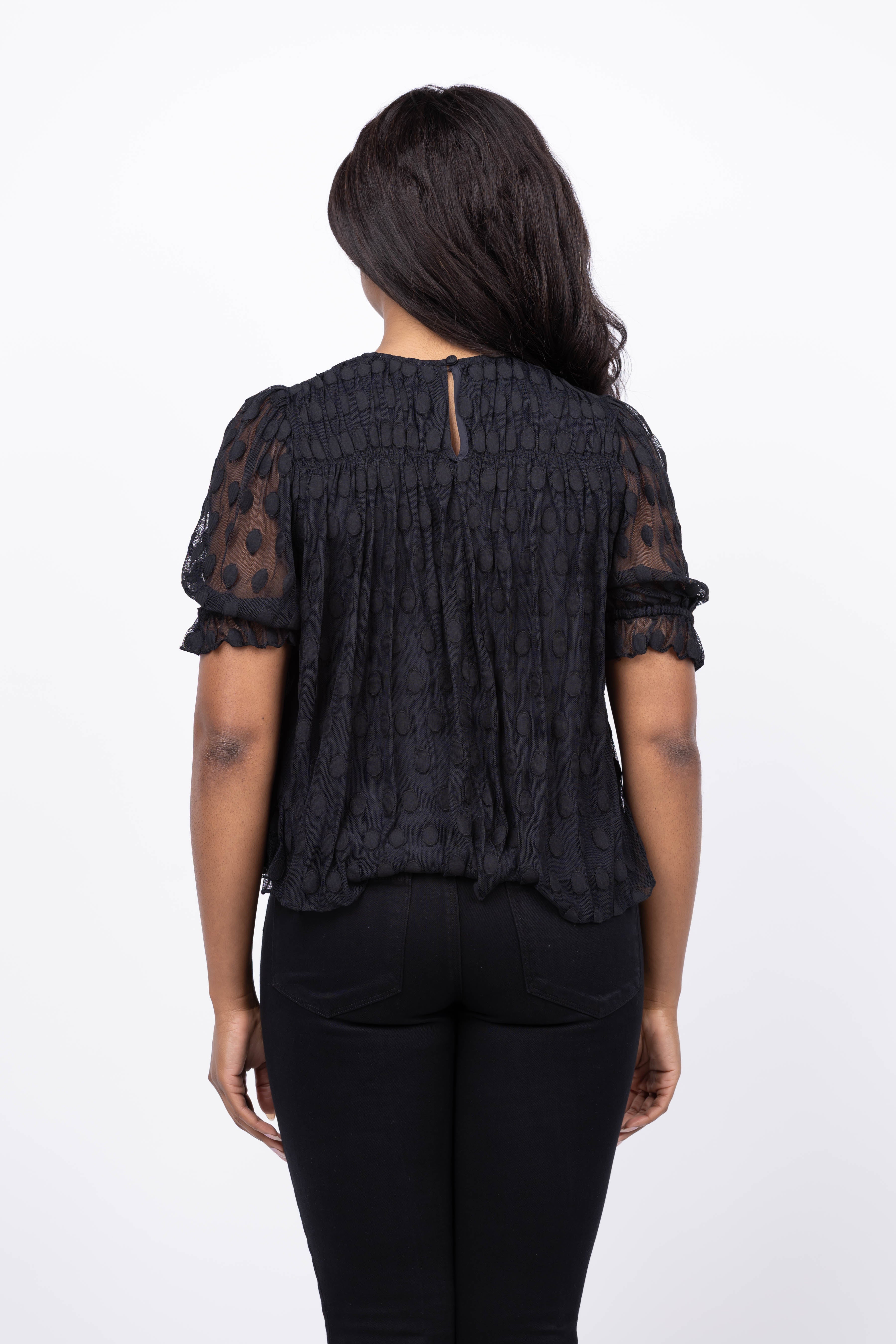 The Ulla Johnson Nitara Lace Short Sleeve Blouse in Noir combines delicate cotton-blend lace with playful polka dots to create an effortlessly elegant look. Its diaphanous texture and puffed shoulders add a touch of soft sophistication, making it perfect for any occasion. Embrace versatile style with this chic black blouse designed to elevate your wardrobe with subtle charm and timeless appeal.