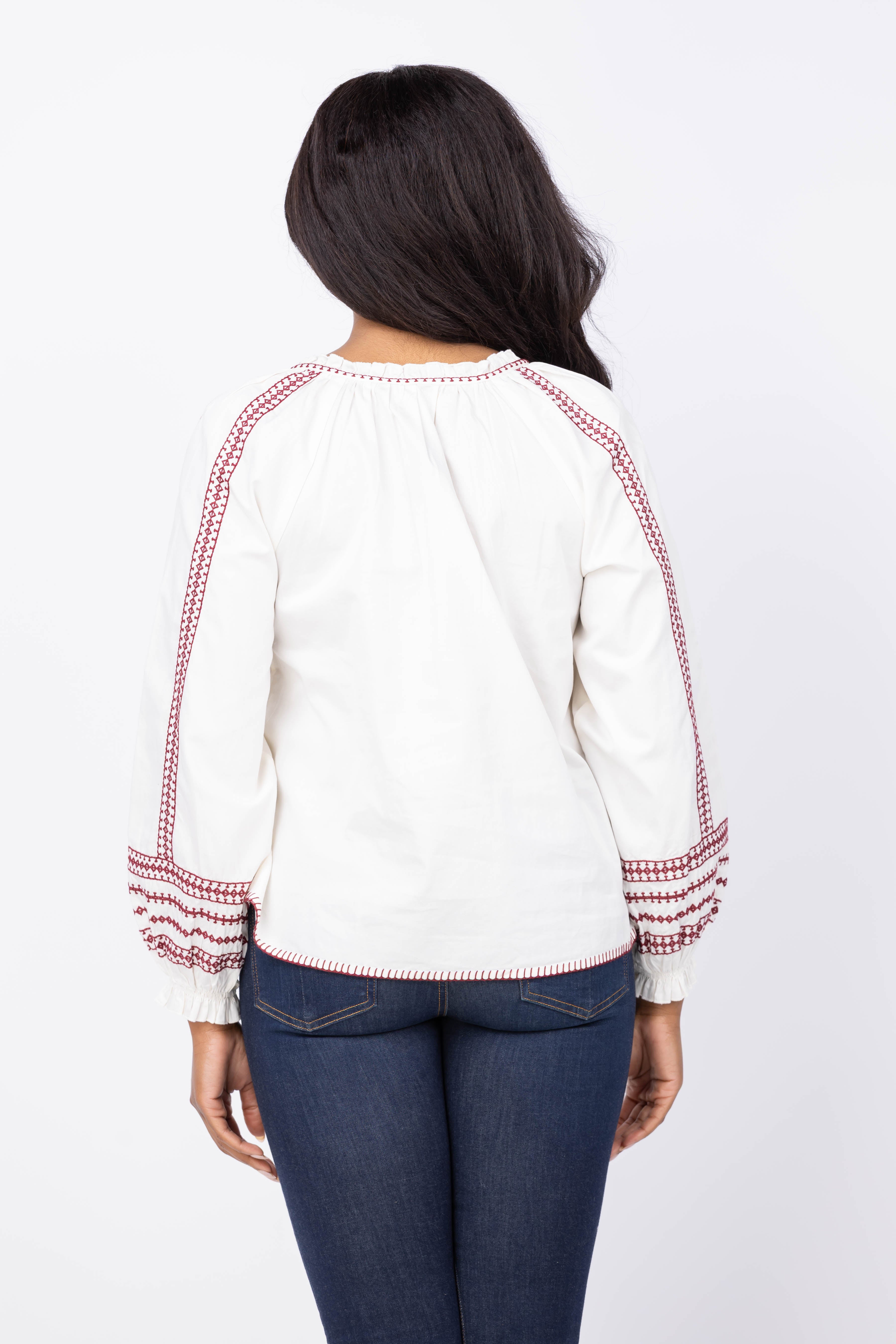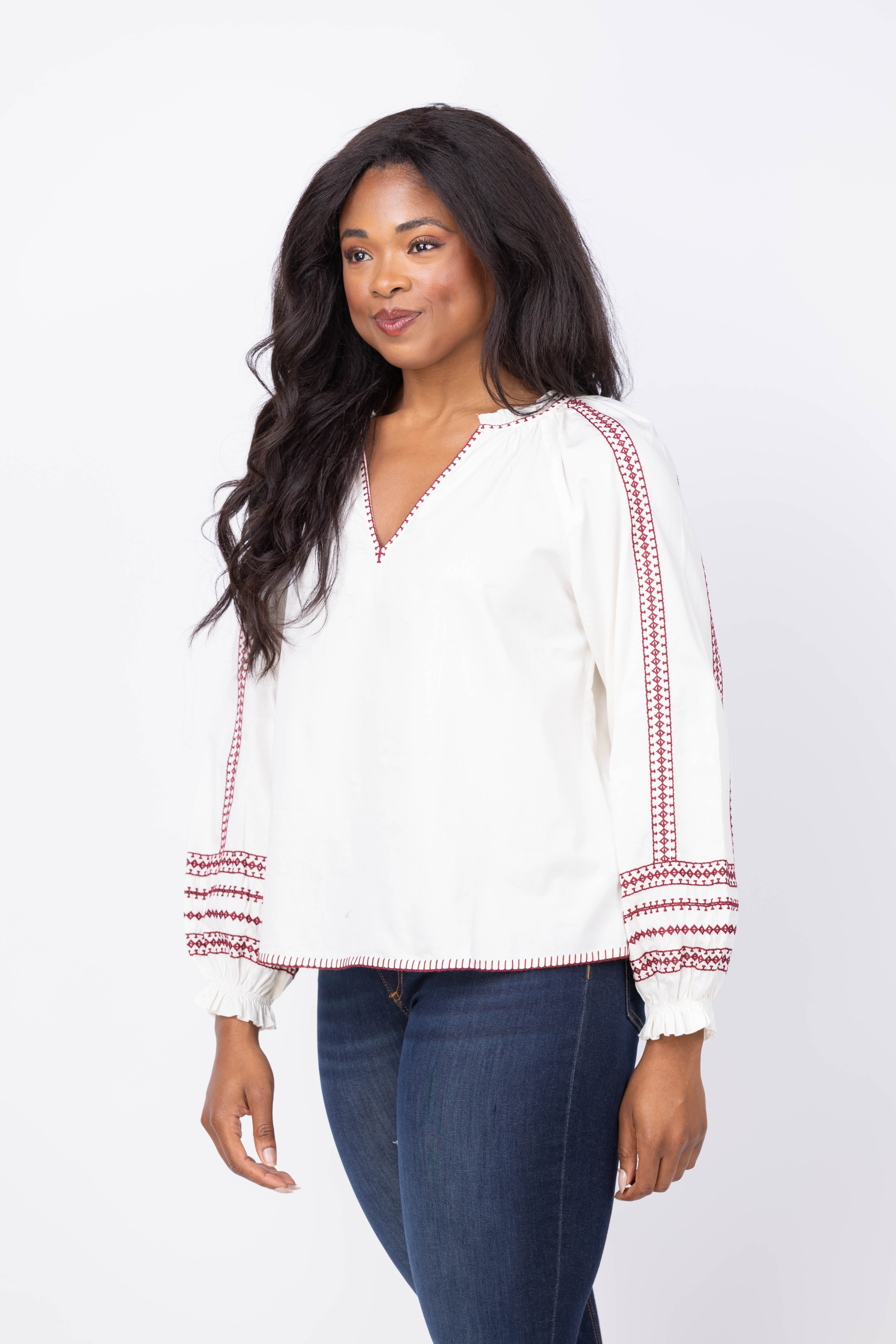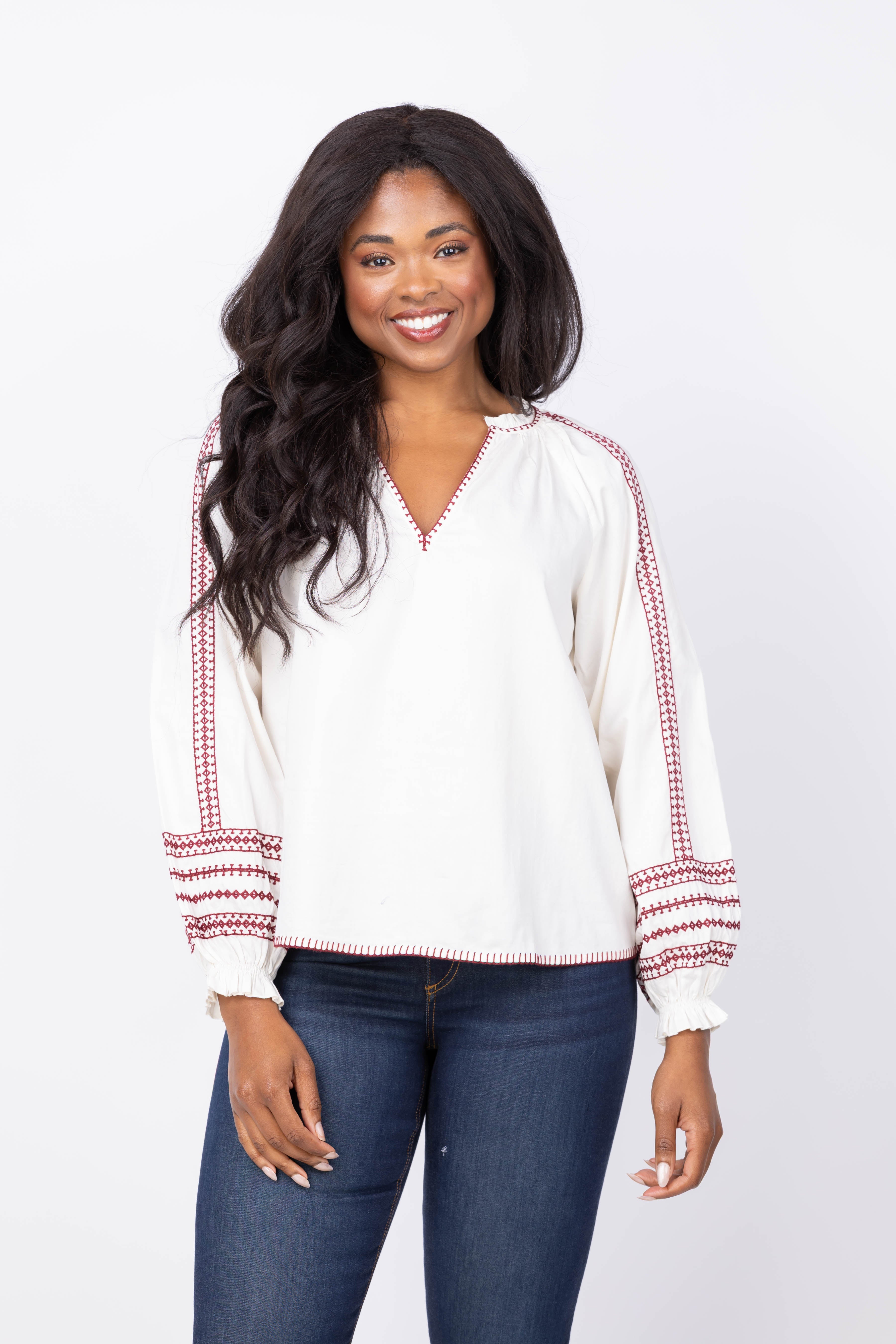 Elevate your everyday wardrobe with the Velvet by Graham & Spencer Scarlett in Cream. Made from lightweight cotton poplin, this elegant top features delicate embroidery along the neckline, V-neck, sleeves, cuffs, and hemline, adding a refined artisanal charm. Puff long sleeves with ruffled elastic cuffs create a flattering silhouette, while the scoop hemline ensures a relaxed fit. Perfect for blending comfort with feminine sophistication, this top is a versatile essential for effortless, stylish looks.