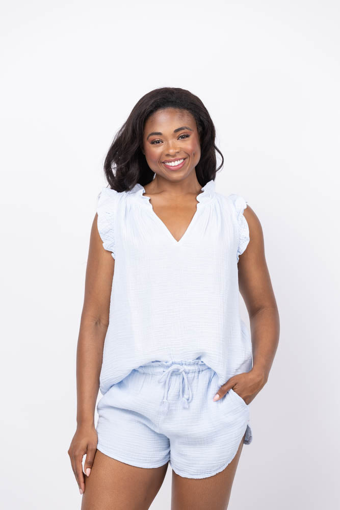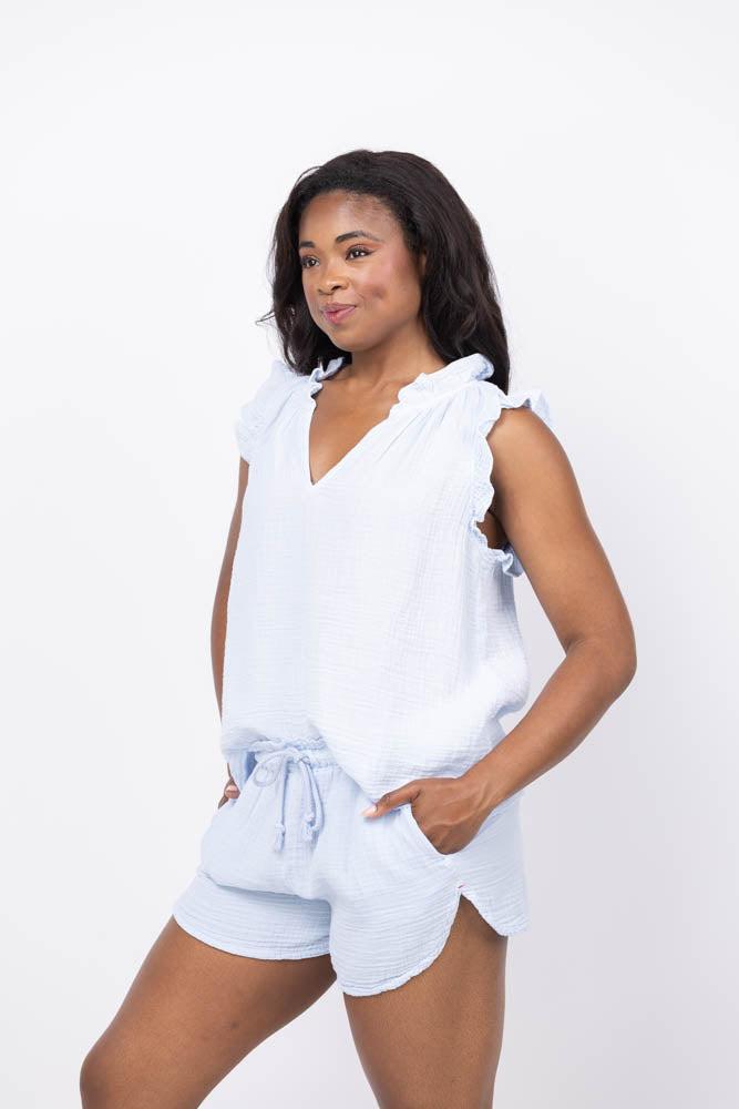 The XiRENA Bex Top in Blue Mist is crafted from washed double-faced cotton gauze, delivering a soft texture with a gently crinkled finish for added character. This bestselling popover features a deep V-neck, delicate ruffle accents, and shirring throughout, creating a flattering and comfortable fit. Perfect for elevating your casual wardrobe, this top blends timeless style with effortless comfort.