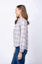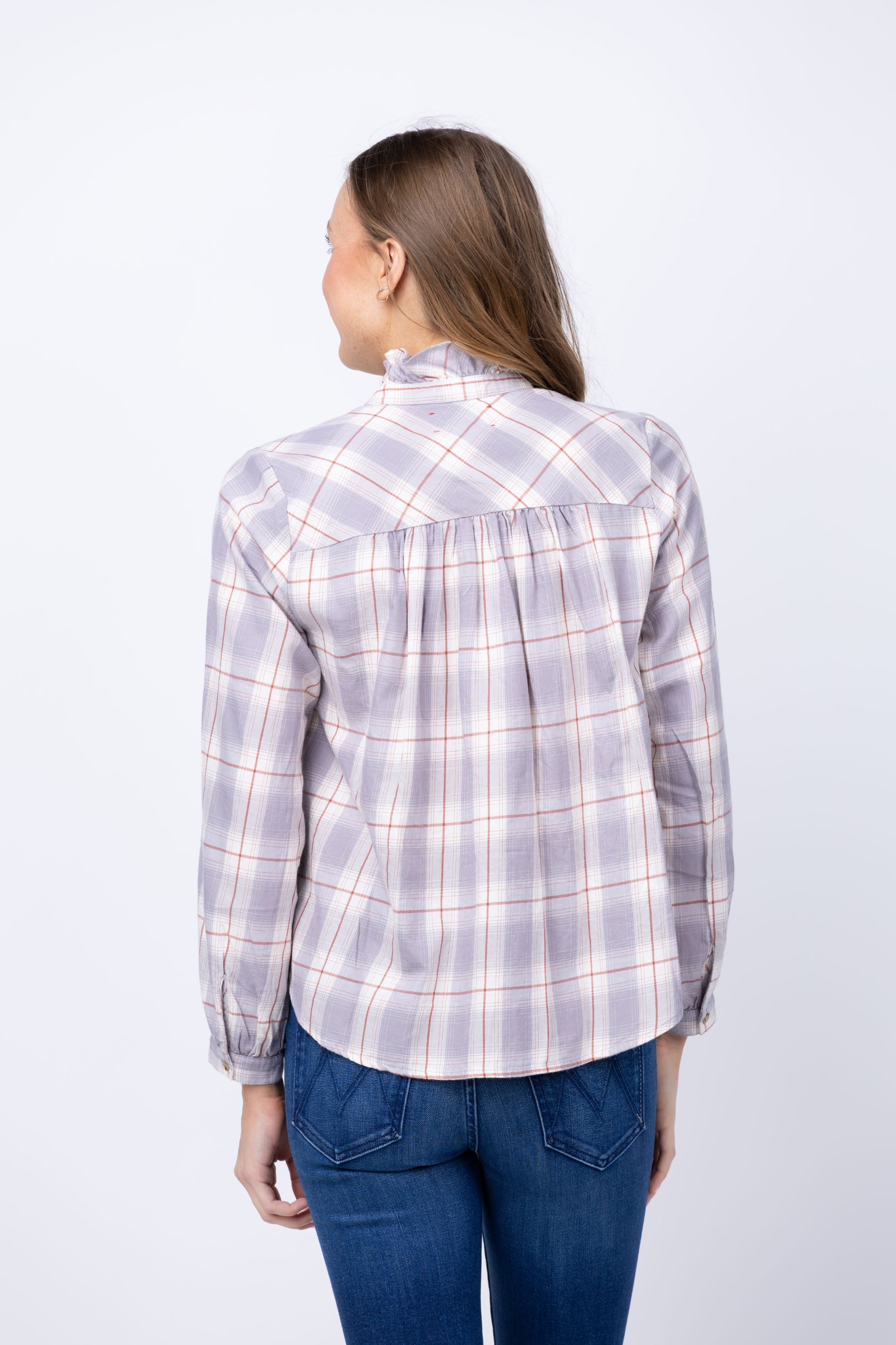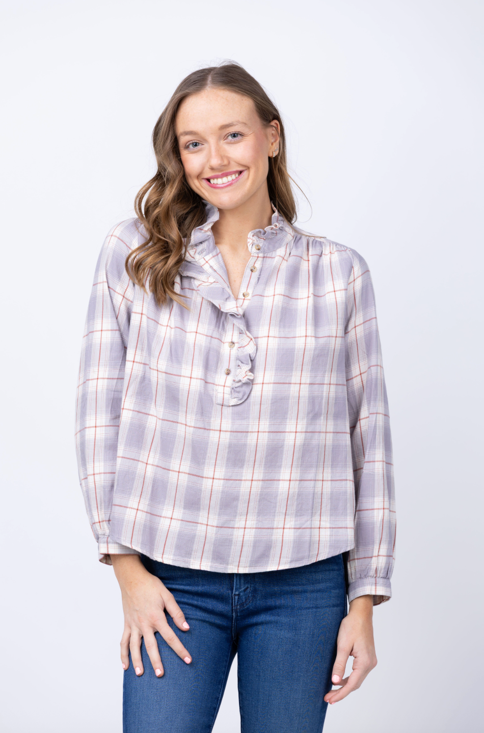 Meet Caspian, a playful take on the classic henley! This season's cotton flannel plaid version brings serious style with ruffled details dancing across the neckline and front placket. The shirring at the sleeves, front, and back creates beautiful texture and movement, while the high-low hem adds an unexpected twist. Cozy, charming, and anything but ordinary—Caspian is ready to become your new favorite layering piece.