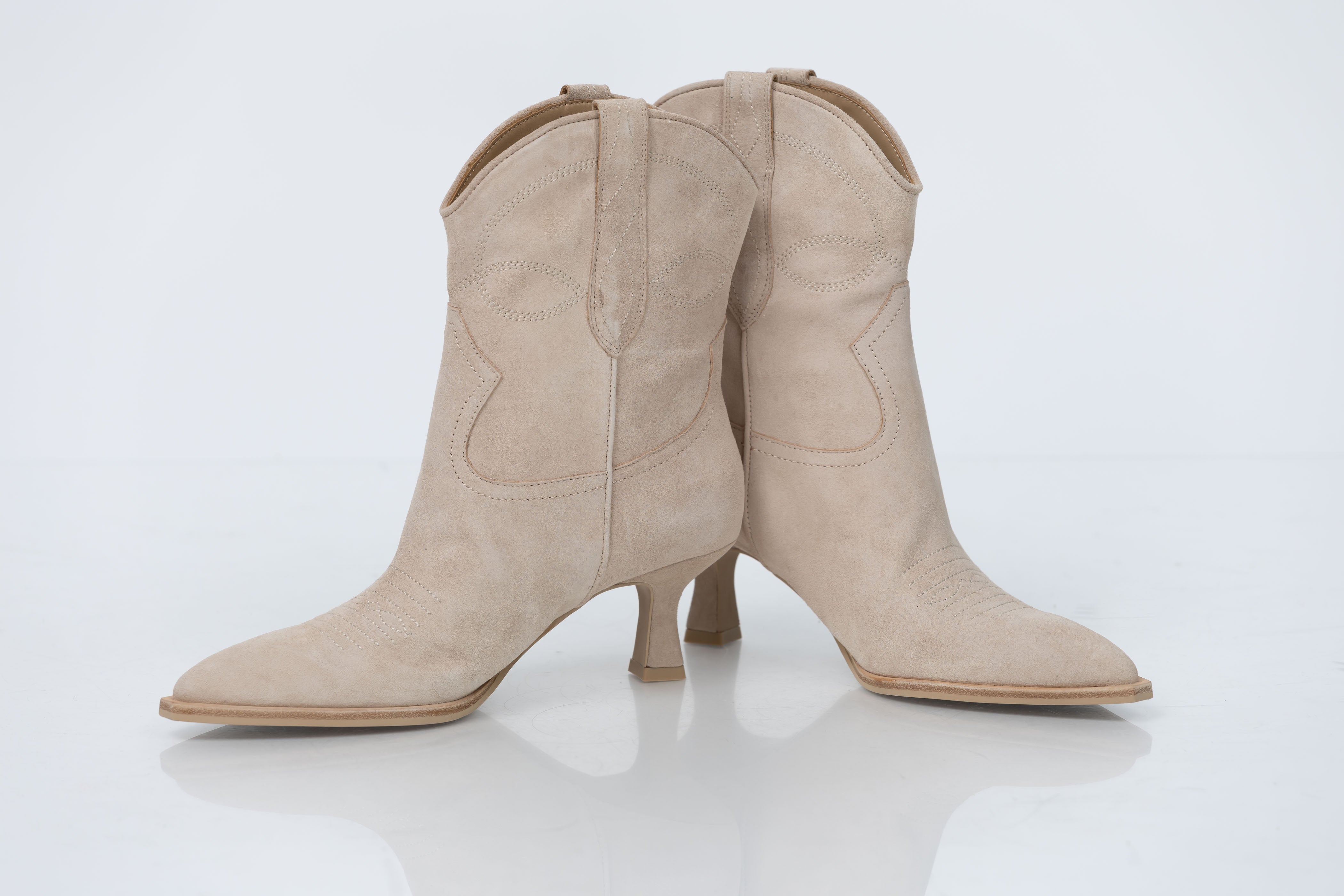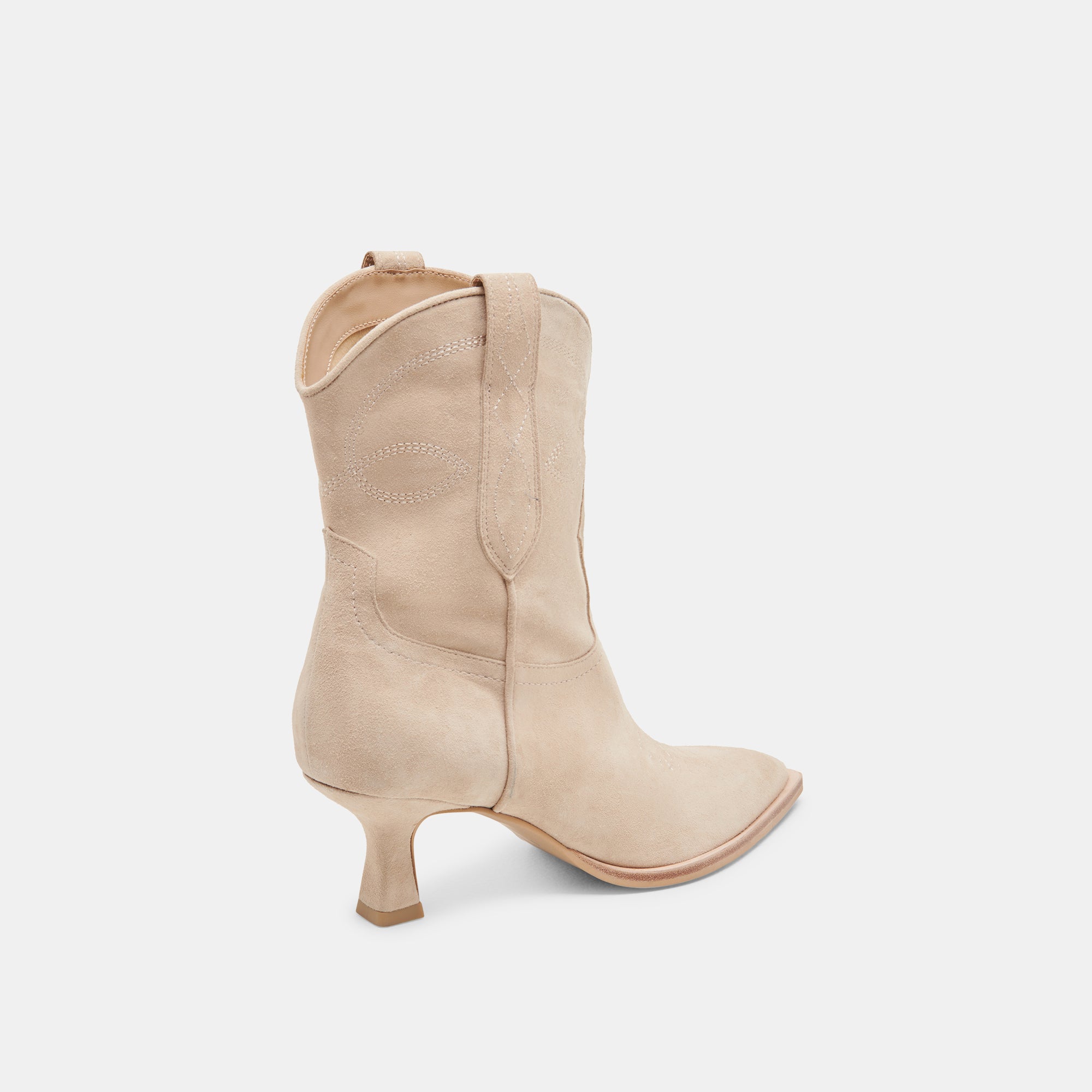 Elevate your western style with the Dolce Vita Angel Boots in Dune. Unmistakable stitching, pull tabs, and a pointed toe blend modern and traditional elements, while the sculptural kitten heel adds a touch of elegance. Crafted with sustainable materials, this mid-calf boot comes in statement and neutral colors.