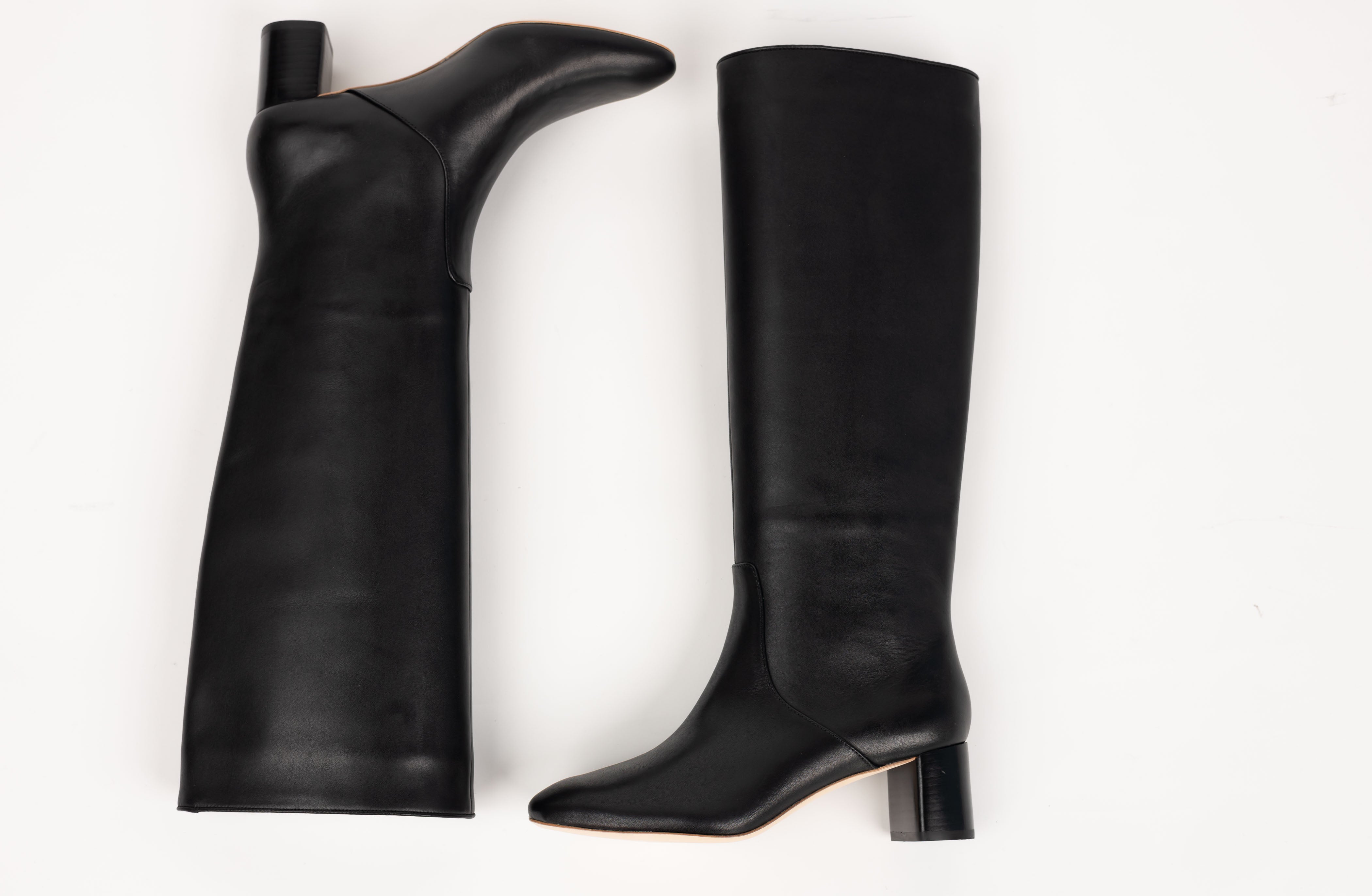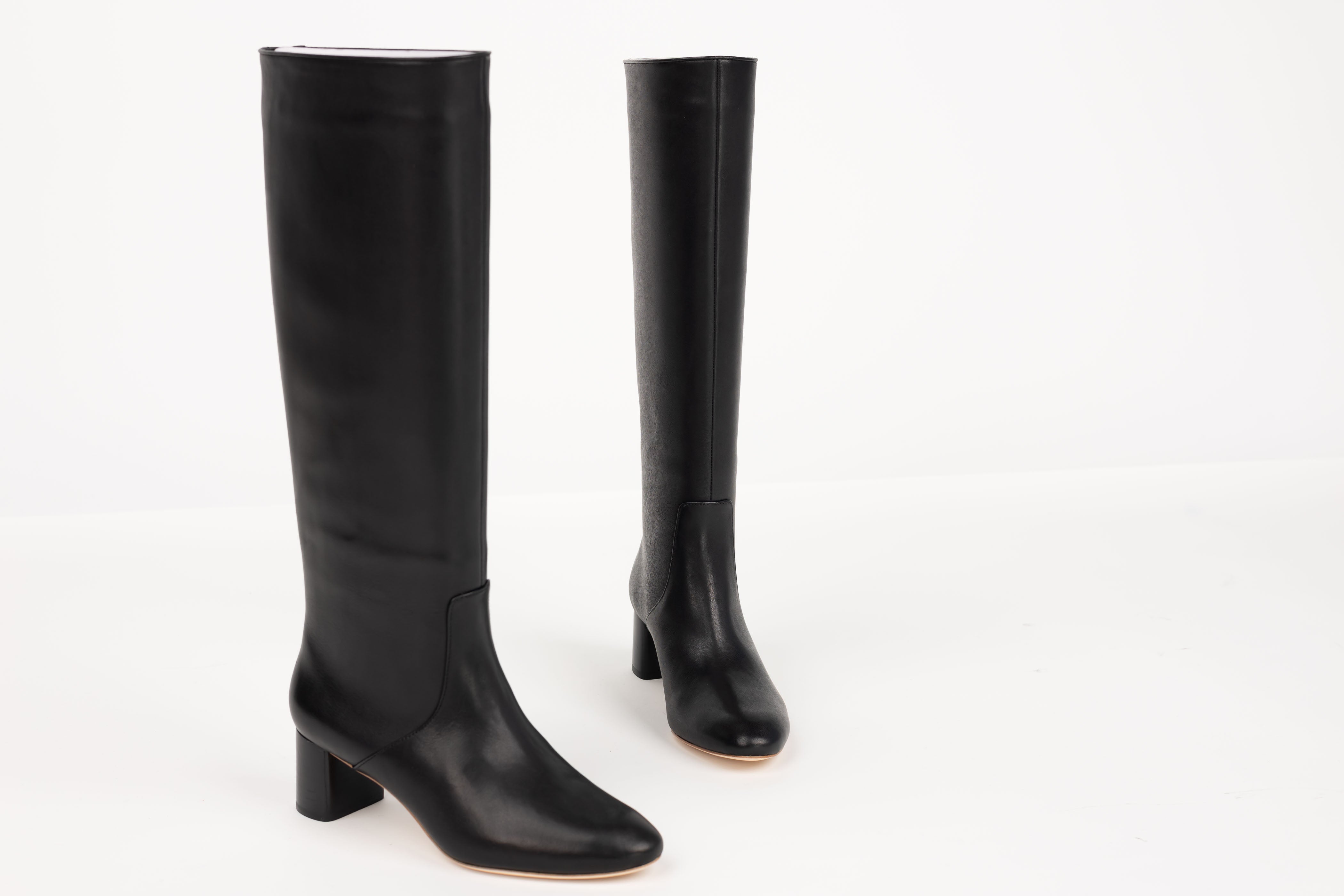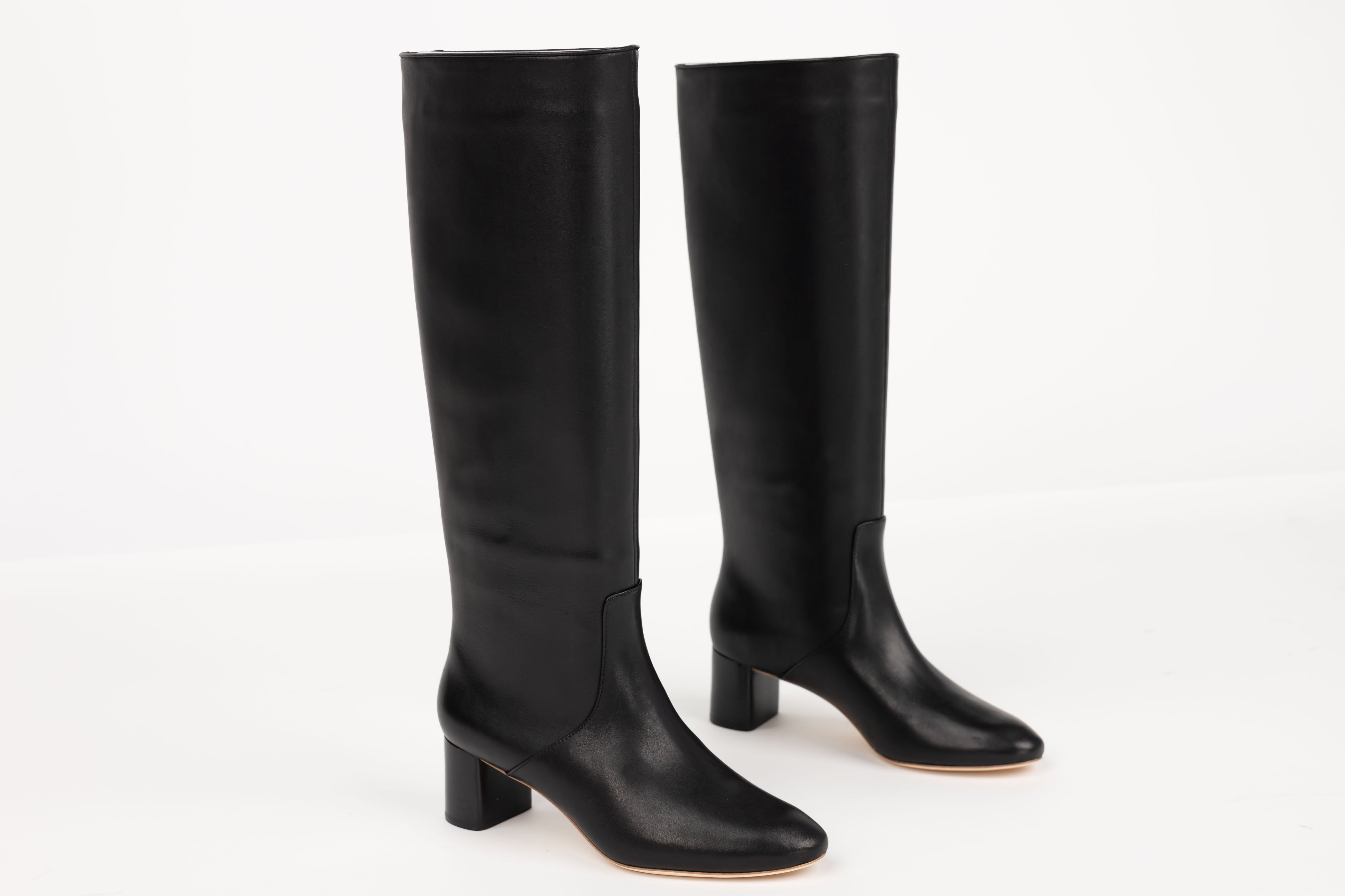 Tall shaft boot with mid-heel in black soft calf leather. Padded footbed with gold stamped logo. Almond toe, pulls on. 2 inch heel.