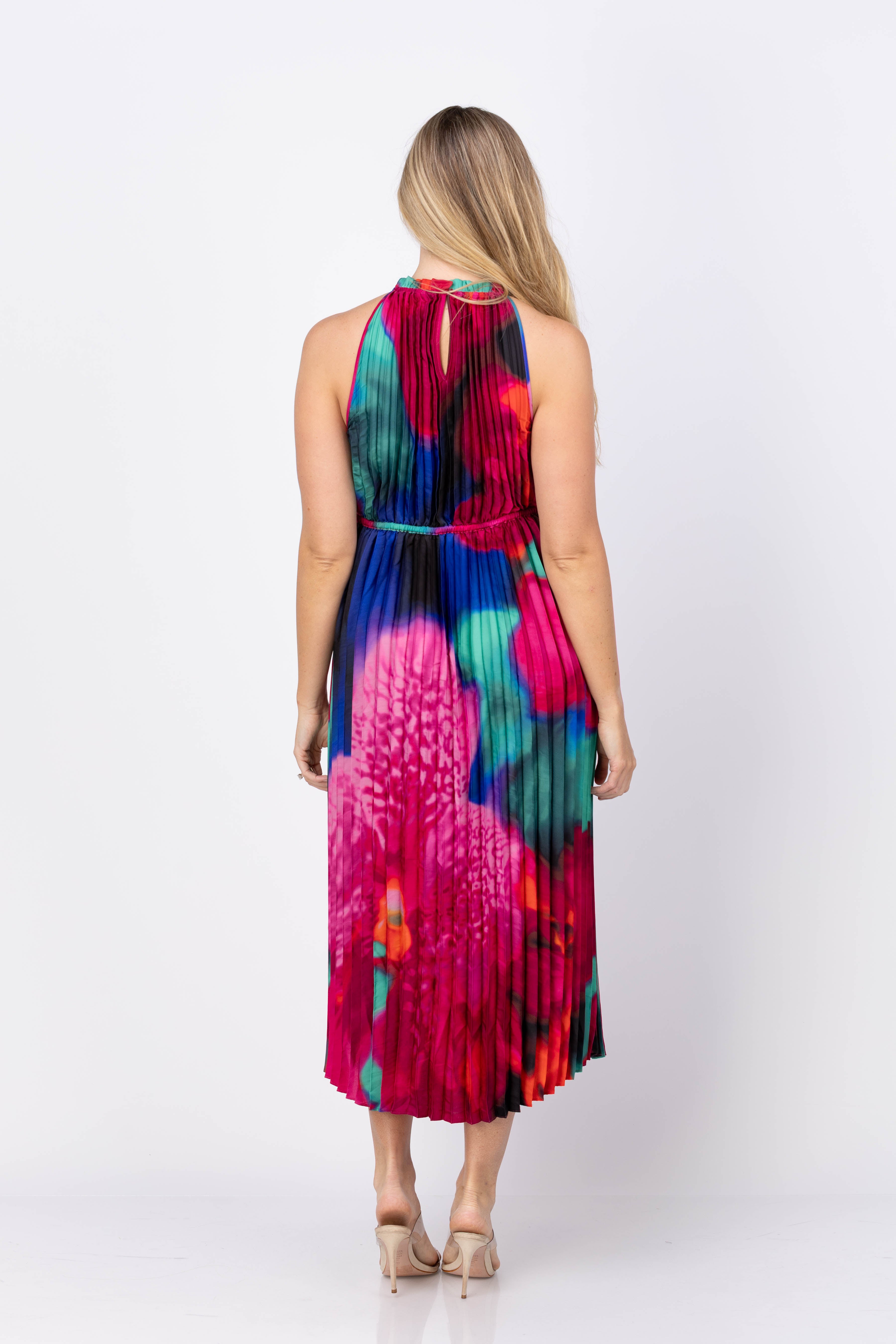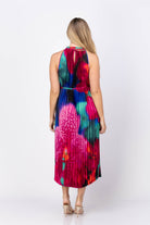 The Caballero Collection Jayce Dress in Blur Iris Bloom offers a graceful midi-length silhouette crafted from 100% polyester for comfortable wear. Its halter neckline and allover pleats create a modern, elegant look that flows beautifully with every step. The thin elastic waistband provides subtle shaping, while the side slit adds an airy, effortless vibe. Featuring a dreamy Blur Iris Bloom print with oversized magenta and purple florals against deep teal and sapphire blue, this dress brings a soft, watercolor-like charm to your wardrobe. Perfect for making a striking yet refined statement.