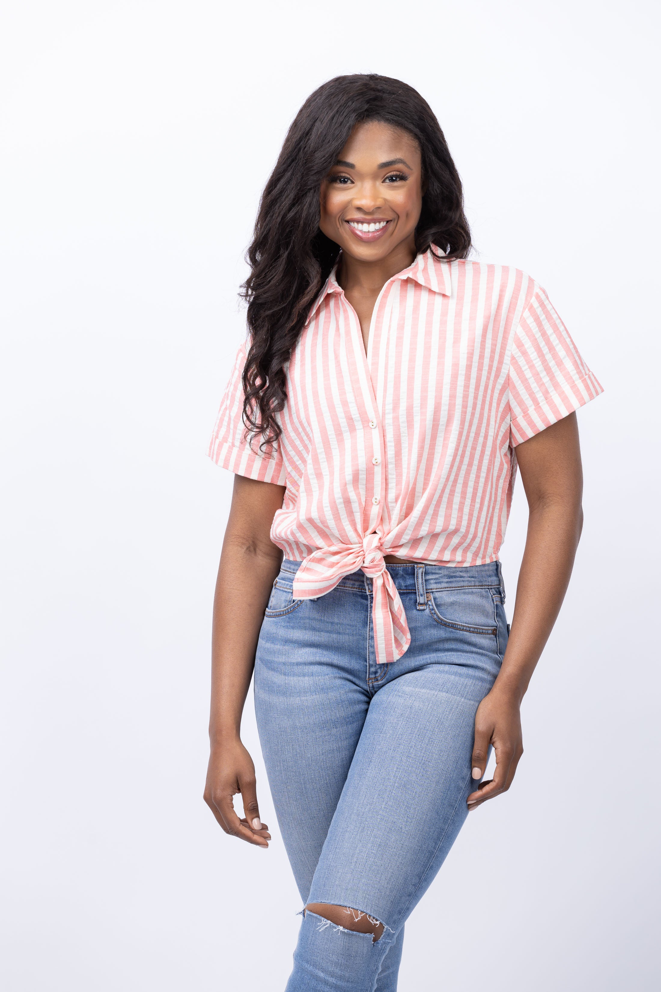 Introducing our beautiful Cara Cara Asbury Top in Ivory Pink Stripe Seersucker. This reimagined classic short sleeve button up adds an extra dose of ease and glamour to an everyday basic. With a button opening, cuffed sleeves, and a front tie bow detail, you'll feel effortlessly stylish and comfortable. Pairs perfectly with the Cara Cara Kayla Skirt!