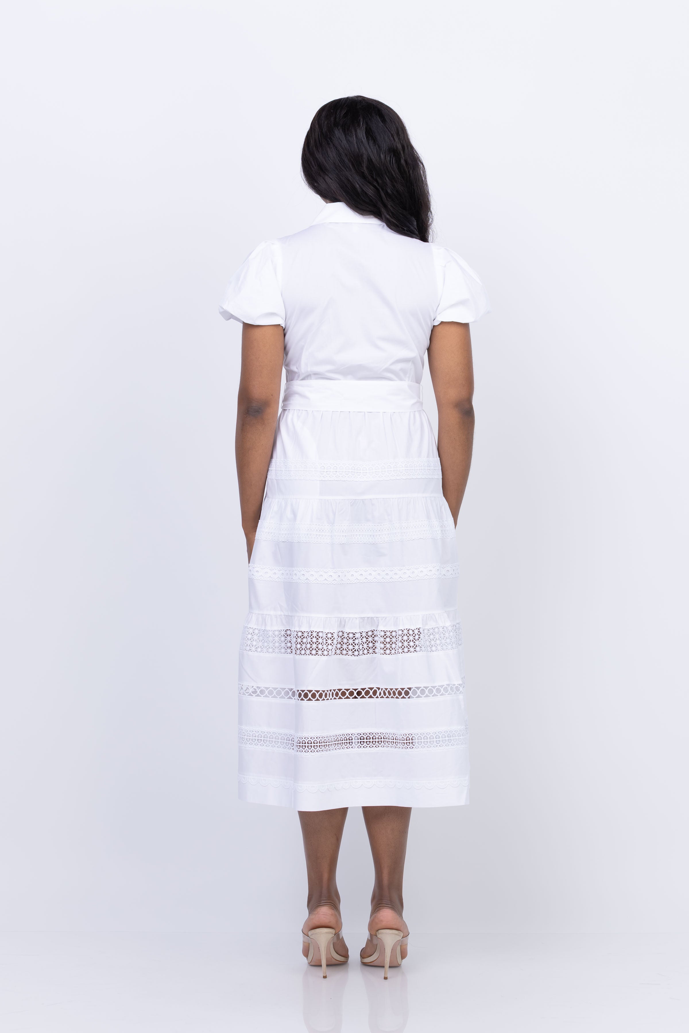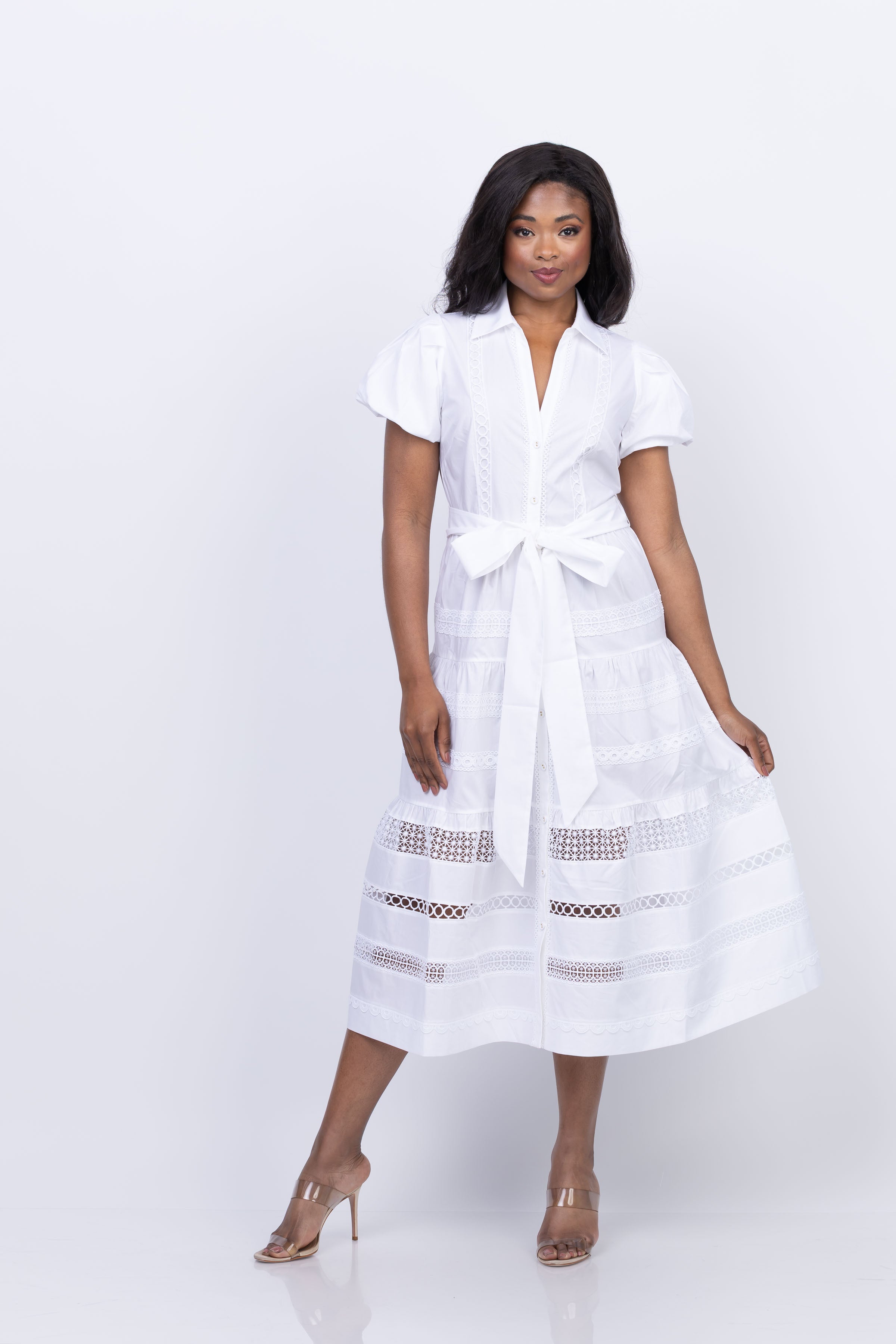 Elevate your style with the Cara Cara Mardi Dress in White! This midi shirtdress features romantic lace inserts and a tiered skirt for a feminine touch. Stay practical with functional pockets and a self sash that cinches at the waist. The cotton voile lining and elasticated bubble sleeves add comfort to this chic design.