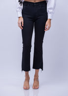 Elevate your style with Mother Denim's The Insider Crop Step Fray in Not Guilty. The high-waisted bootcut flatters your figure while the frayed step-hem adds an edgy touch. Made from stretch denim, this dark black wash is perfect for any occasion. Upgrade your denim game now!
