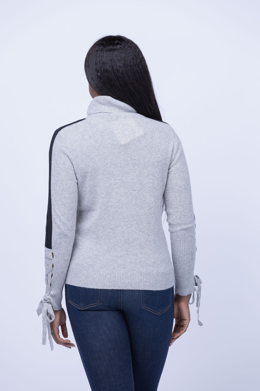 Stay cozy and stylish with this Stitch & Needle turtleneck in grey. Crafted from luxurious cashmere, this pullover features a unique tie sleeve detail that adds a touch of modern elegance. Wear it with black leather pants or jeans for a look that's sure to turn heads. Soft, sophisticated, and fabulously fashionable.