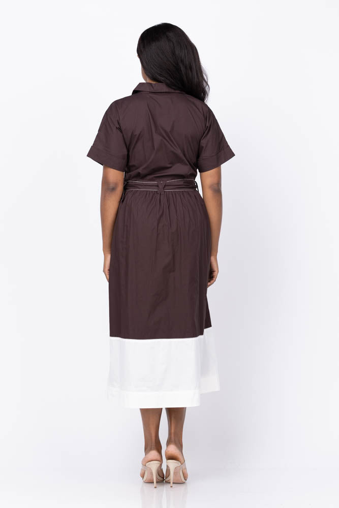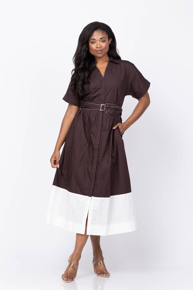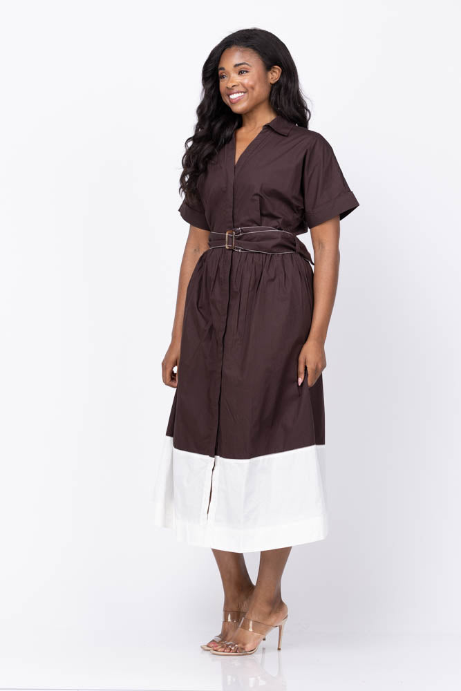 The Lilla P Collared Maxi Shirtdress in Espresso Colorblock combines soft, structured poplin with elegant design details for a polished yet effortless look. Featuring a full hidden button placket and a self-belt with a faux tortoise D-ring, it flatters with a relaxed fit on top and a fuller skirt below. Extended cuffed sleeves add a touch of ease, while subtle color-blocking enhances its fall-ready style. Fully lined for comfort, this dress is a versatile wardrobe staple that transitions seamlessly through the season.