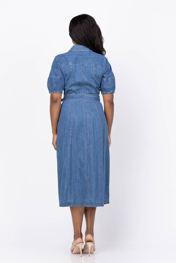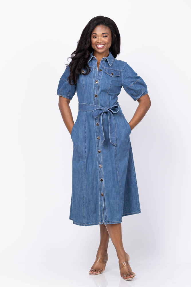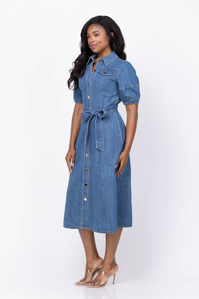 Elevate your wardrobe with the Shoshanna Mara Dress in Washed Denim. This stunning midi shirtdress features elegant short lantern sleeves and a classic shirt collar, complemented by eye-catching gold buttons down the front. The fitted bodice with pocket flaps adds subtle charm, while the separate tie belt defines your waist for a flattering silhouette. Finished with a flowing A-line skirt and convenient side seam pockets, this unlined dress combines comfort with effortless style for any occasion.