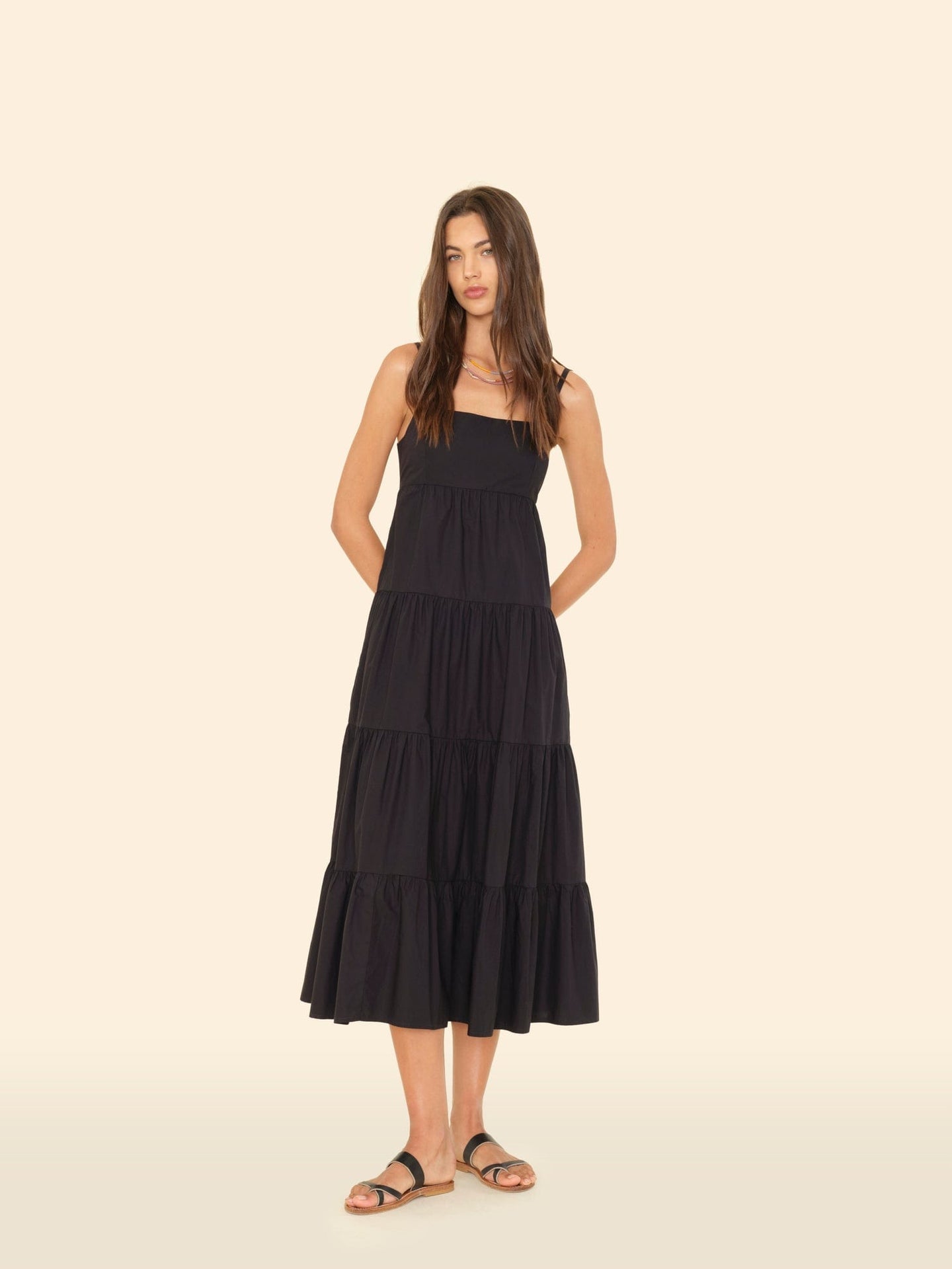 Experience effortless elegance with the XiRENA Hazel Dress in Black. Crafted from crisp paper poplin, this tiered midi sundress offers a refined, lightweight feel perfect for warm days. Its flattering square neckline, adjustable straps, and tie-back detail ensure a customizable fit, while convenient side seam pockets add practicality without sacrificing style. Elevate your wardrobe with this versatile dress that combines comfort and sophistication seamlessly.