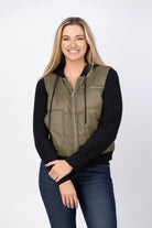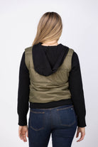 Experience the perfect blend of comfort and style with the Central Park West Brady Hooded Sweater Sleeve Jacket in Fatigue Green. This unique jacket pairs a cozy knit body with durable woven sleeves, offering a relaxed fit and zip-up front for easy wear. Functional front pockets add practicality, while the straight hemline ensures a flattering silhouette. Ideal for layering, it effortlessly combines the warmth of a sweater with the sharp look of a jacket, making it a versatile addition to your wardrobe.