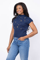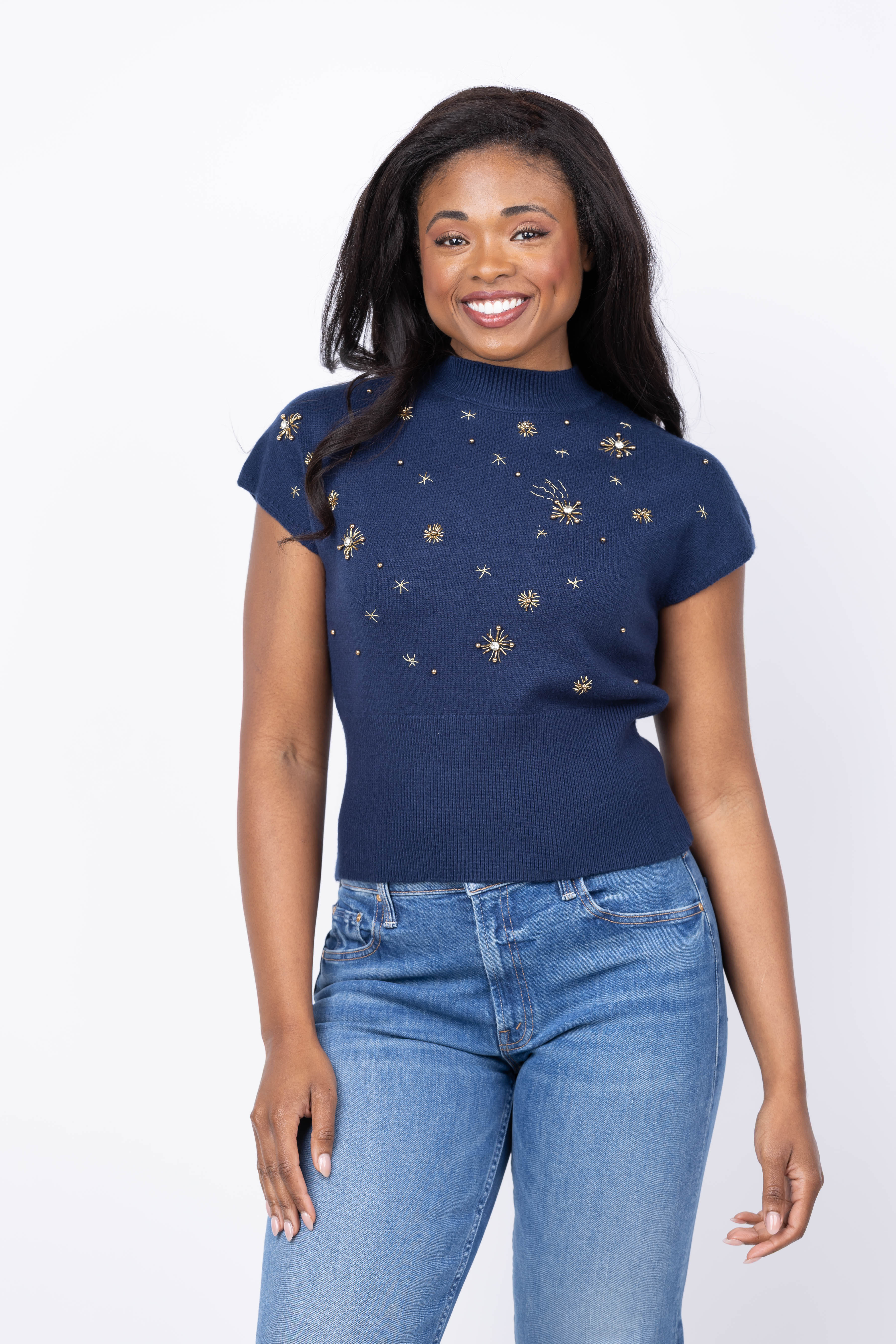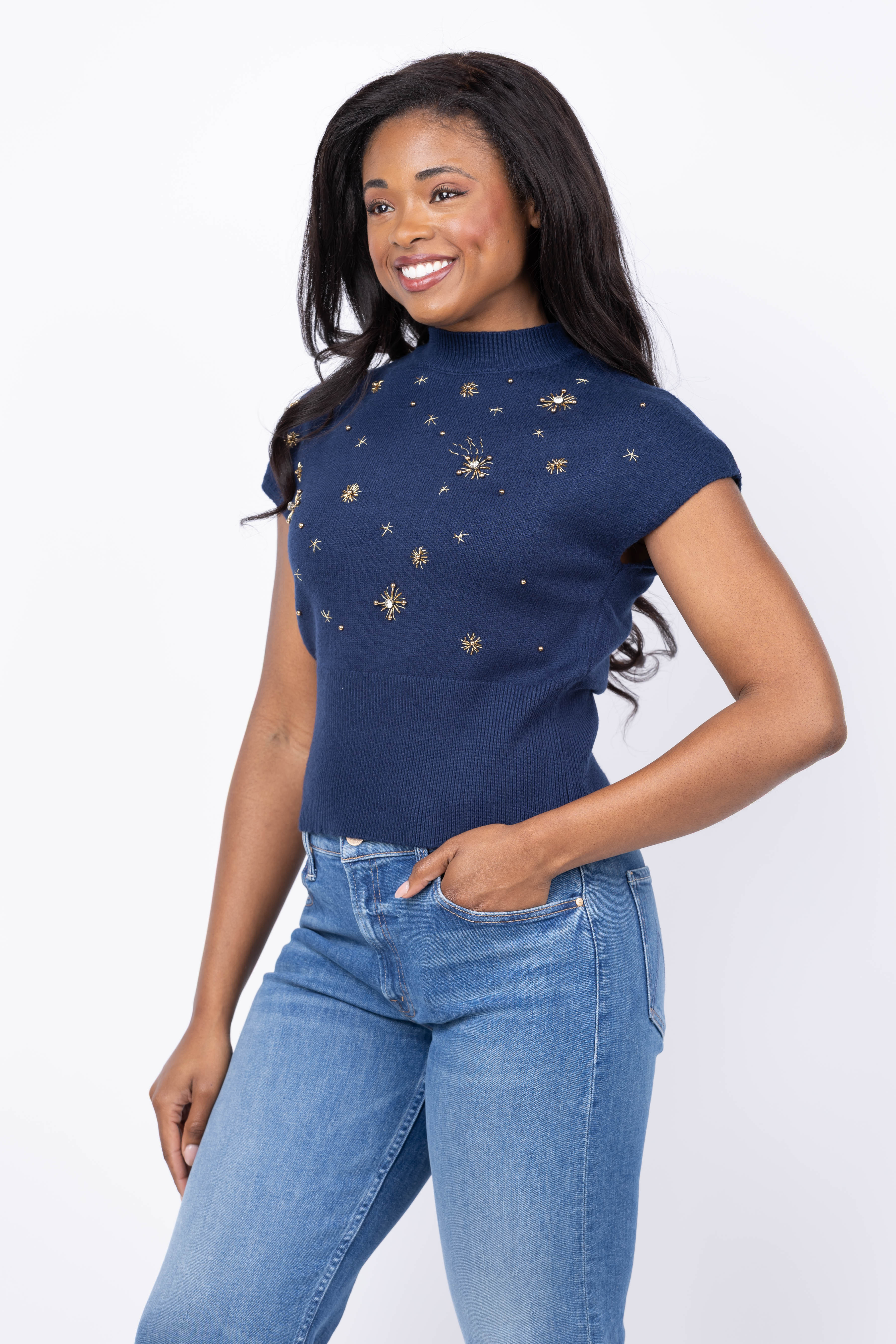 Central Park West Crystal Embellished Sleeveless Dolman Sweater in Navy