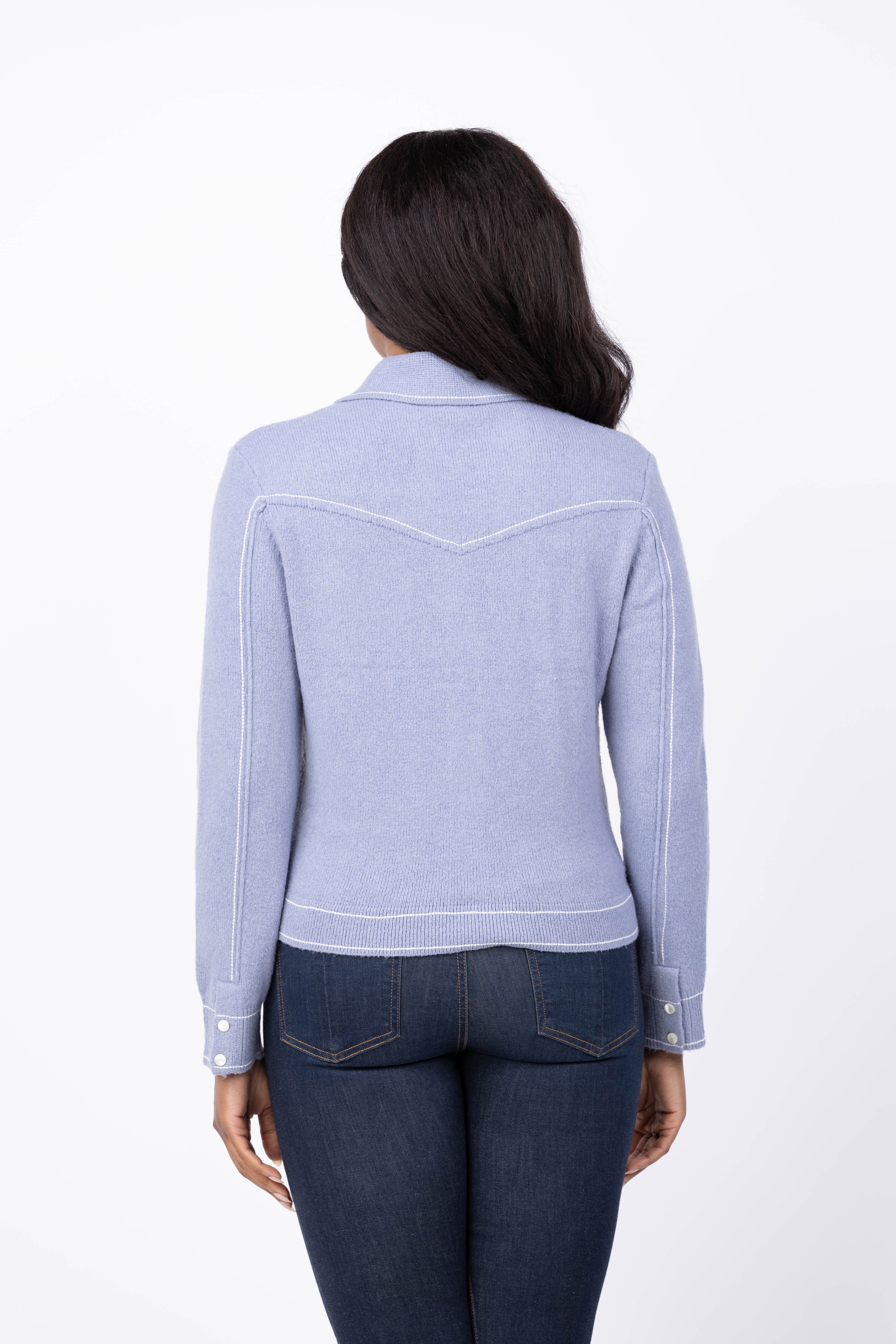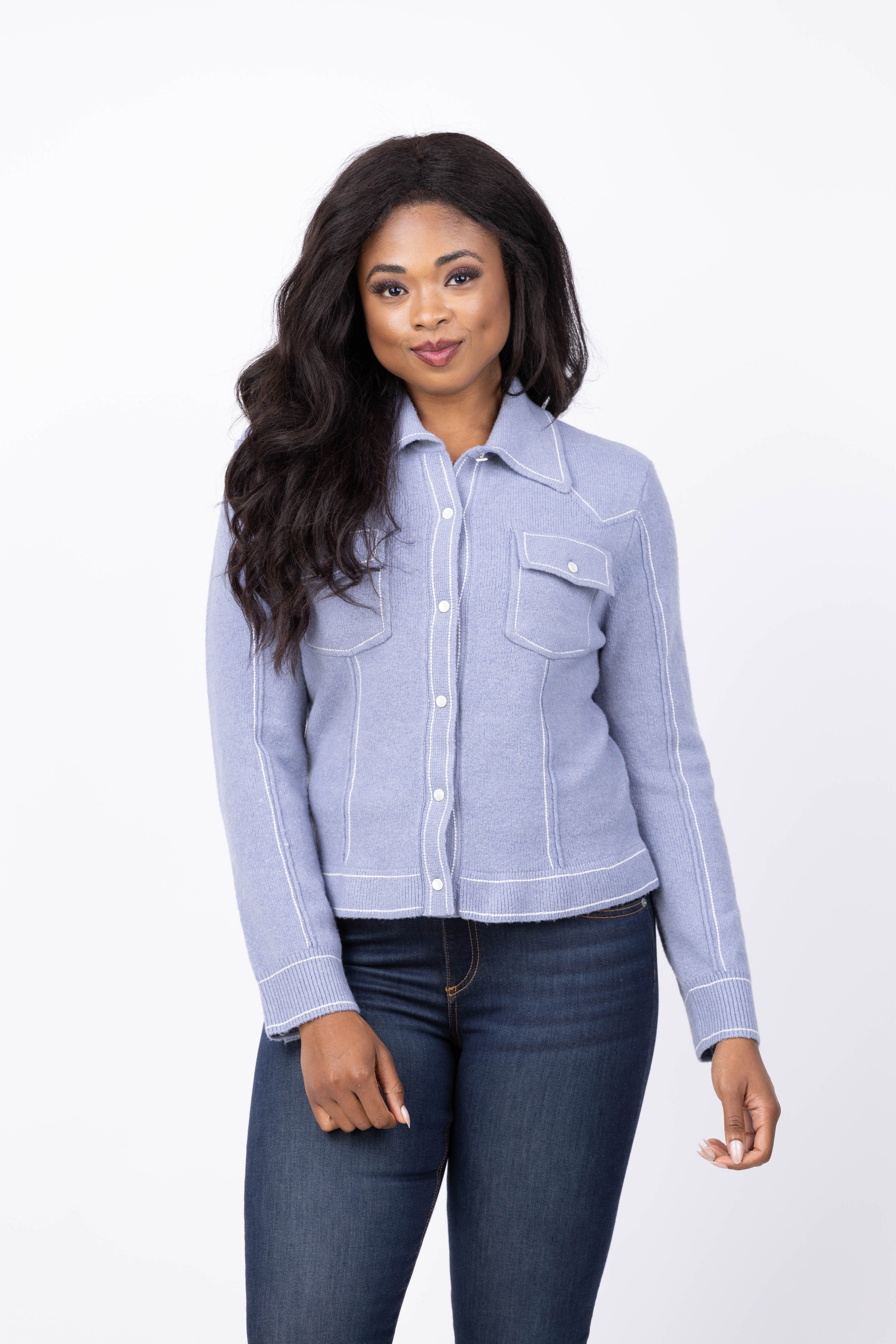 The Central Park West Dash Western Sweater Button Up in Blue offers a perfect blend of comfort and classic Western style. Featuring a pointed collar, yokes, and chest flap pockets with button closures, this knit top delivers a distinctive look. The full button-up front and long sleeves with buttoned cuffs add to its timeless appeal. Enjoy the cozy feel of a sweater combined with sharp, Western-inspired details for a versatile wardrobe staple.