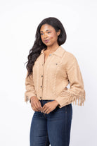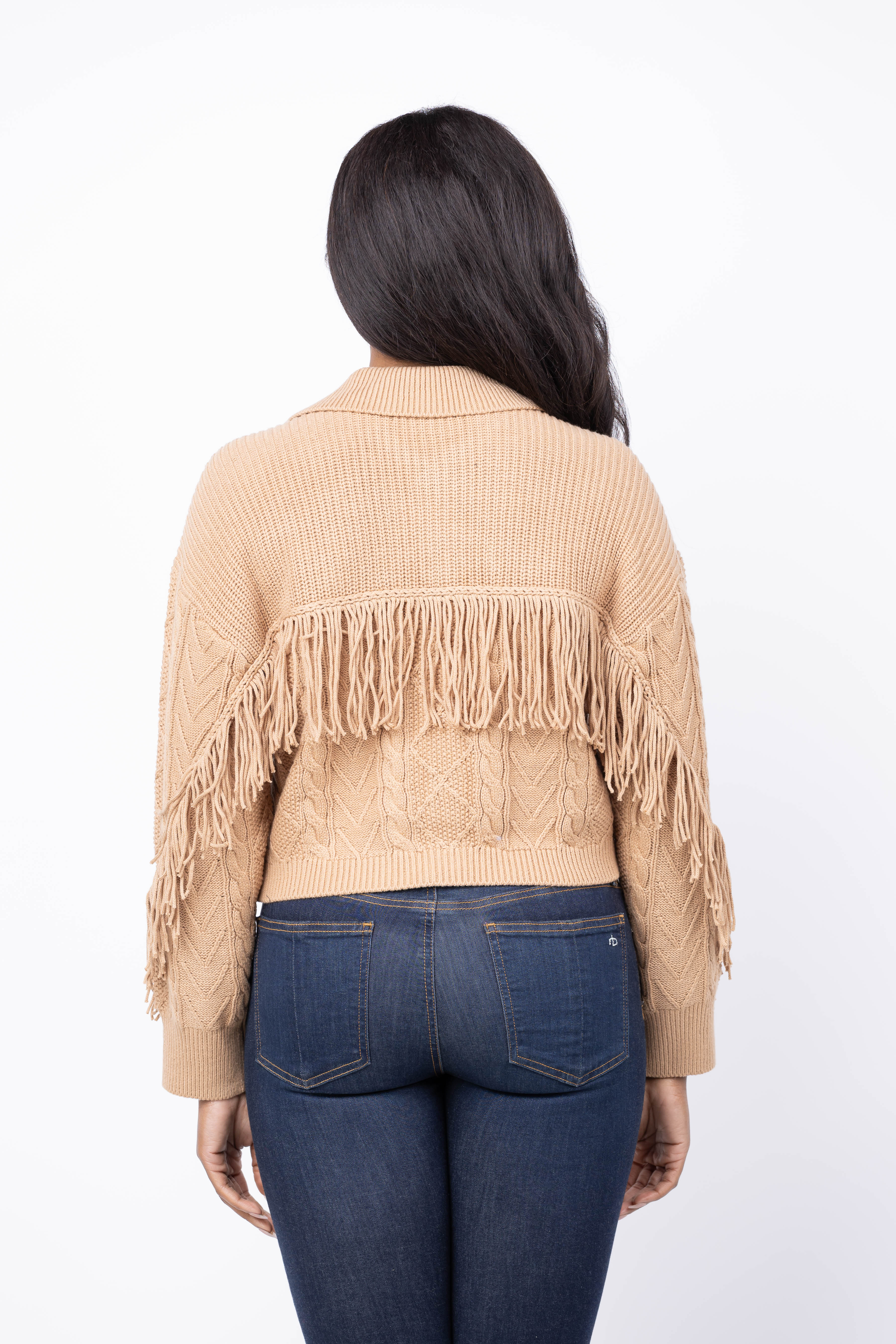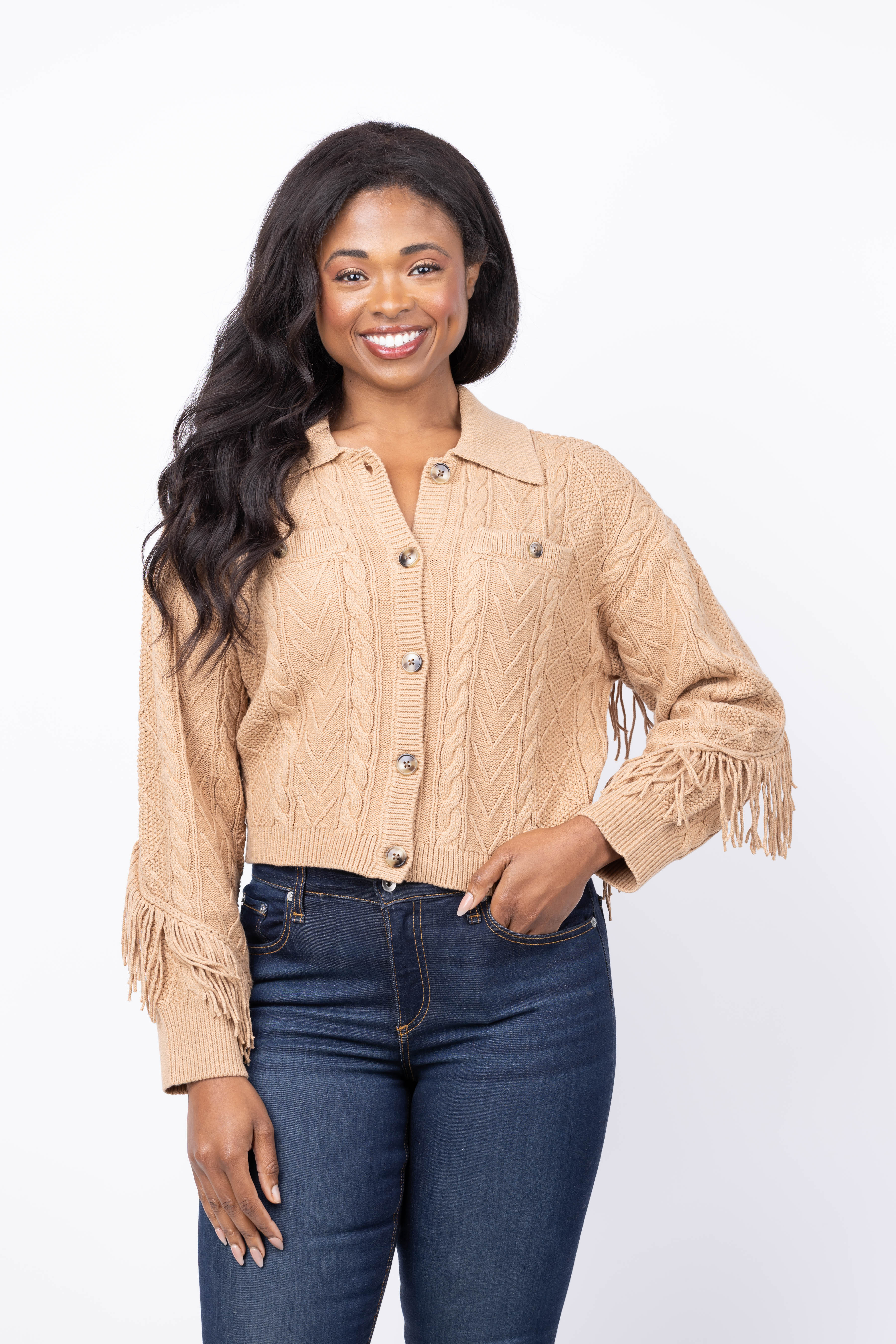 Elevate your layering game with this stunning cabled fringe sweater cardigan in rich camel. The intricate cable-knit construction delivers timeless sophistication, while delicate fringe detailing adds movement and visual interest to every wear. Perfect for transitional seasons, this versatile piece layers beautifully over basics or stands alone as a statement layer. The warm neutral tone complements any wardrobe, making it an essential investment for effortless, polished style that works from office to weekend.