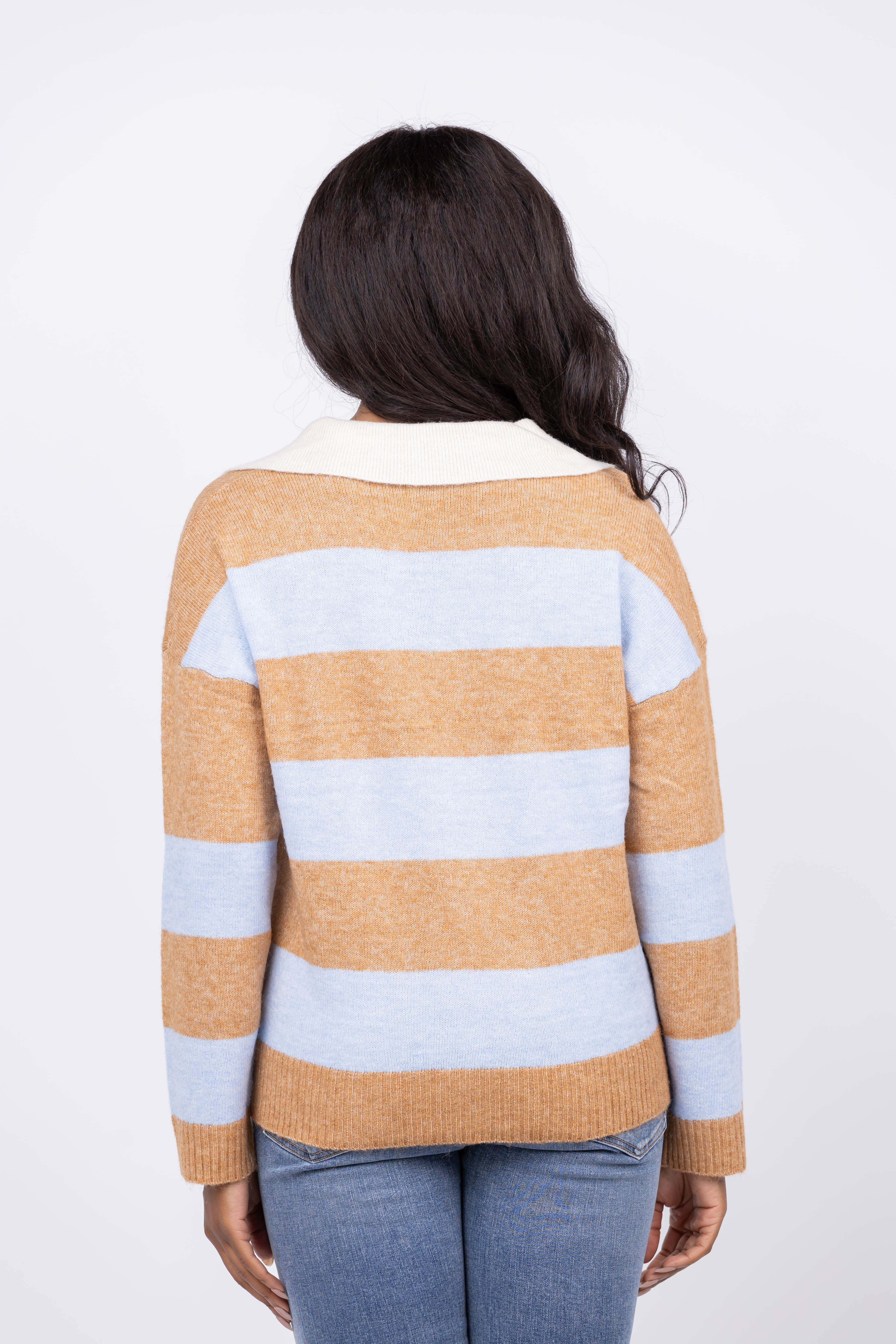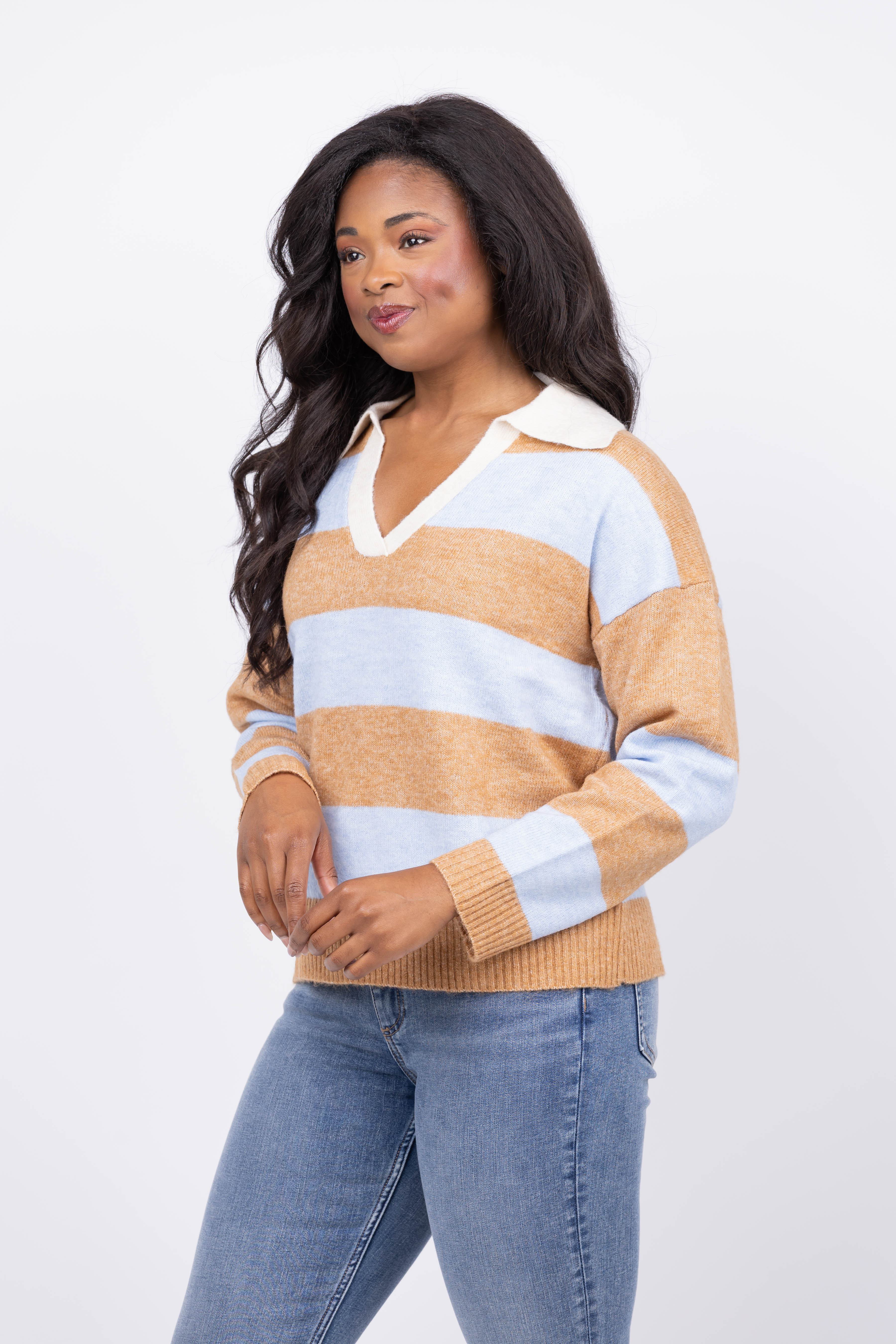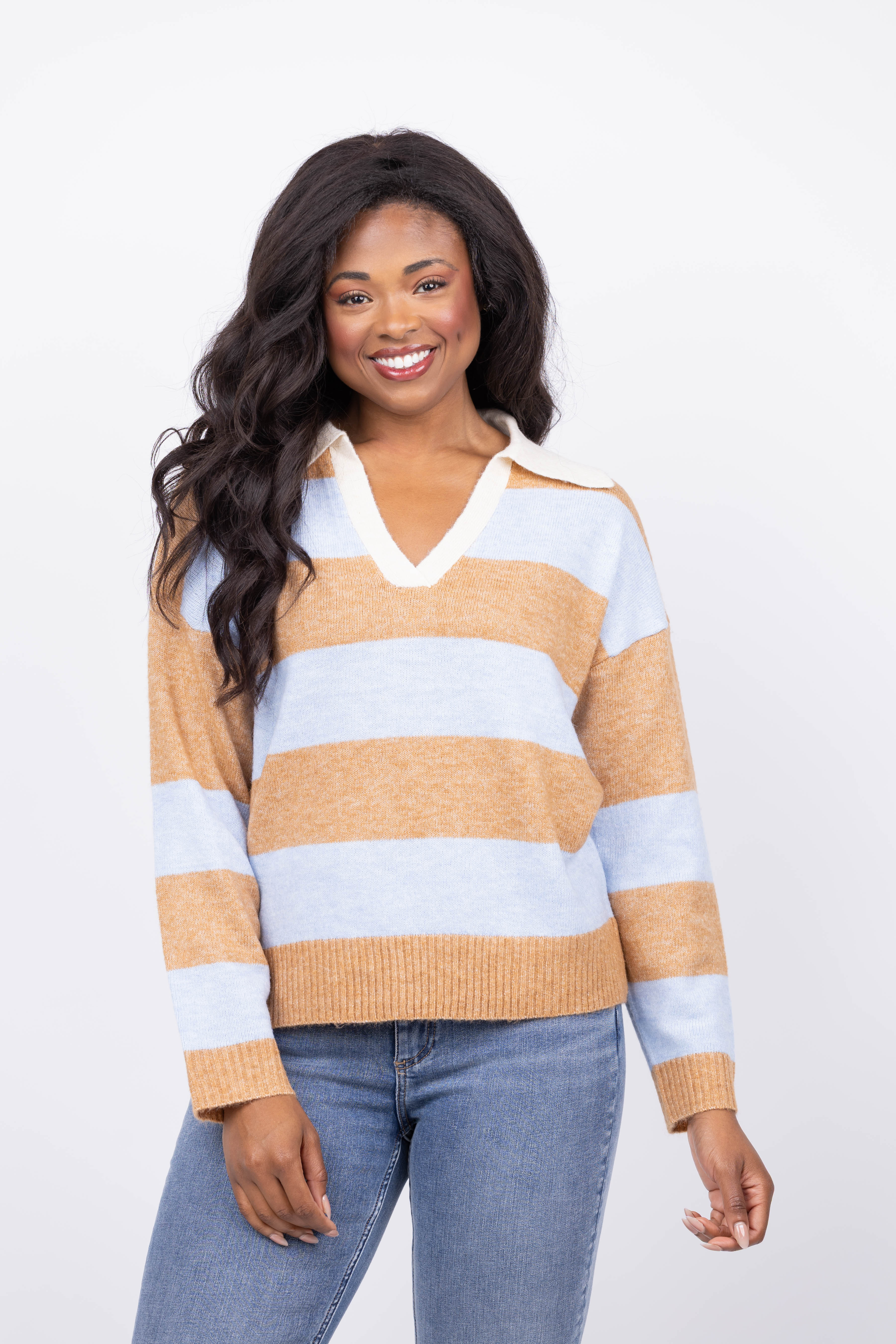 Step into casual sophistication with the Central Park West Marley Striped Rugby Sweater in Blue Oat. Made from soft knit fabric, it offers an easy relaxed fit that keeps you comfortable all day. The deep V neckline with a contrasting collar adds a refined touch, while the bold stripe design brings a playful edge to your look. Ribbed cuffs and hem provide structure, ensuring a flattering silhouette. Perfect for layering or wearing solo, this sweater combines classic style with a modern twist.
