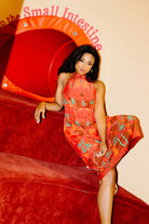 Experience the ultimate in tropical vibes with the Cara Cara Colomba Dress in Sanibel Island Pink. Featuring a high scoop neckline, elastic waistband, and open back with adjustable bow ties, this midi length dress is perfect for warm weather events or beach vacations. With a flattering A-line silhouette and functional details, it's a must-have for any fashion-forward wardrobe. Slip it on and let the compliments roll in!