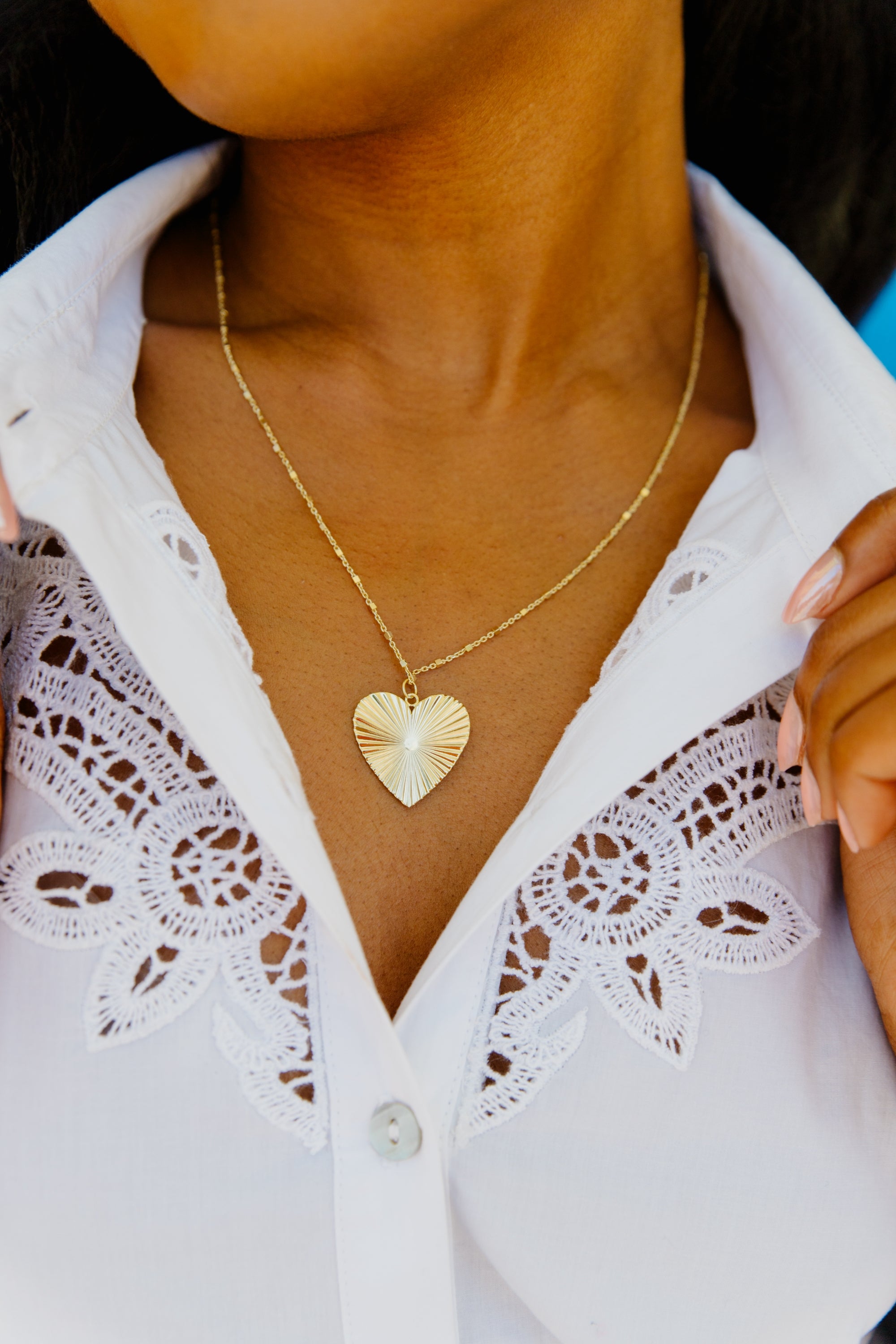 The Jennifer Zuener Sheldon Necklace captivates with its exquisite ridged, heart-shaped pendant adorned with dazzling diamonds at its center. This stunning piece doesn't just accessorize—it transforms your entire look with its radiant sparkle and elegant design. Make a statement that speaks volumes about your refined taste and elevate any outfit from ordinary to extraordinary.