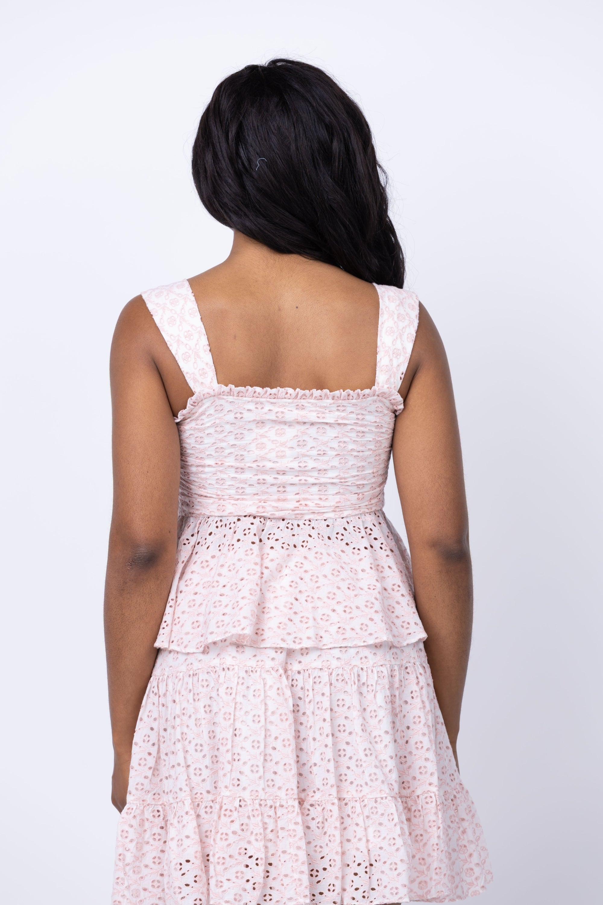 Elevate your summer wardrobe with our Mille Fleur Top in Rose Eyelet! Featuring a ruched bust for a flattering fit, wide shoulder straps for comfort, and a side zip closure for a fit and flare silhouette. Made with lightweight cotton eyelet fabric and lined through the bust for added coverage. Don't miss the adorable bow detail at the front!
