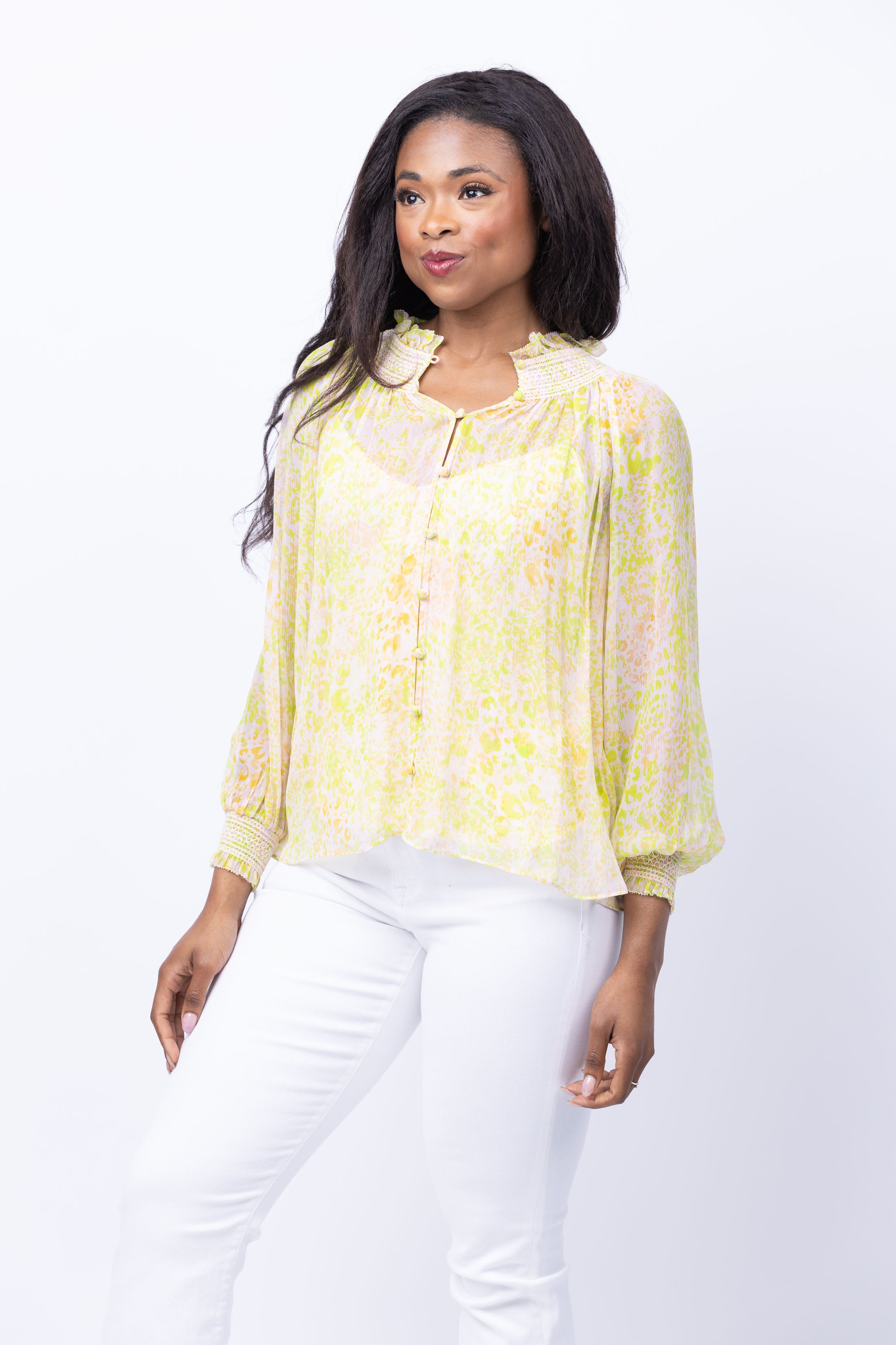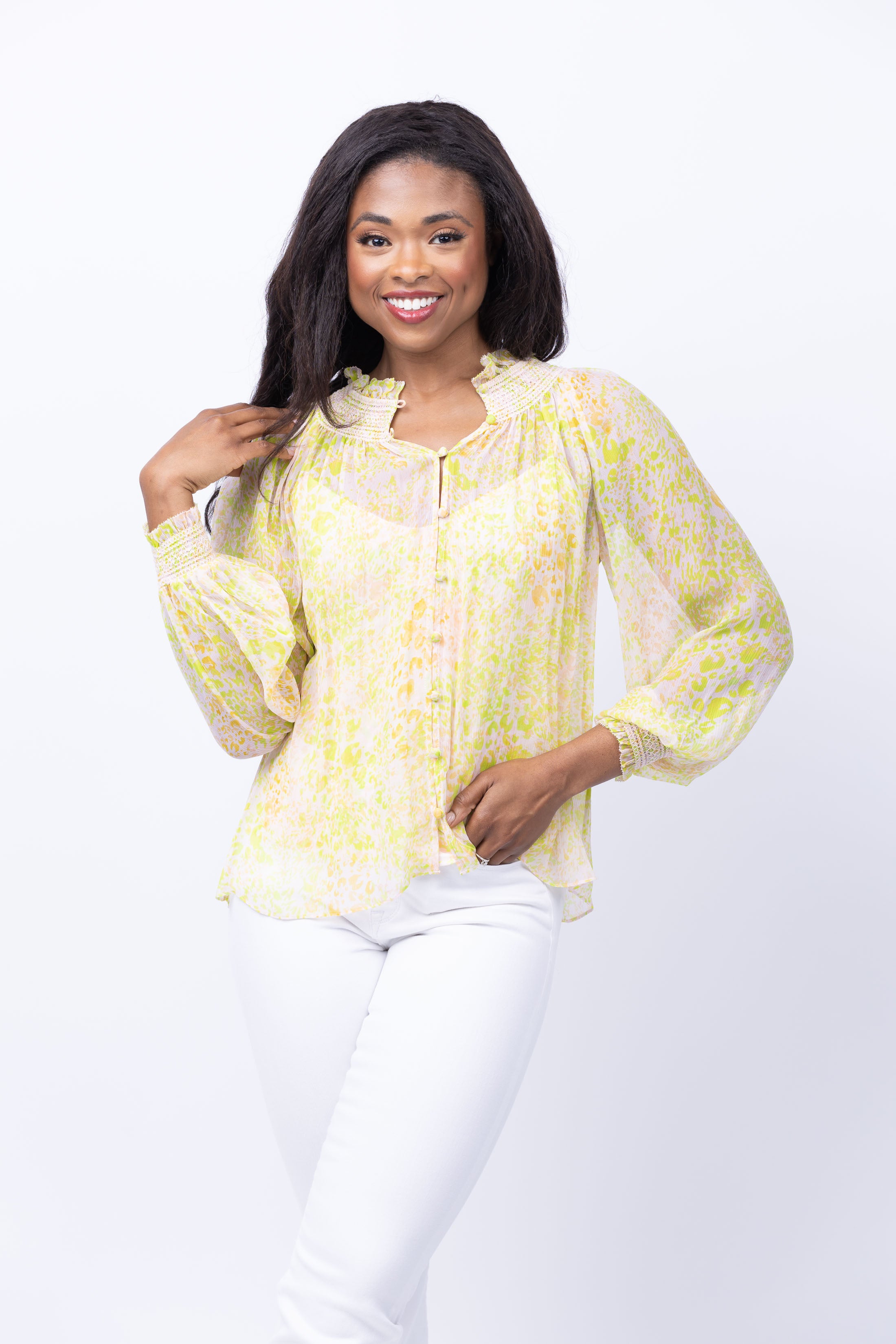 Elevate your wardrobe with the Christy Lynn Andrea Top in Lime Leopard! This stylish piece features smocked elastic details at the neck and sleeves, adding a touch of texture to your ensemble. The buttons down the front provide a chic and versatile look, while the included printed stretch poly slip adds comfort and convenience. Stand out and make a statement with this must-have top!